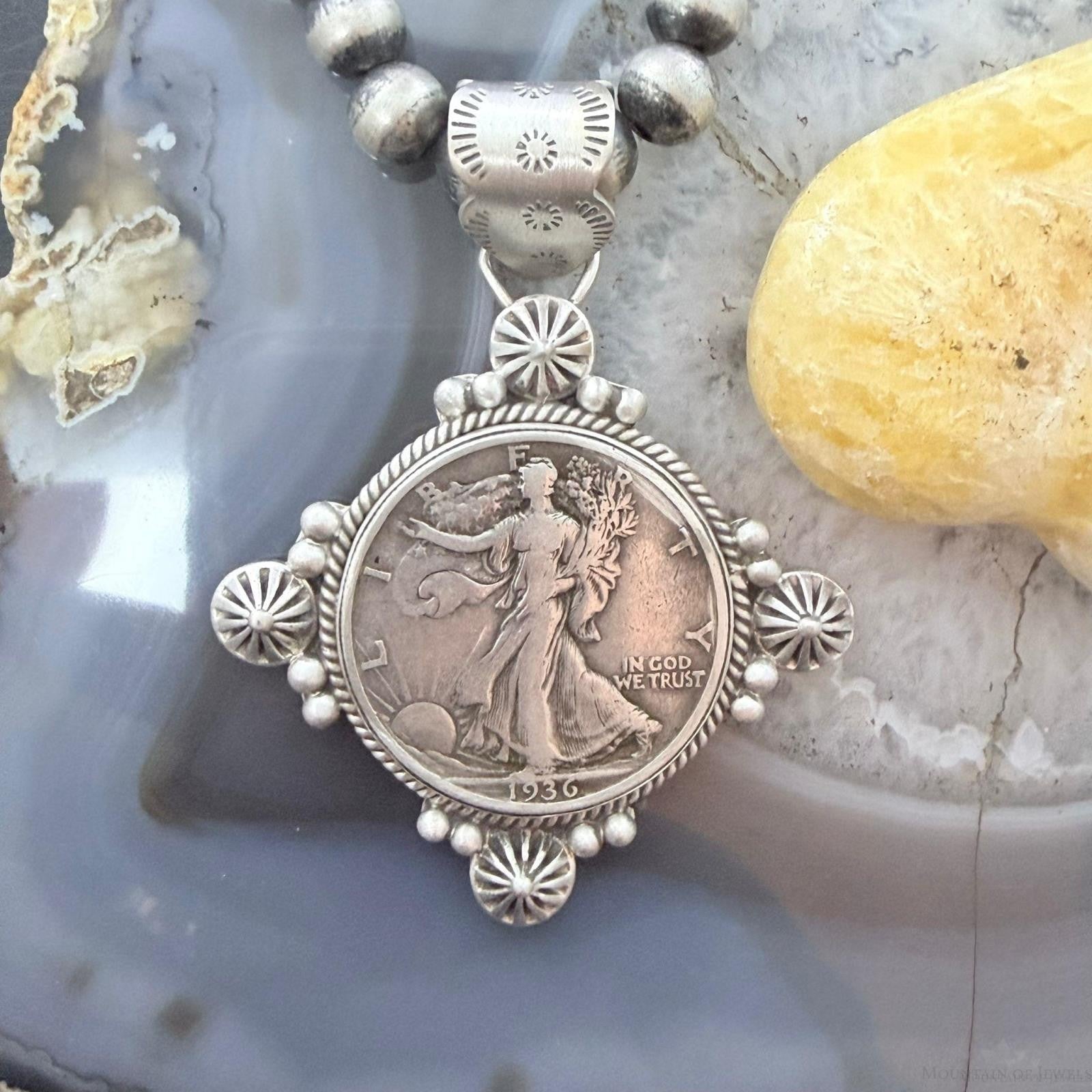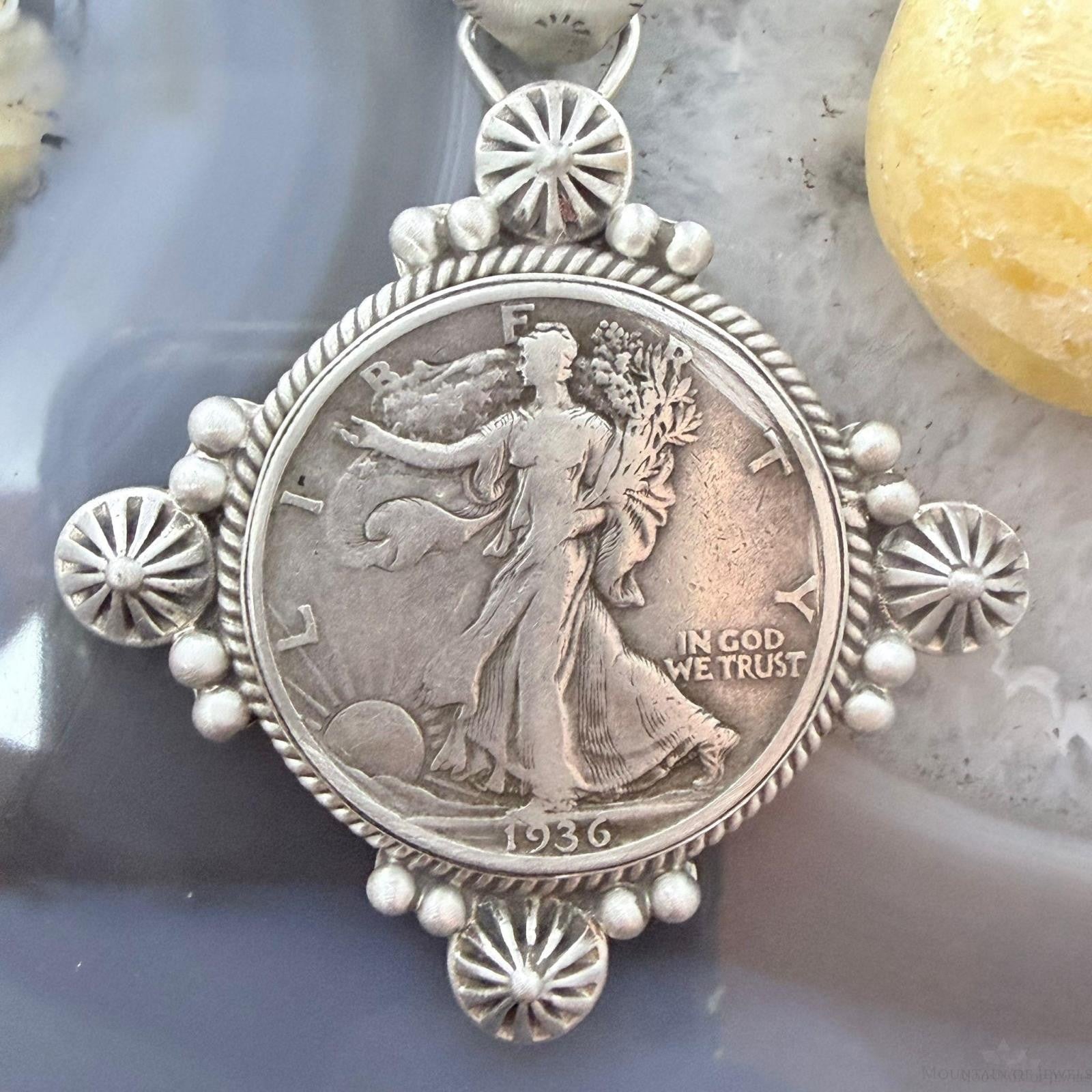 1936 Genuine 90% Silver US Walking Liberty Half Dollar Decorated Stamped Bail Sterling Silver Unisex Pendant.