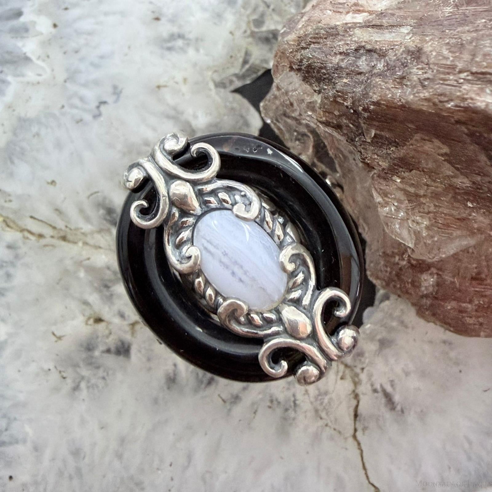 Carolyn Pollack Sterling Silver Black Agate & Blue Lace Agate Ring Size 8.25 For Women