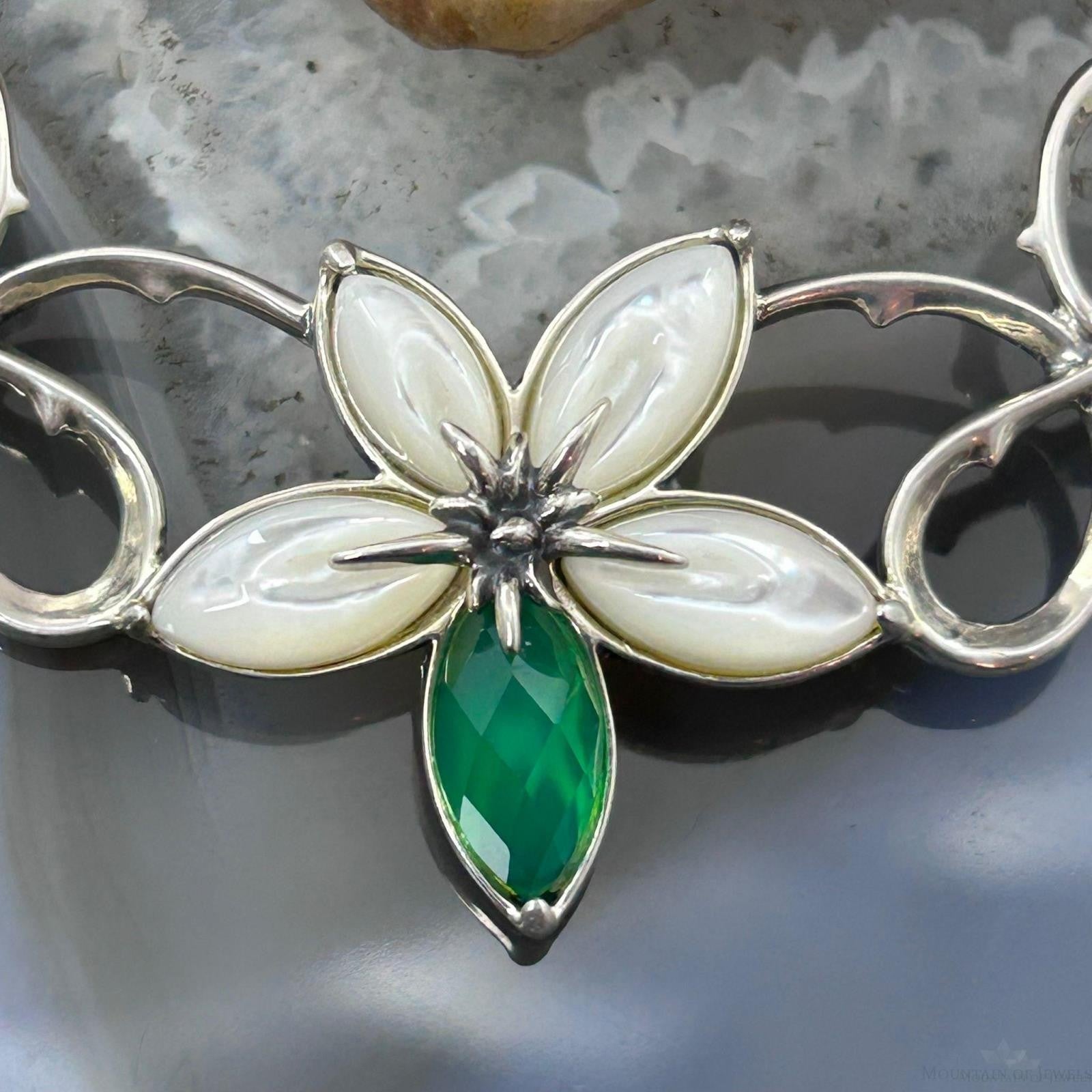 Carolyn Pollack Sterling Freshwater Pearl Necklace and 3 Mother Of Pearl and Green Chalcedony Flower, For Women.