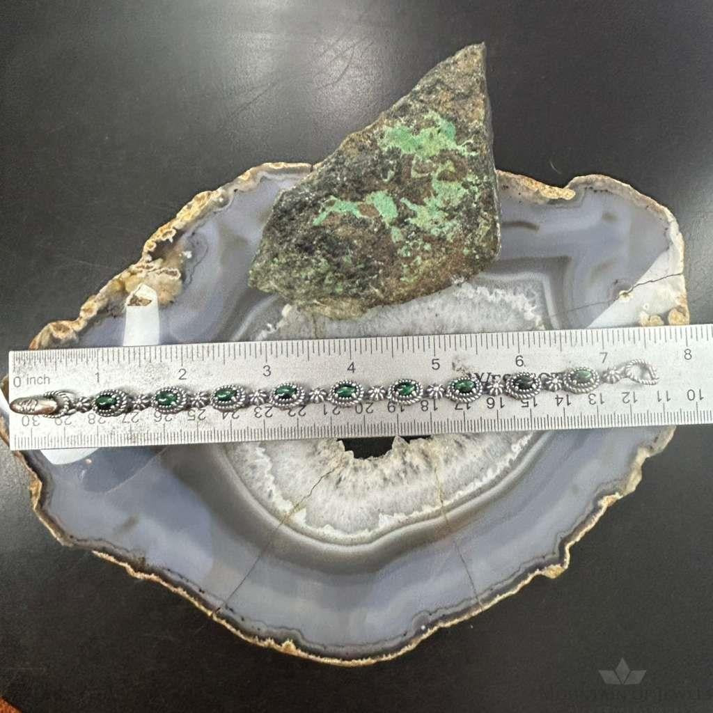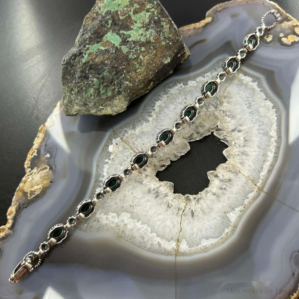 Lovely Carolyn Pollack Vintage Sterling Silver 9 Oval Malachite Cabochons Decorated Foldover Clasp Link Bracelet For Women.