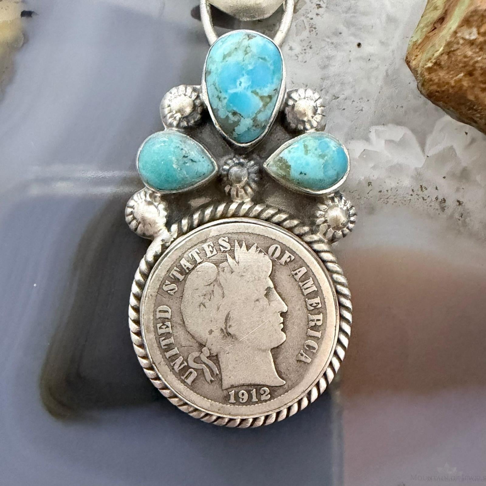 Genuine 1912 90% Silver Barber Head Dime Coin Mohave Turquoise Unisex Pendant