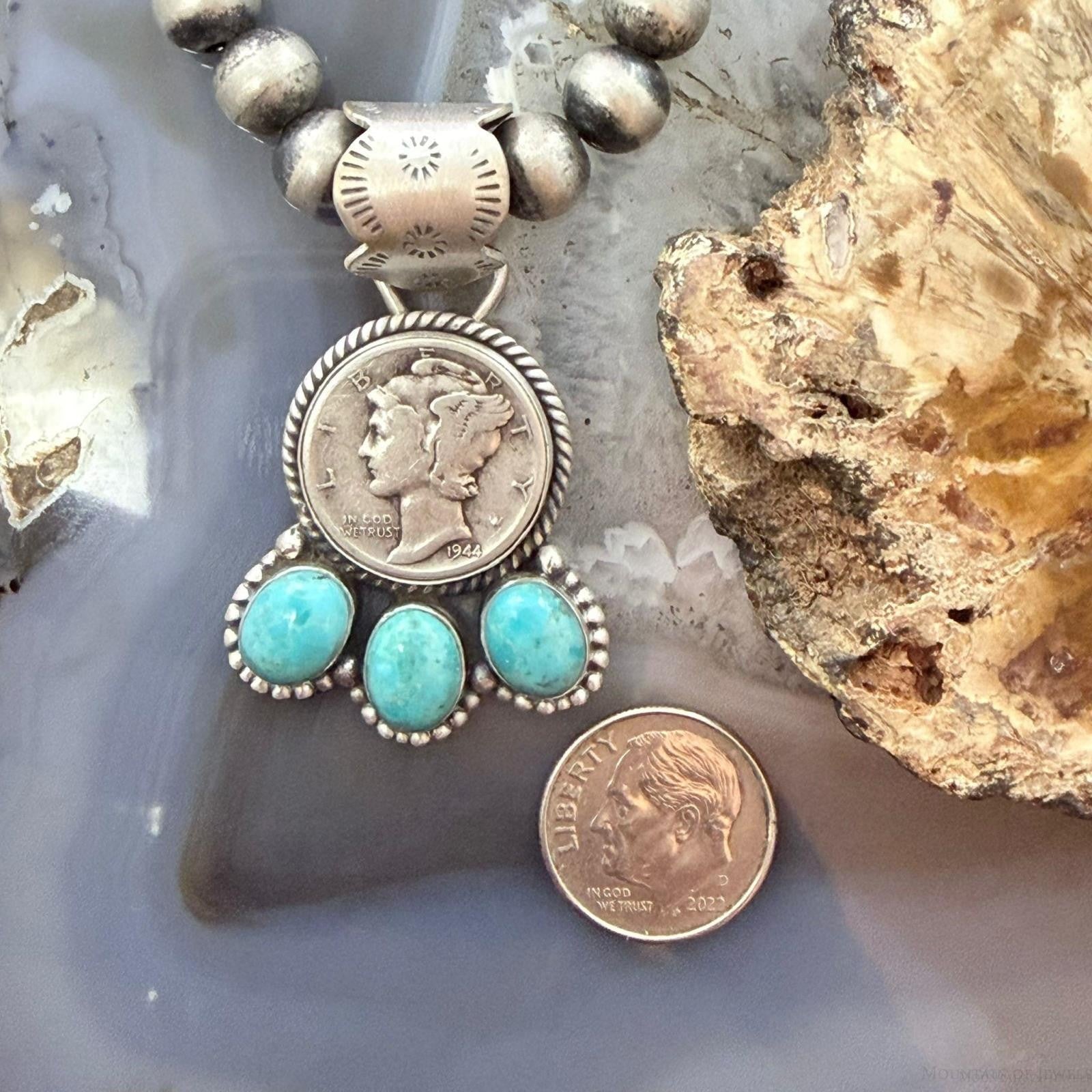 Genuine 1944 90% Silver Mercury Dime Coin w/Oval Turquoise Decorated Unisex Pendant