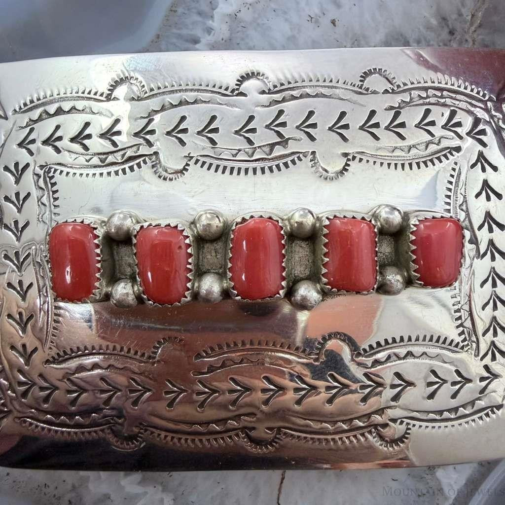 Joann Begay Native American Sterling Silver 5 Coral Stamped Belt Buckle For Men