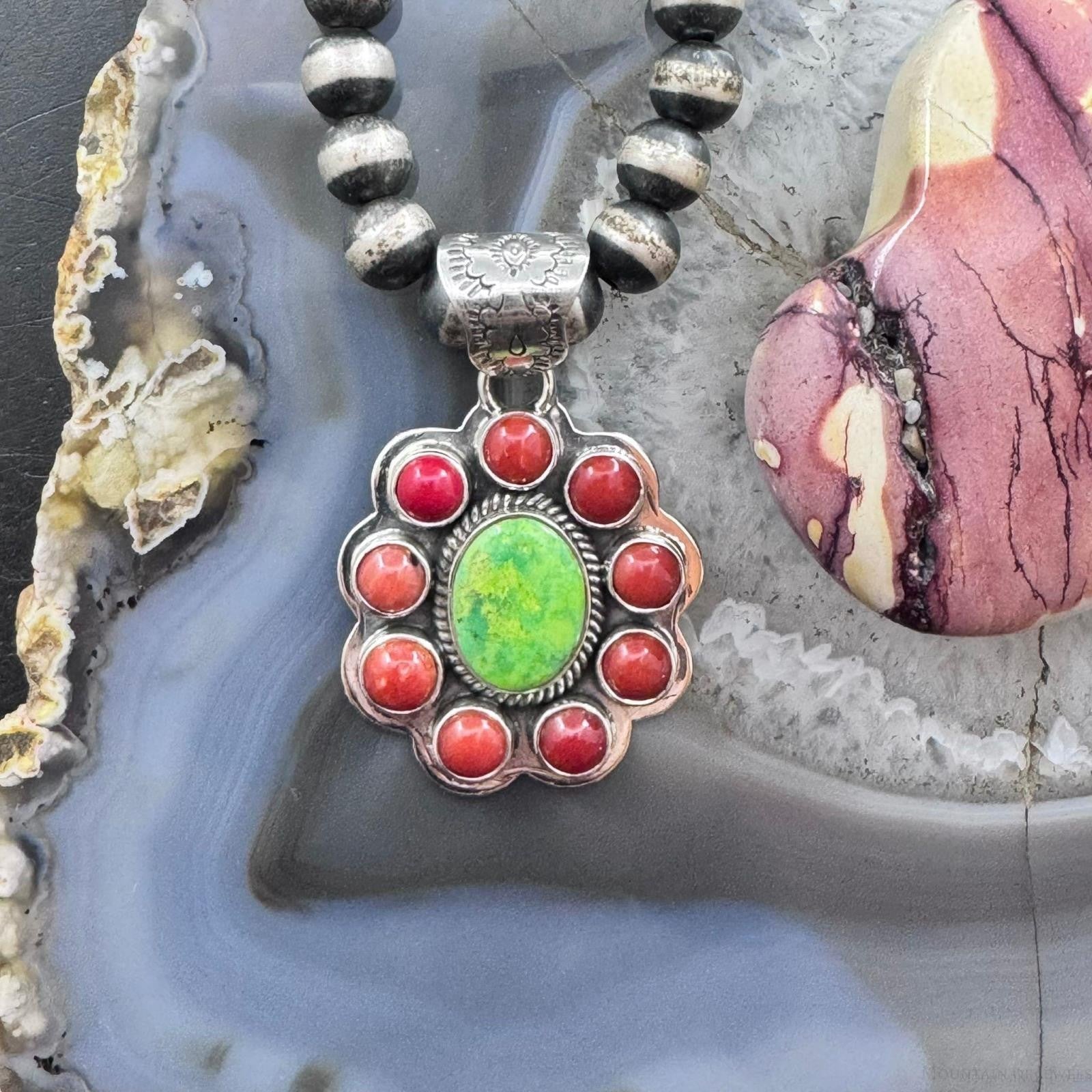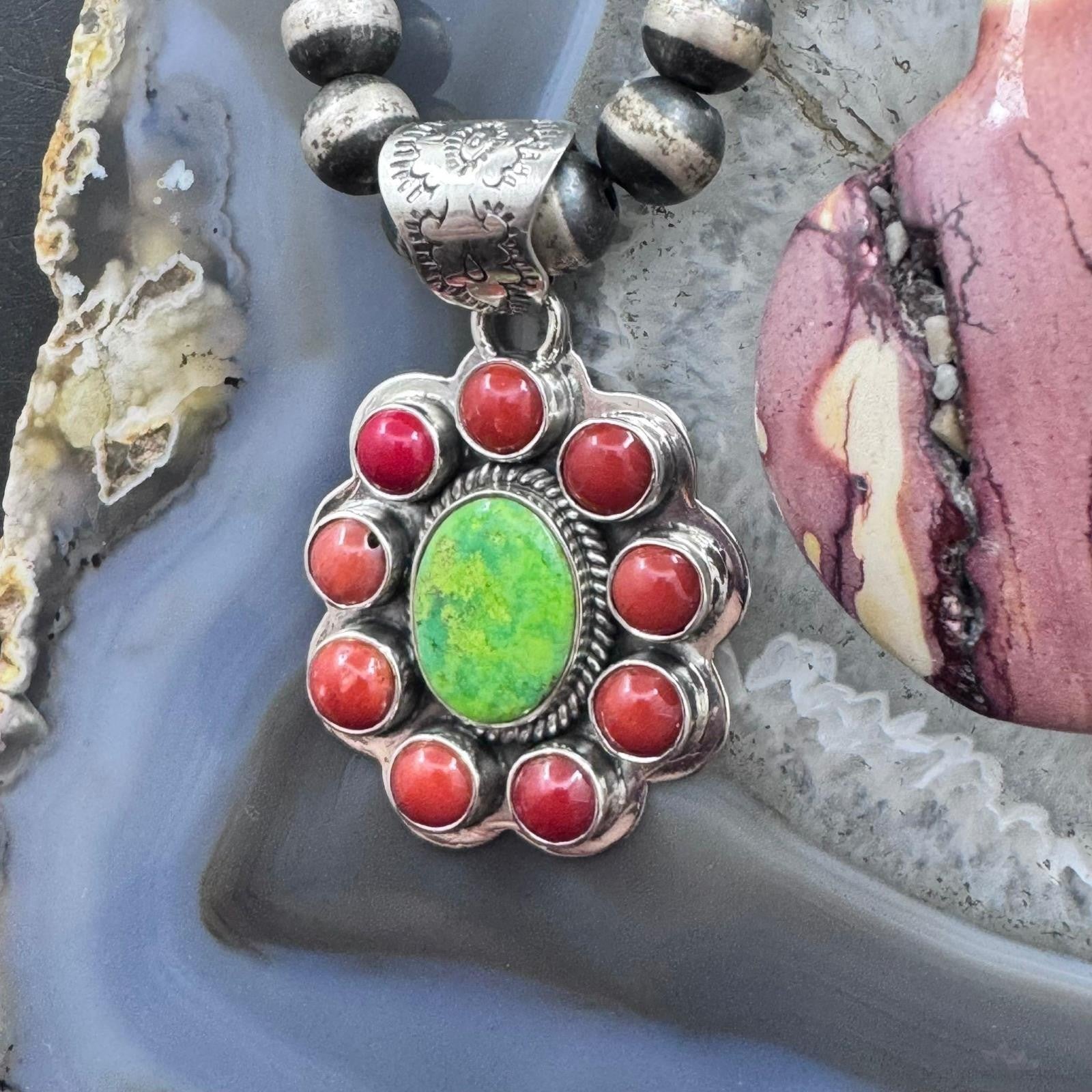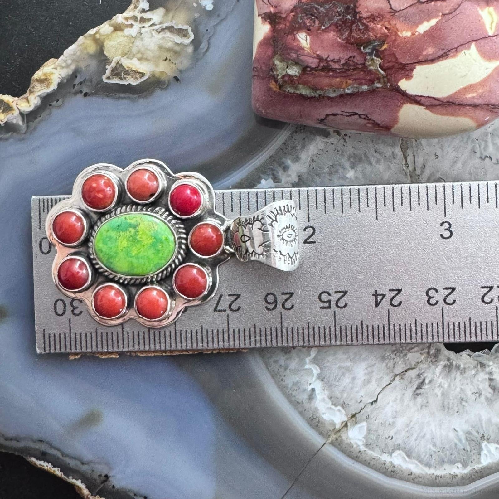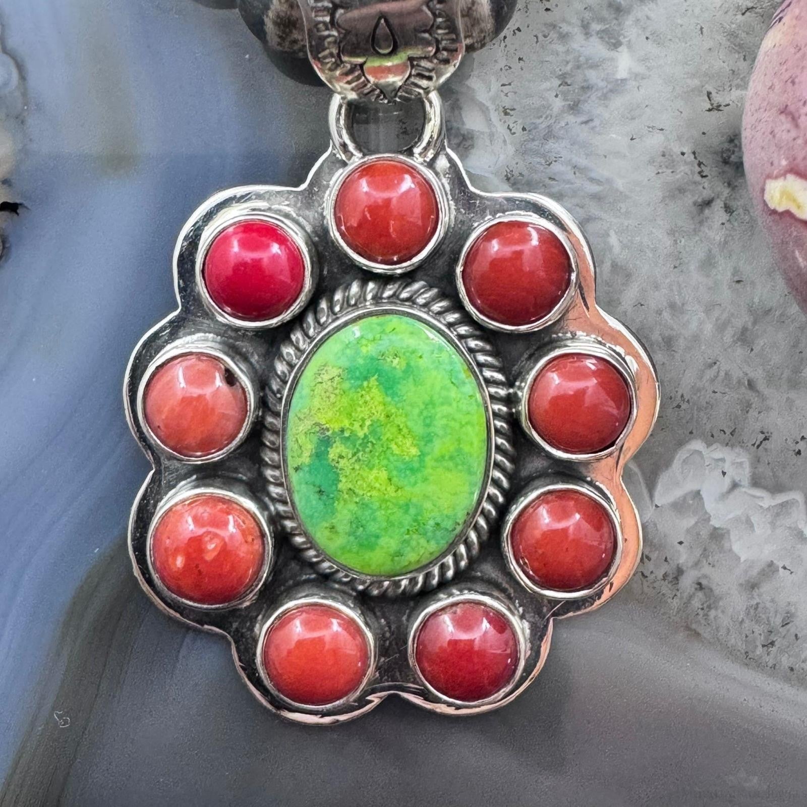 Native American Sterling Silver Green Turquoise w/ Red Coral Cluster Pendant For Women