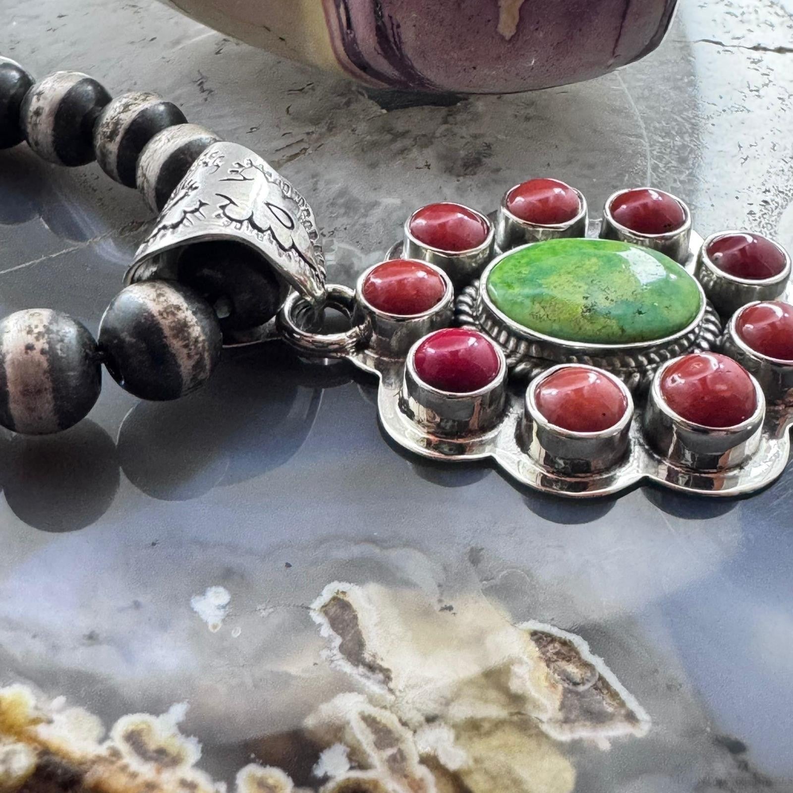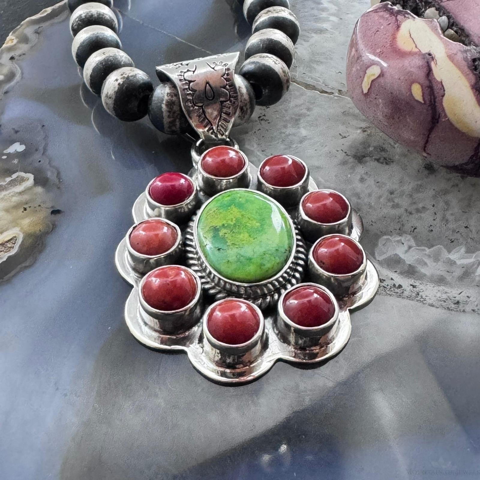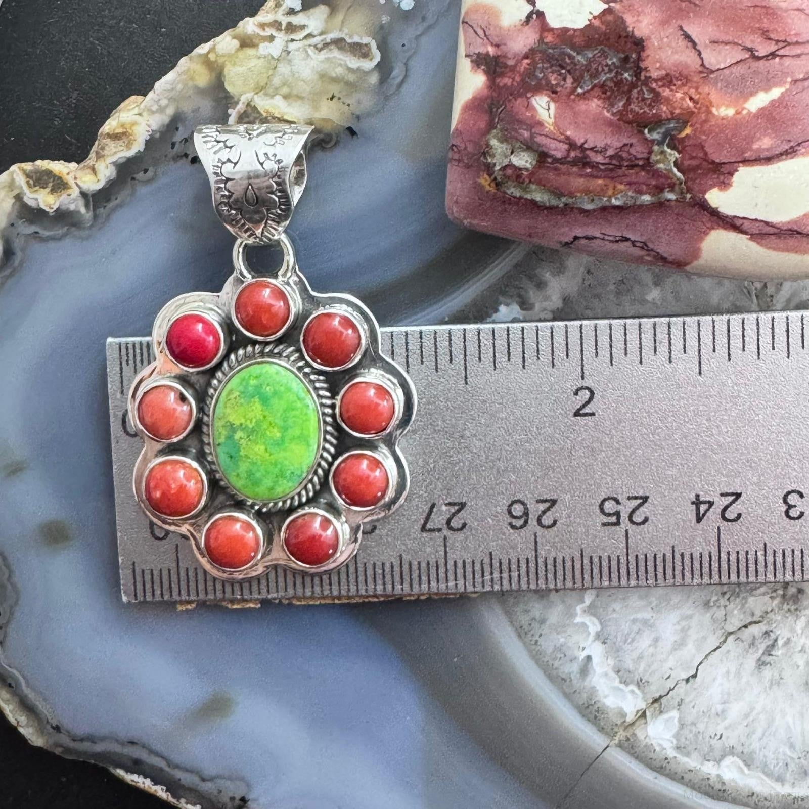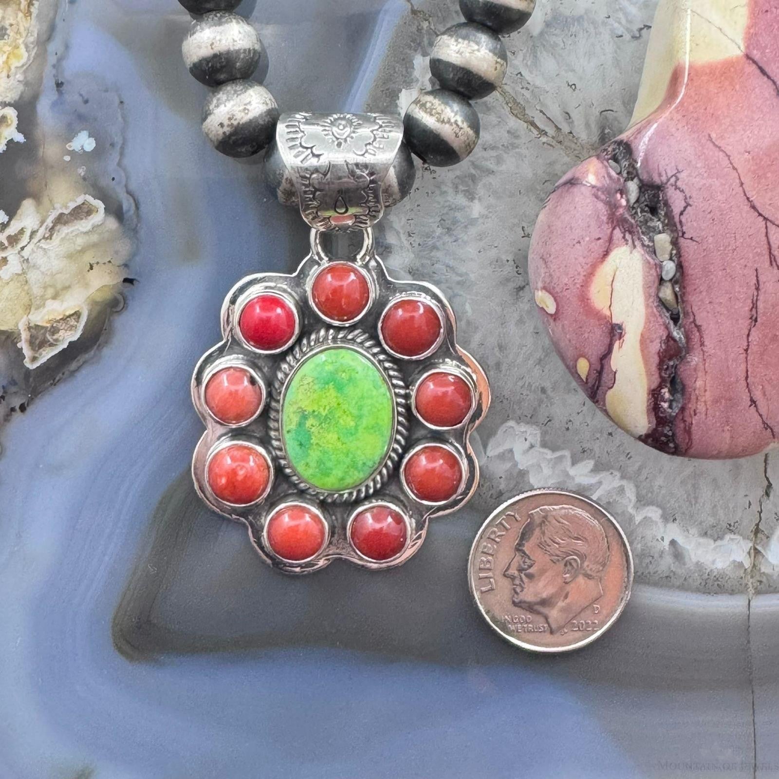 Native American Sterling Silver Green Turquoise w/ Red Coral Cluster Pendant For Women