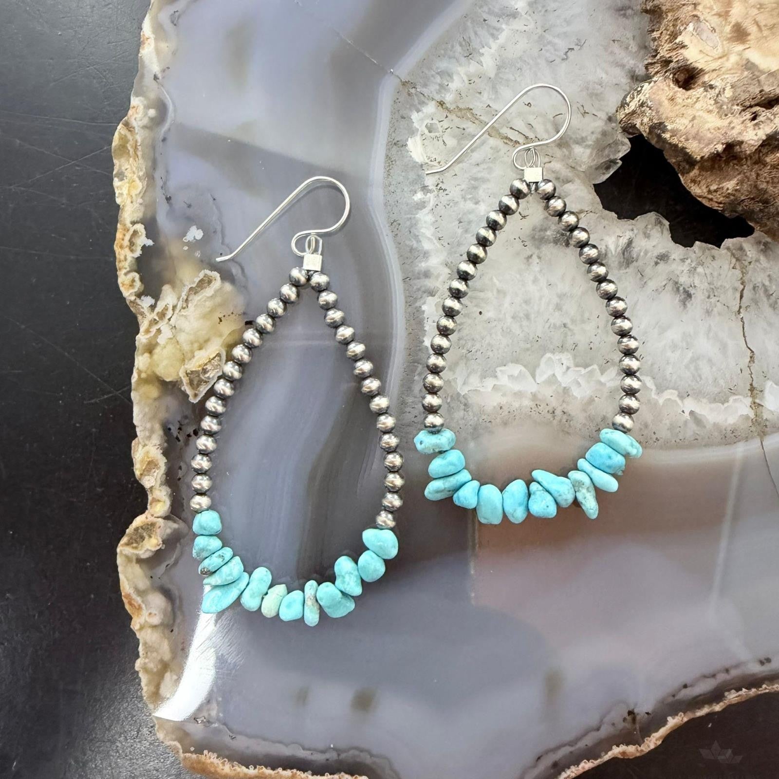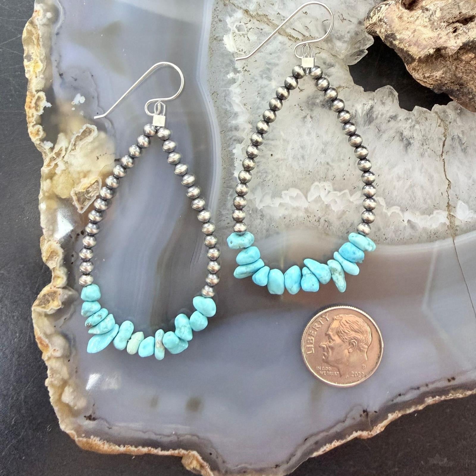 Sterling Silver Navajo Pearl Bead & Chunky Turquoise Dangle Hoop Earrings For Women
