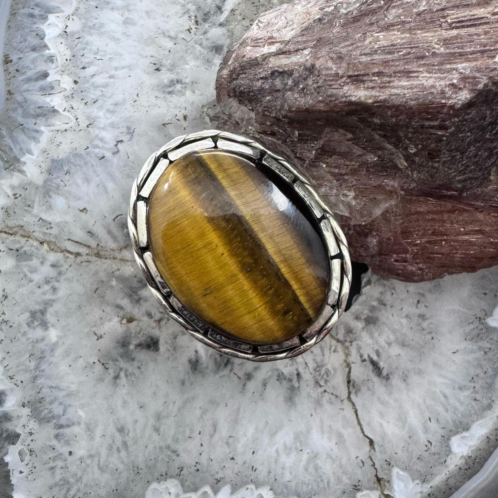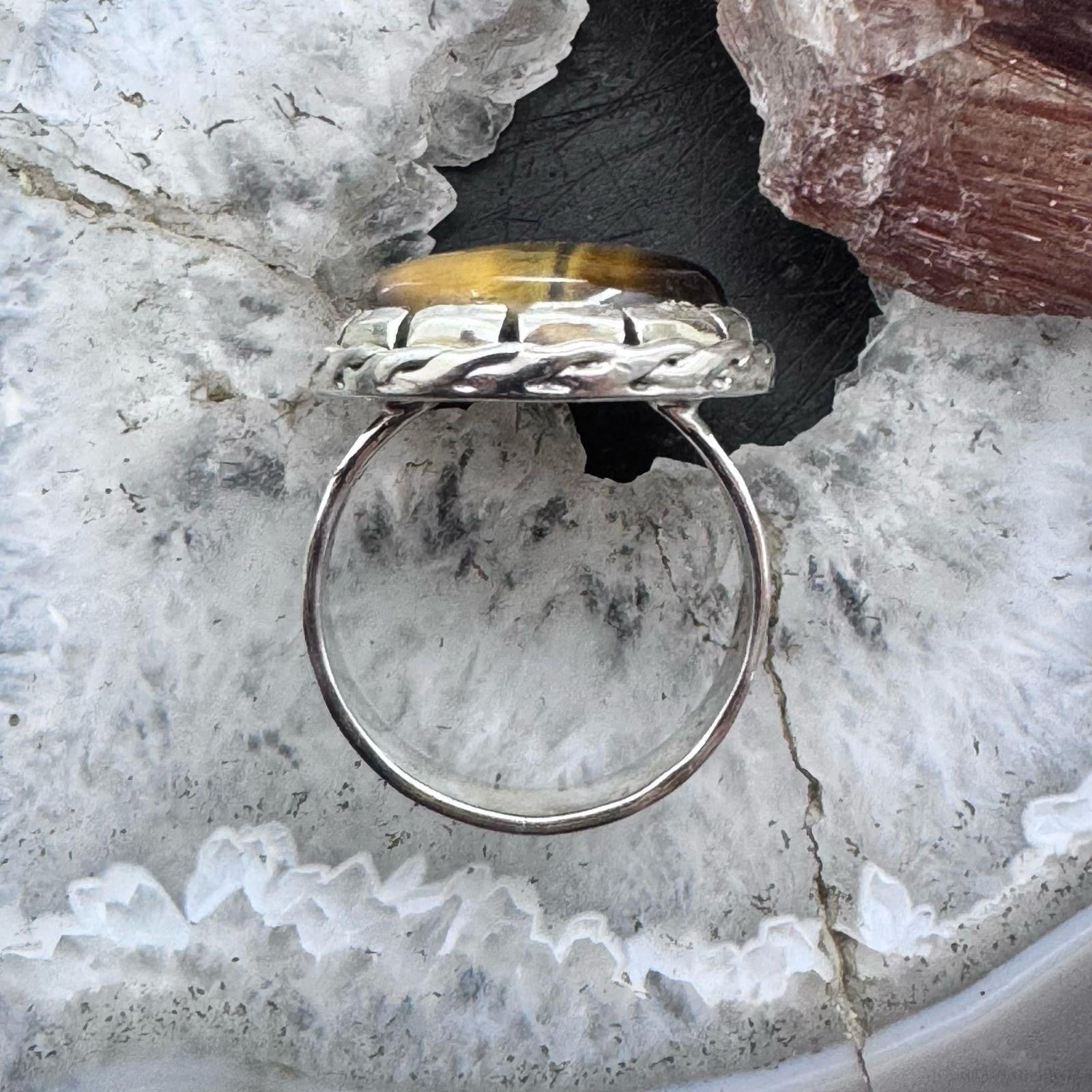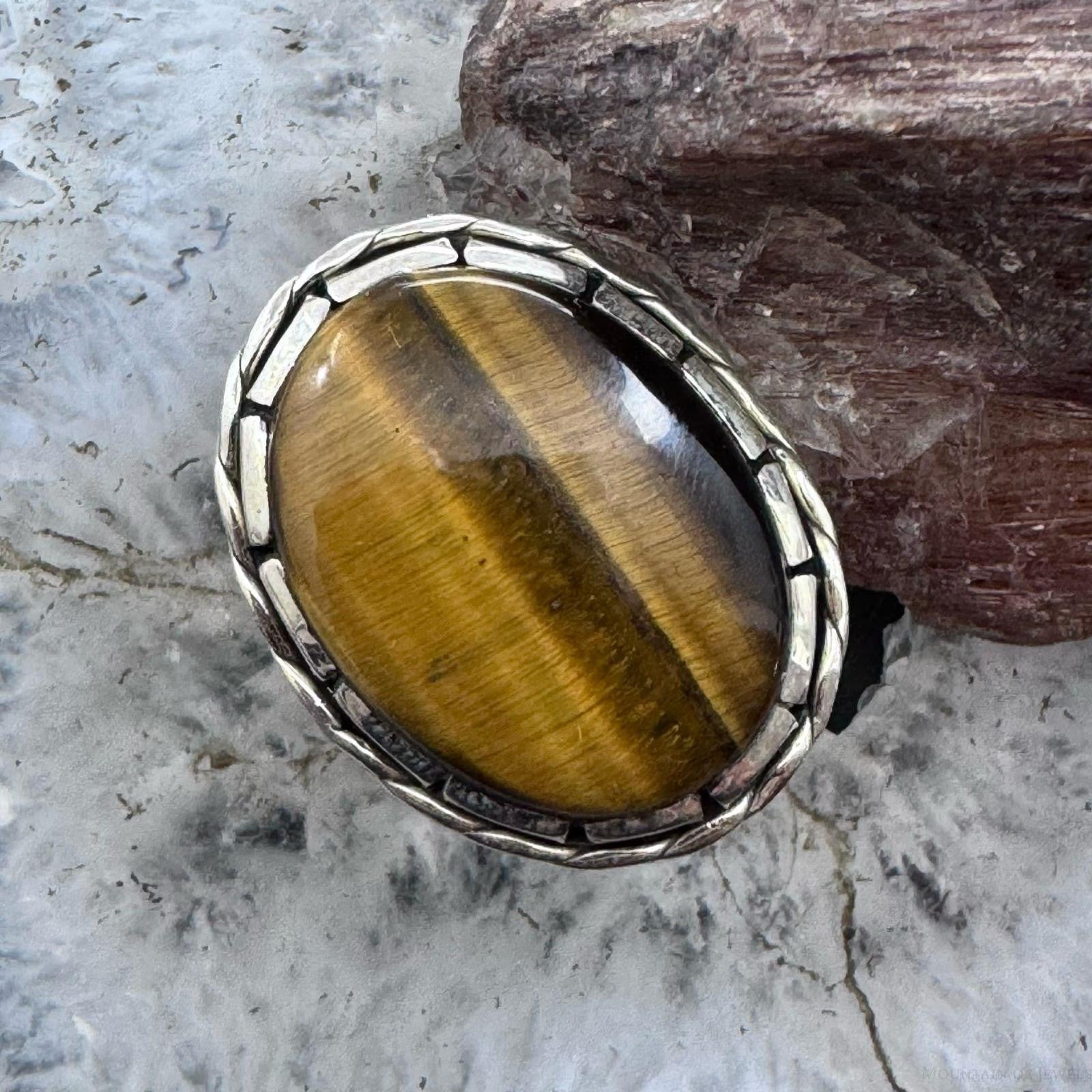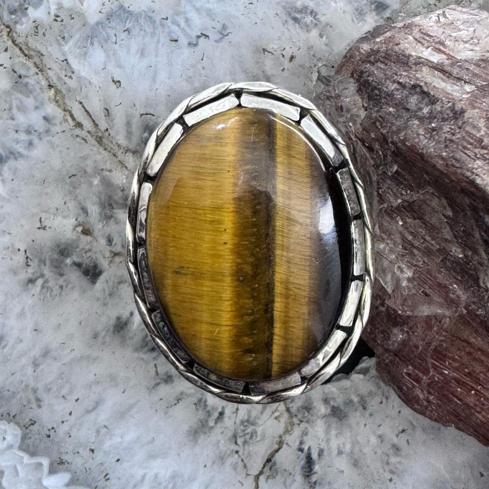 Sterling Silver Southwestern Oval Tiger's Eye Decorated Ring Size 9.5 For Women