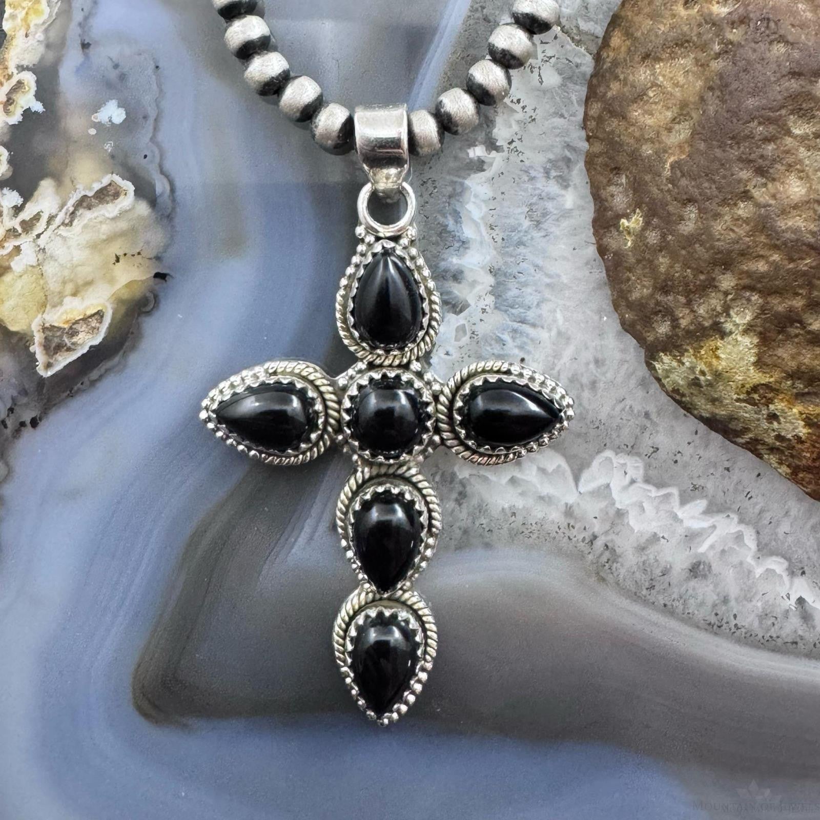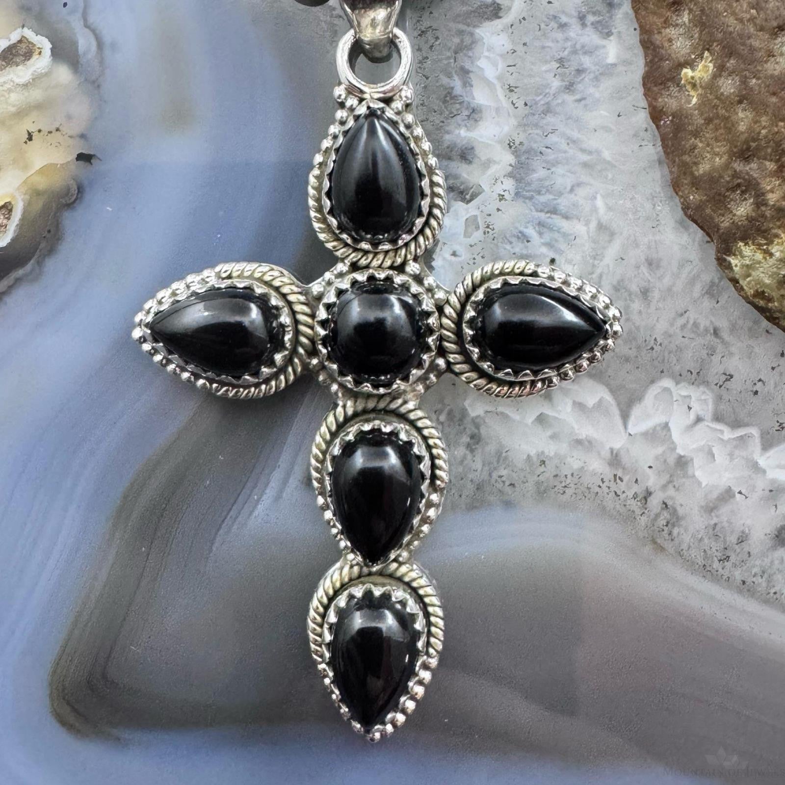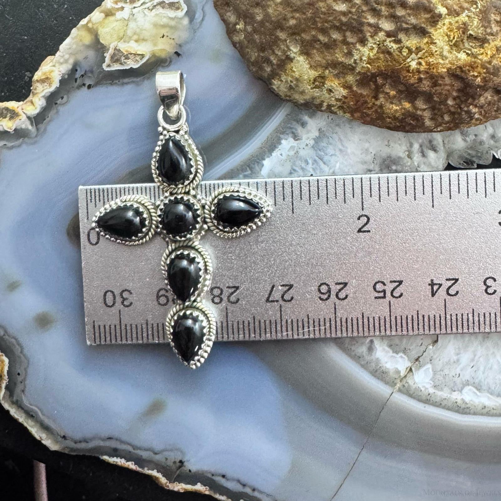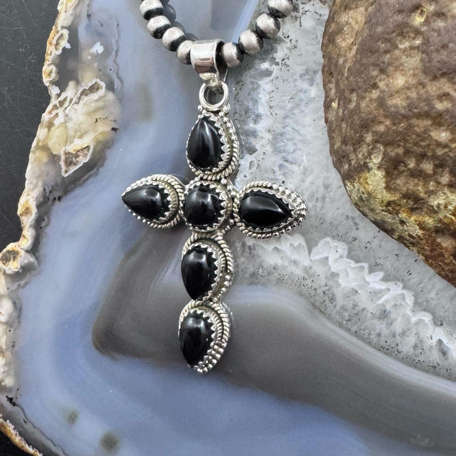 Sterling Silver Southwestern Style 6 Onyx Decorated Cross Pendant For Women