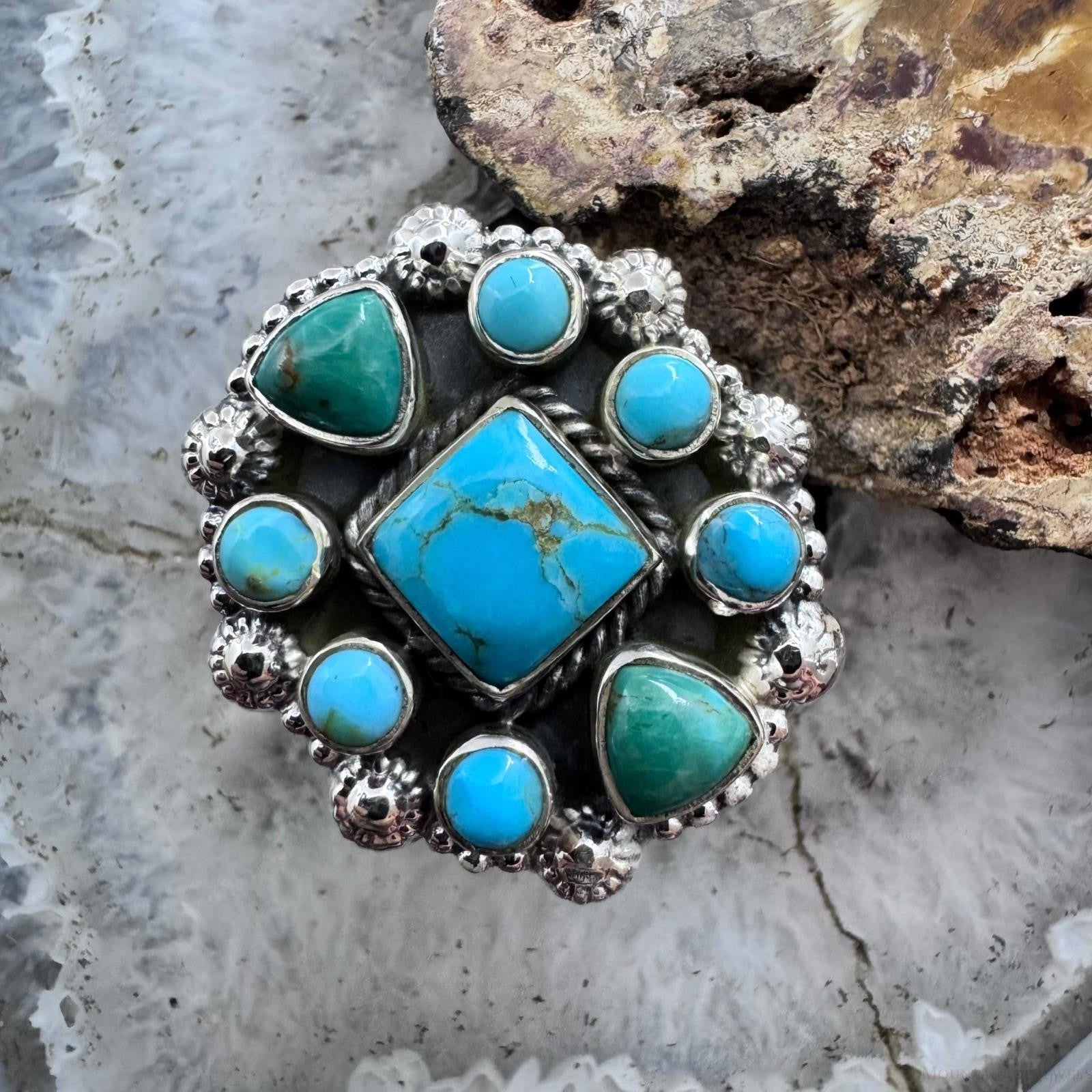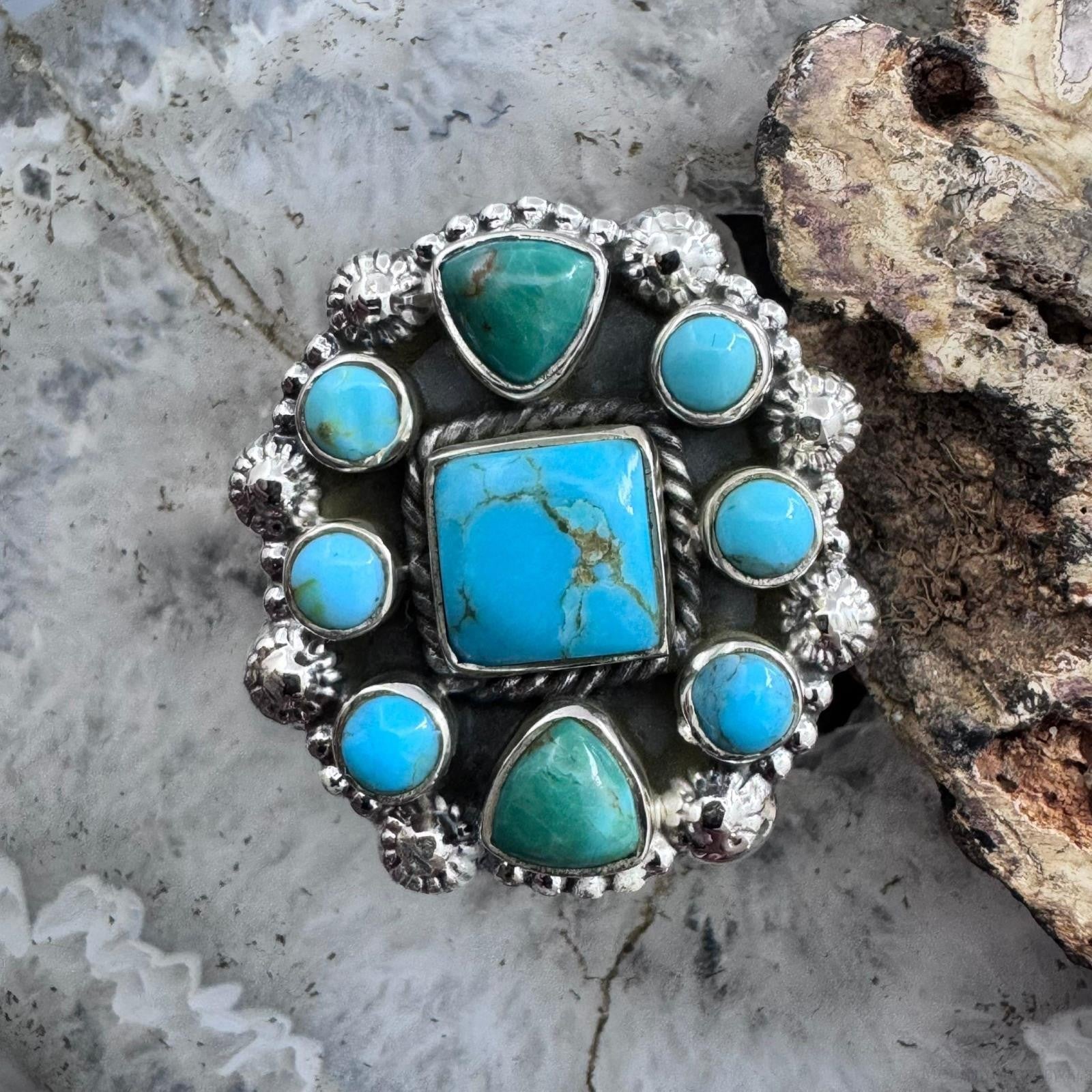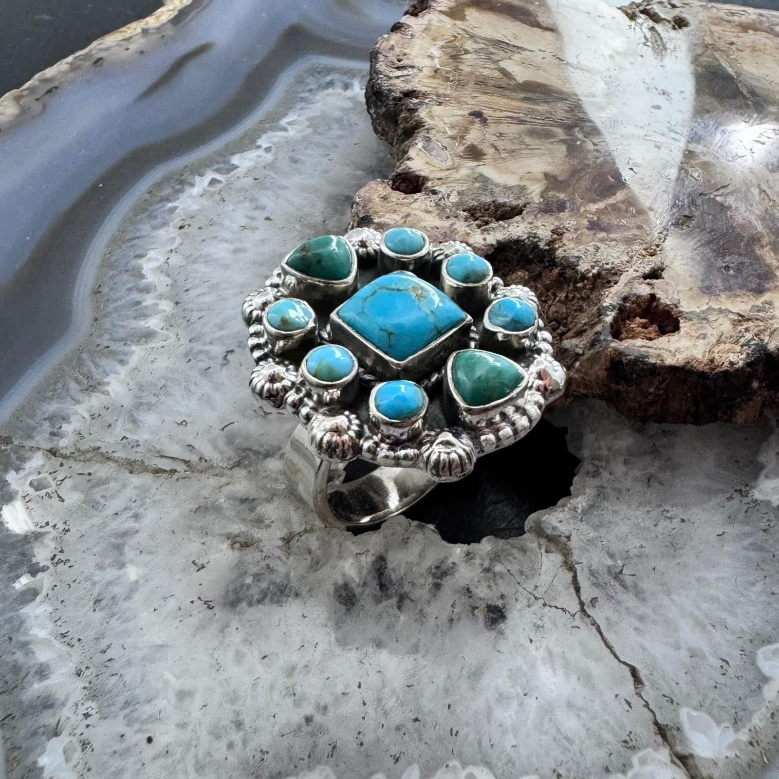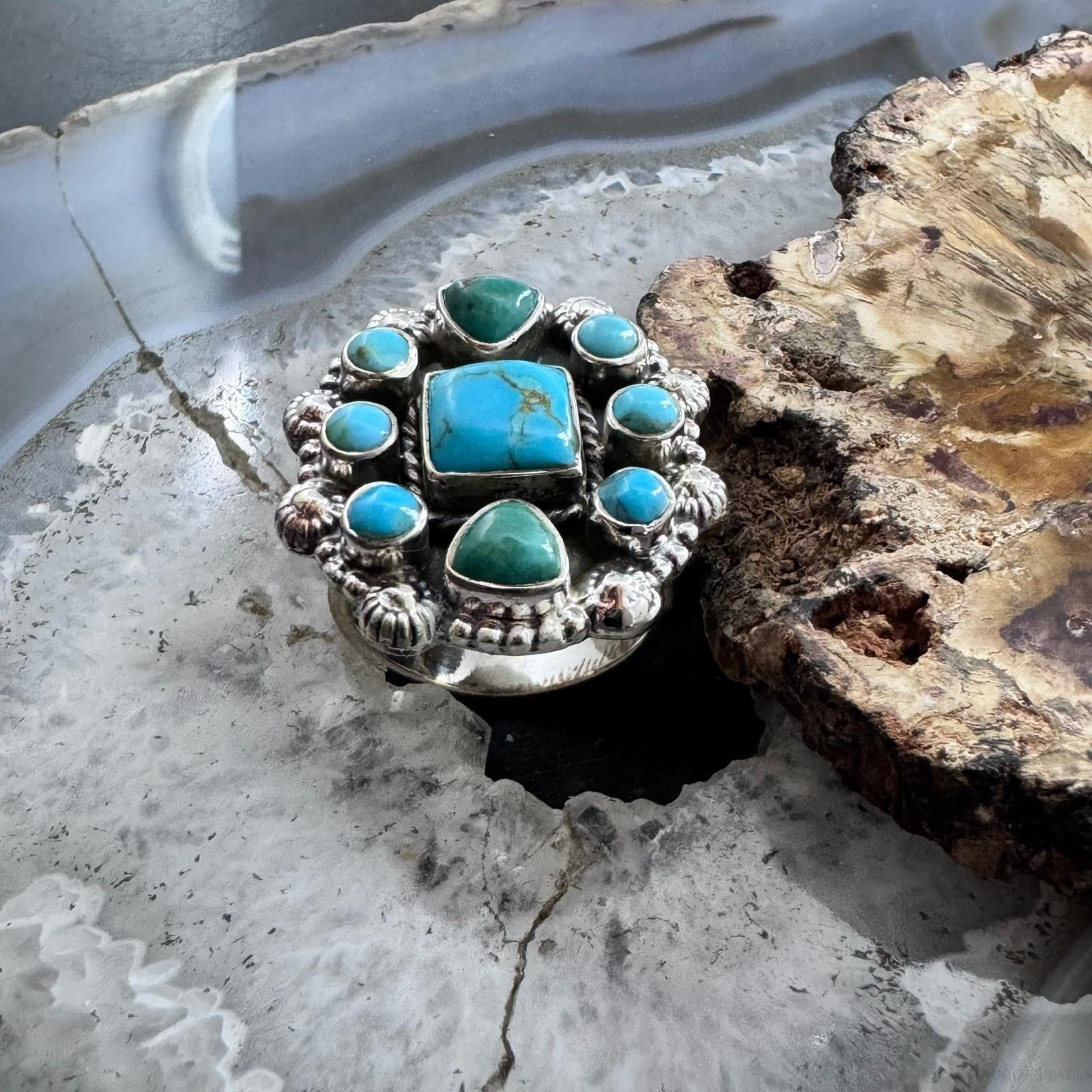 Sterling Silver Southwestern Style Composite Turquoise Cluster Adjustable Ring For Women