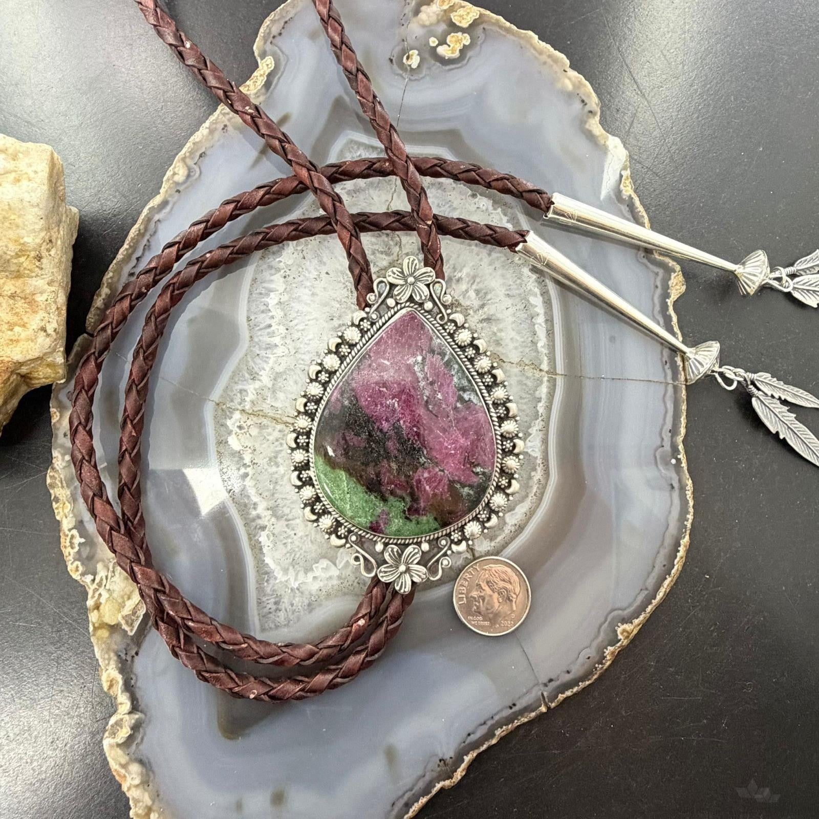 Sterling Silver Southwestern Style Large Teardrop Ruby Zoisite Bolo Tie For Men