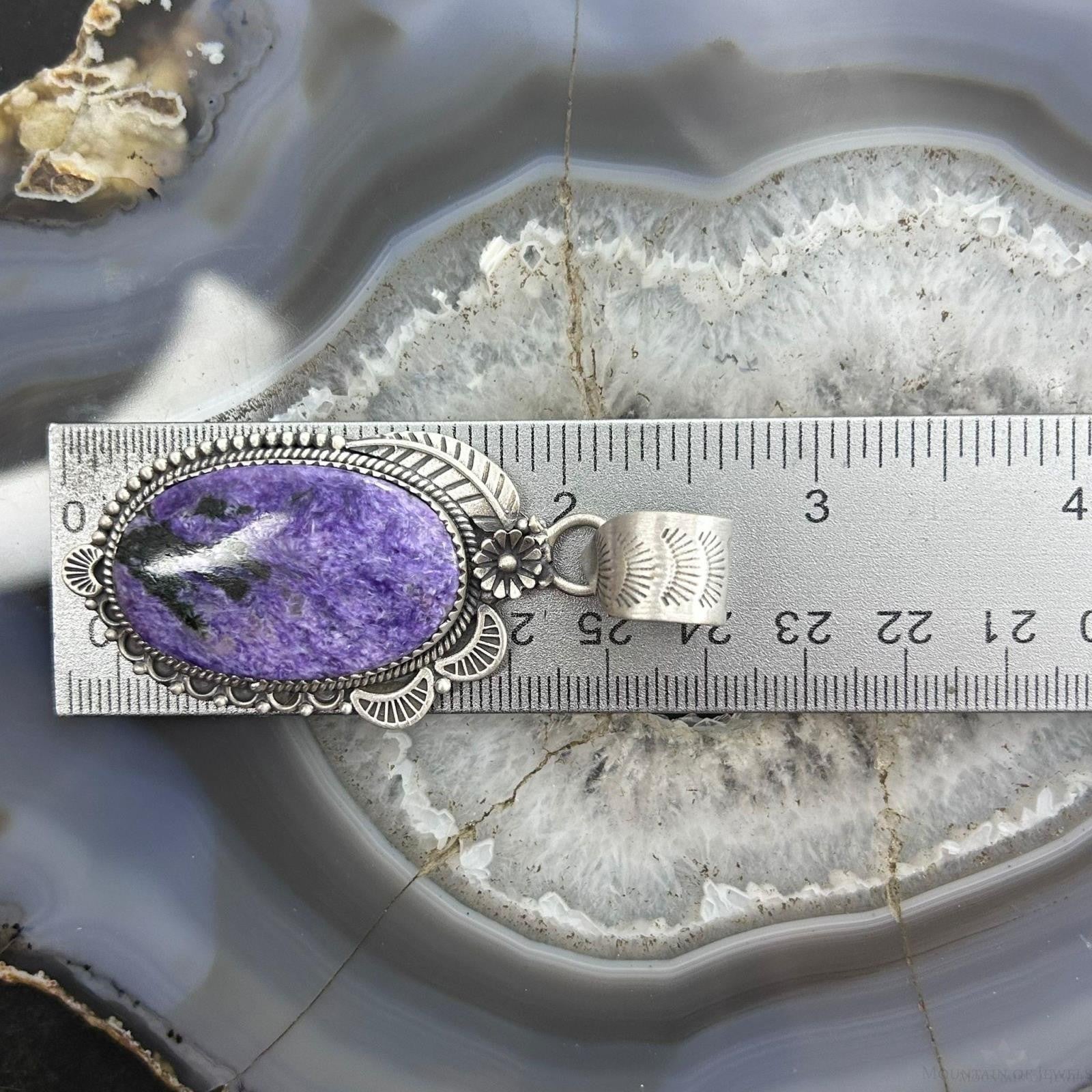 Sterling Silver Southwestern Style Oval Charoite Leaf Decorated Pendant For Women