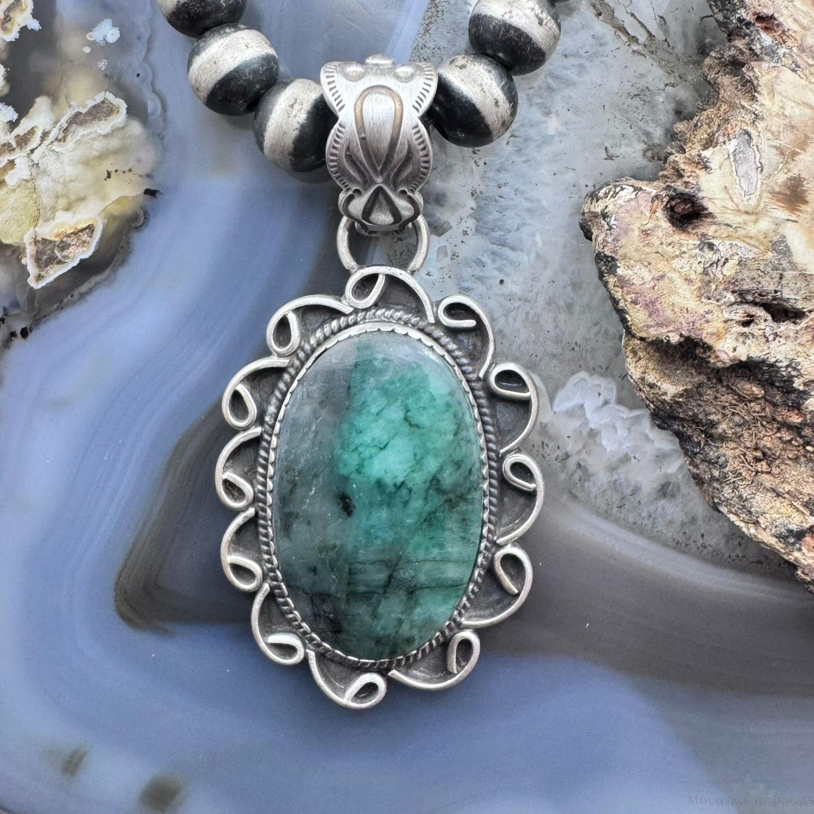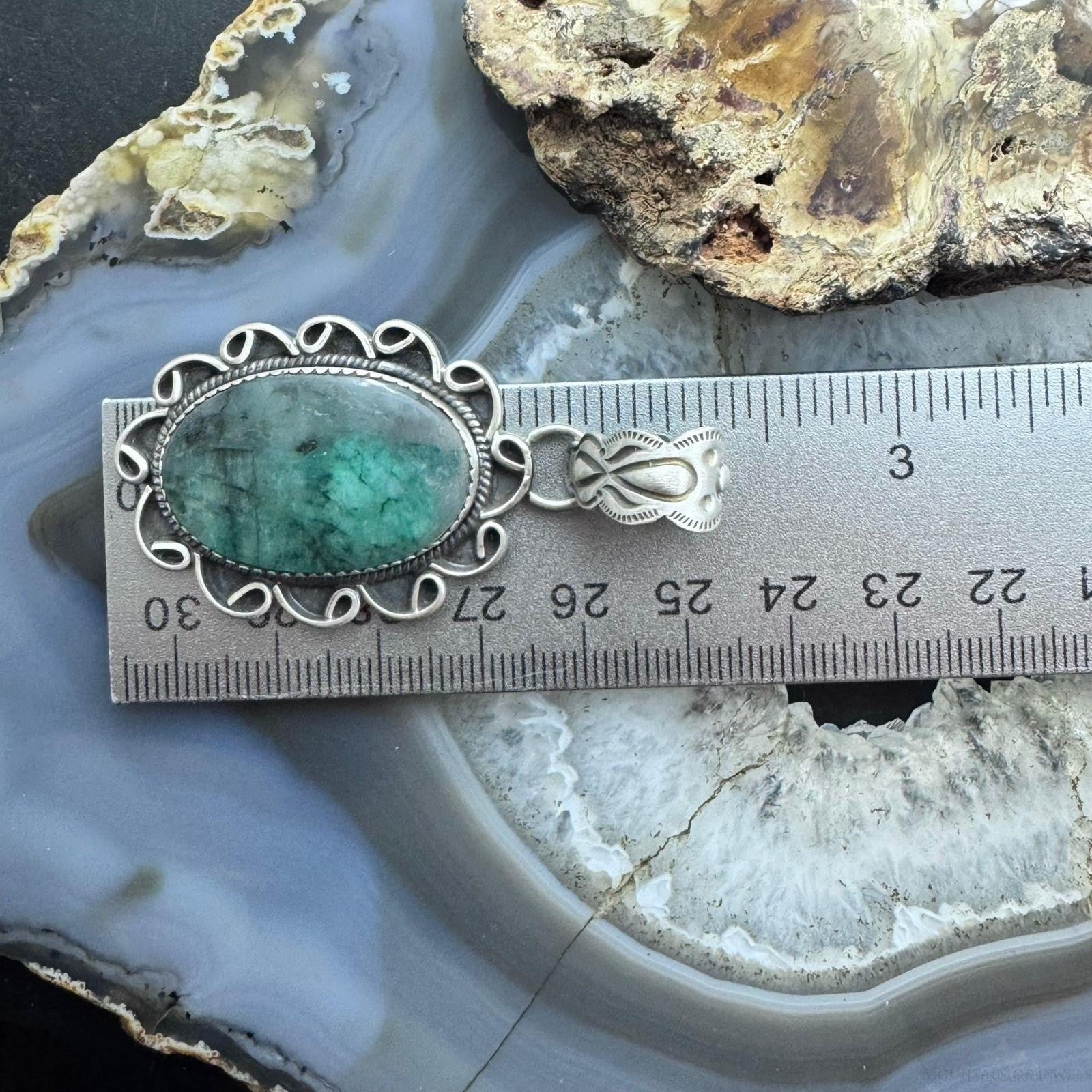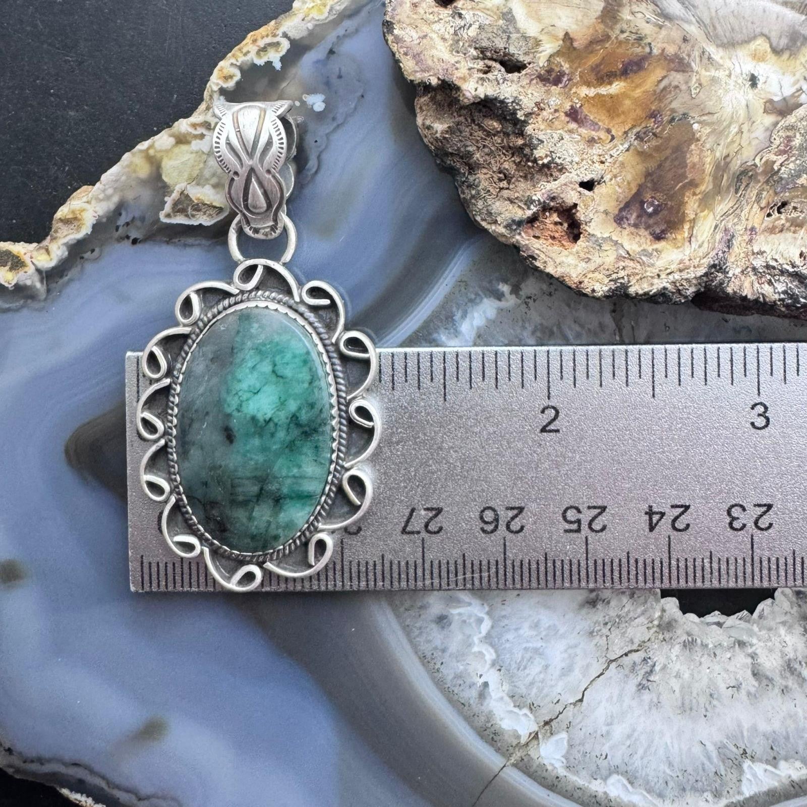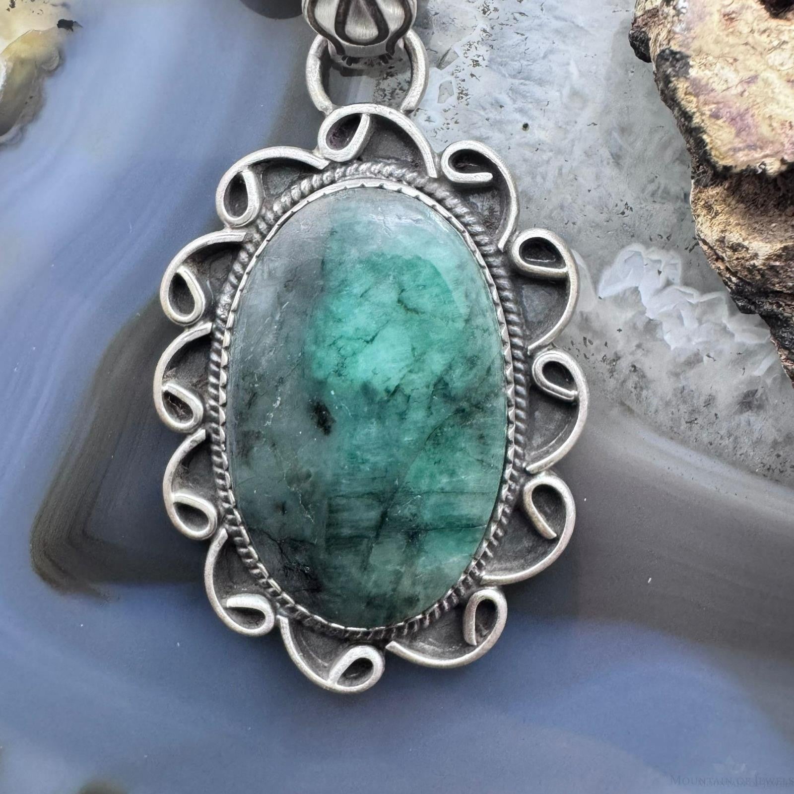 Sterling Silver Southwestern Style Oval Emerald Decorated Pendant For Women