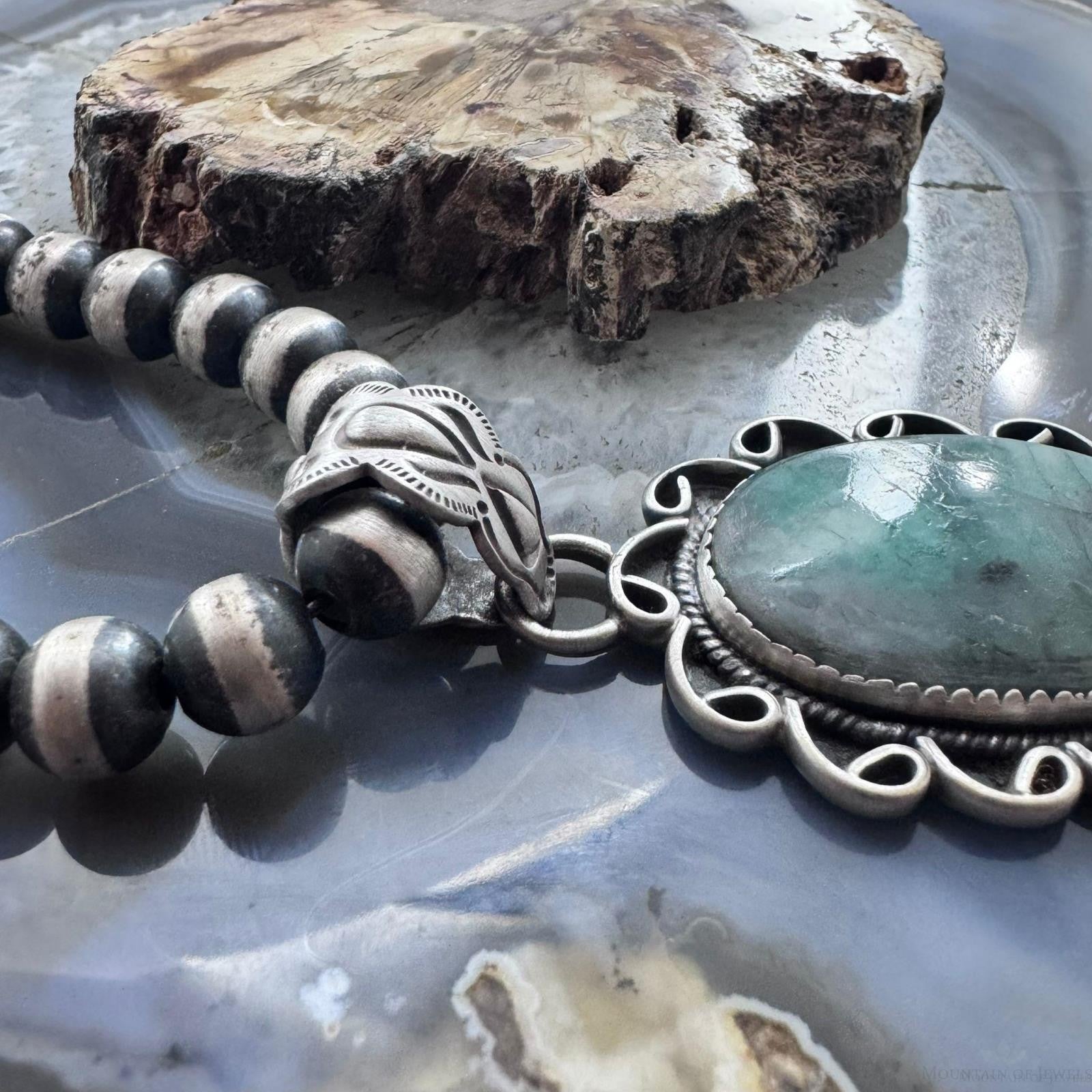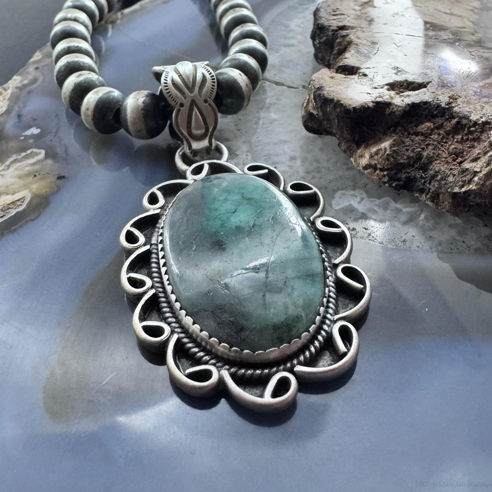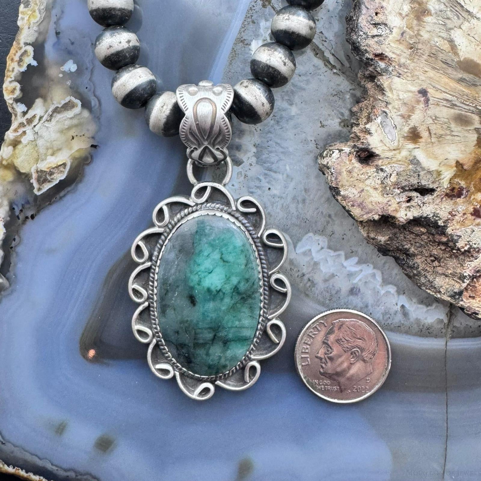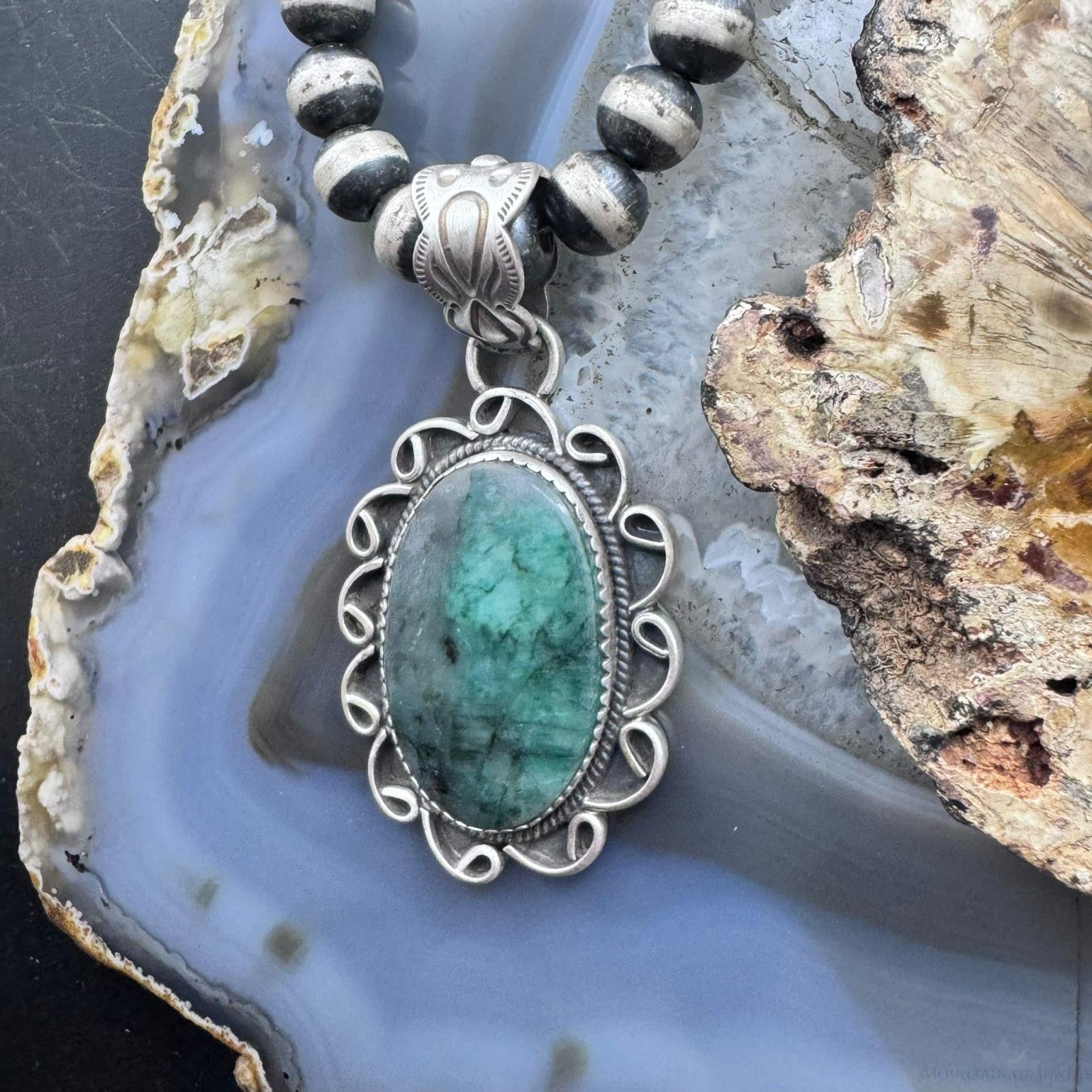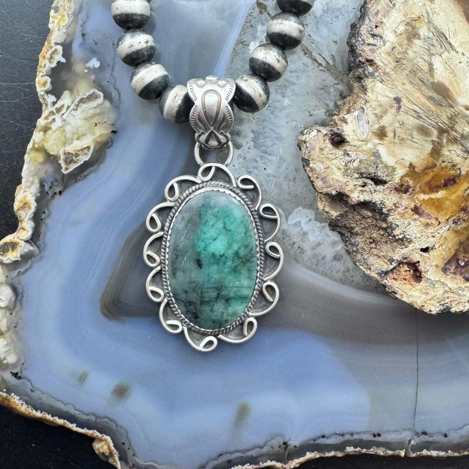 Sterling Silver Southwestern Style Oval Emerald Decorated Pendant For Women
