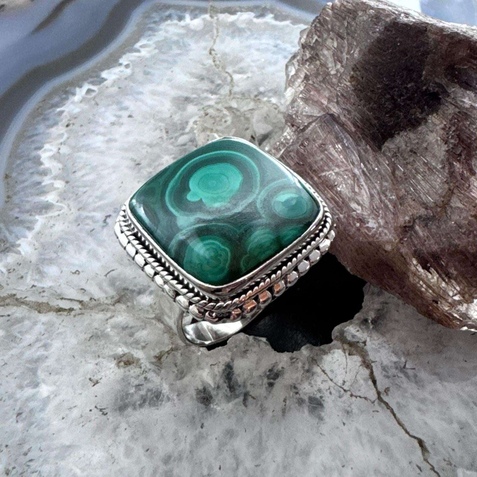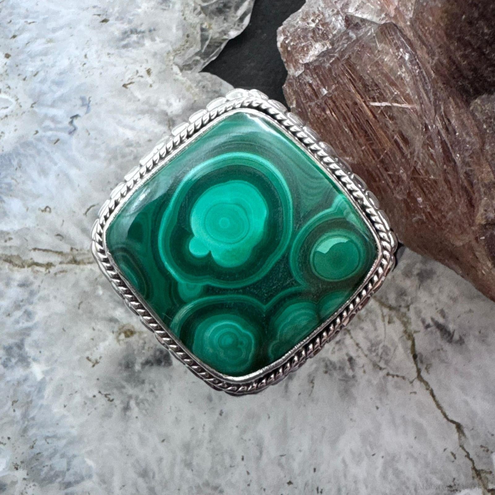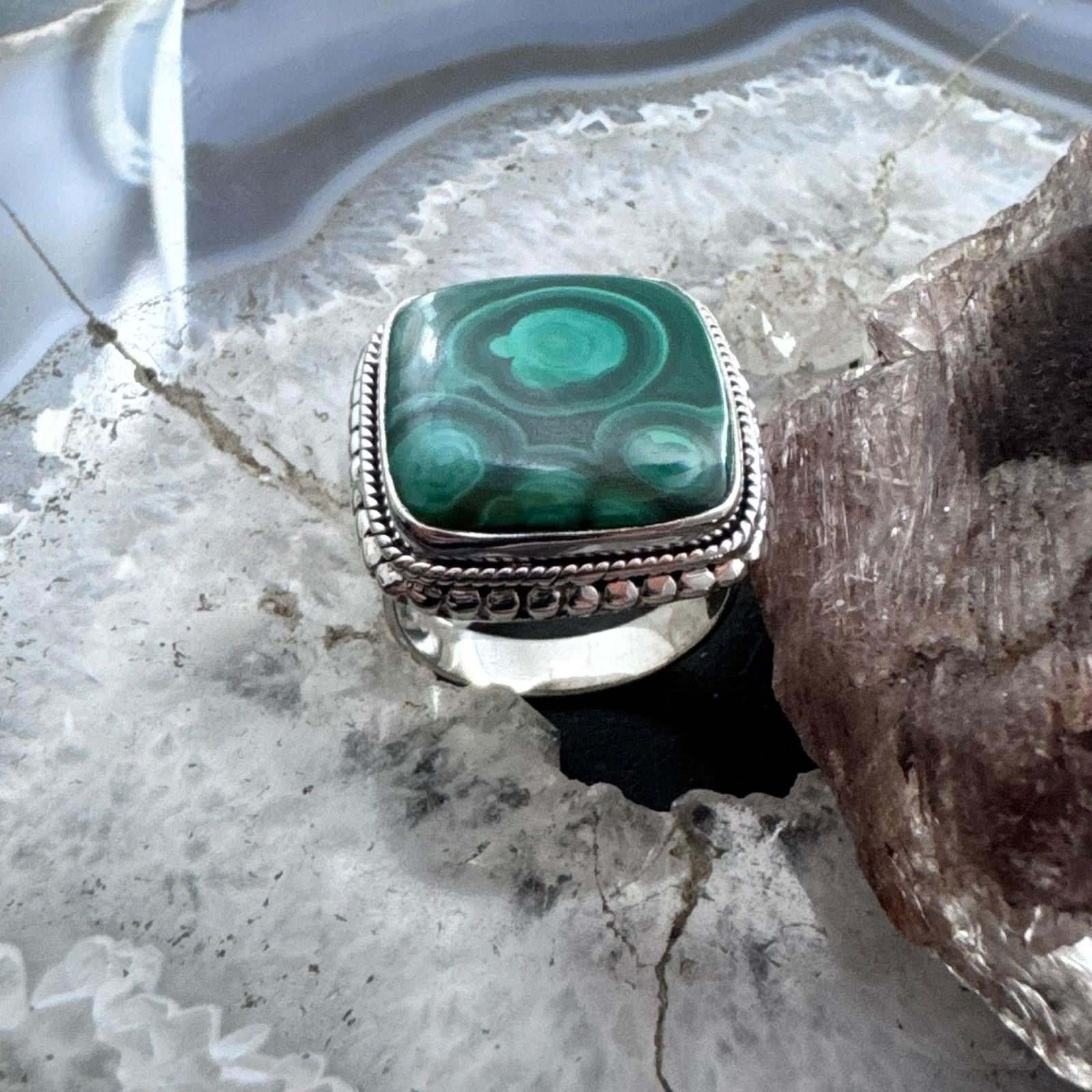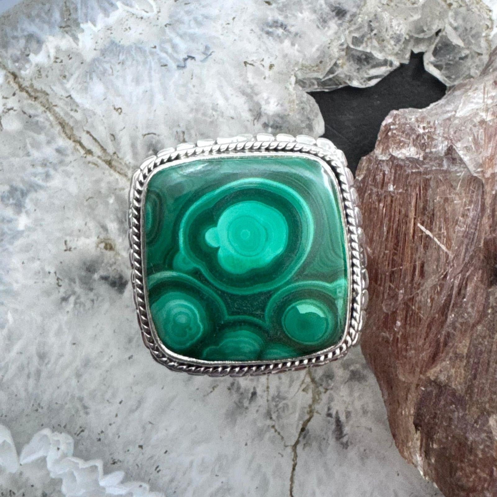 Sterling Silver Southwestern Style Square Malachite Decorated Ring Size 9.5 For Women