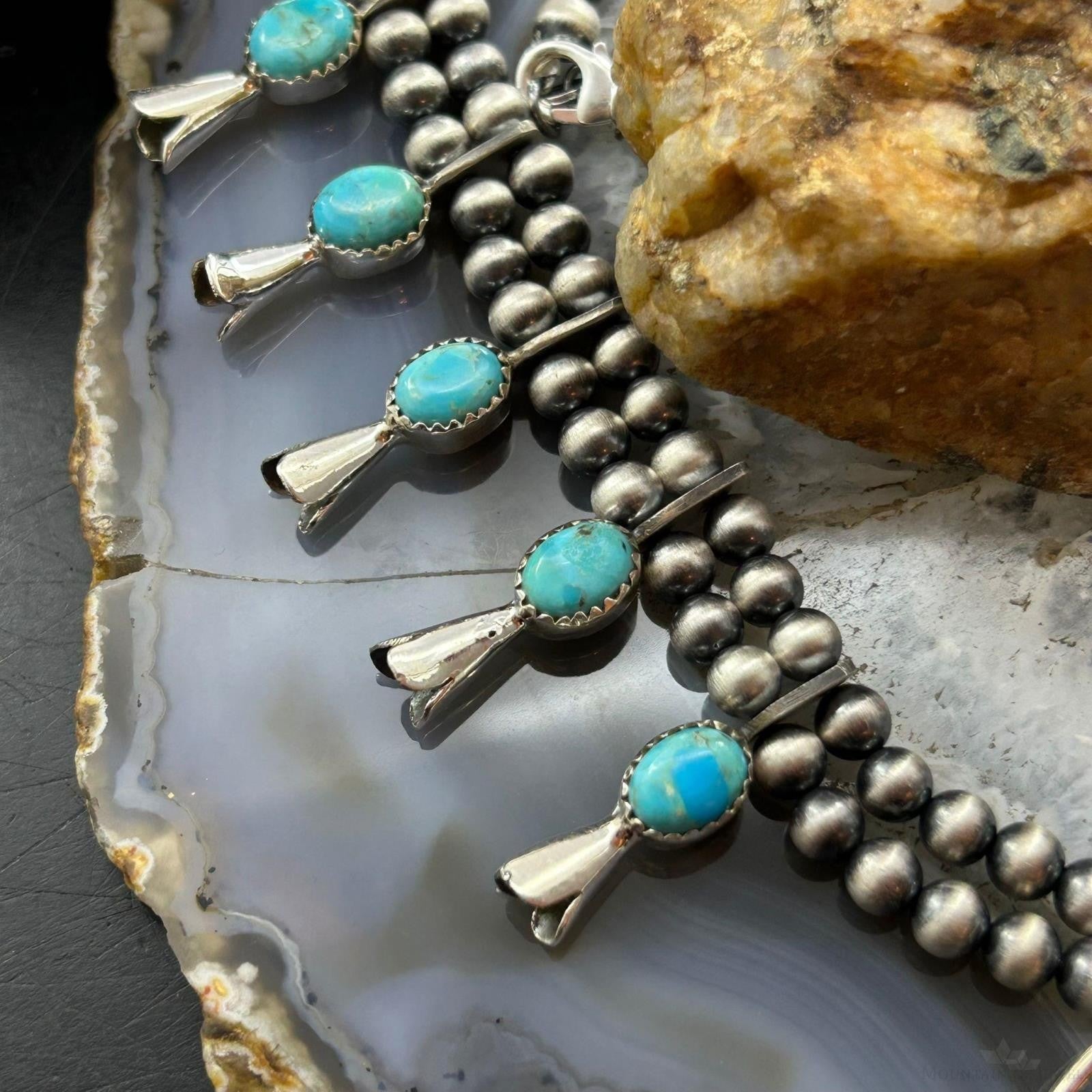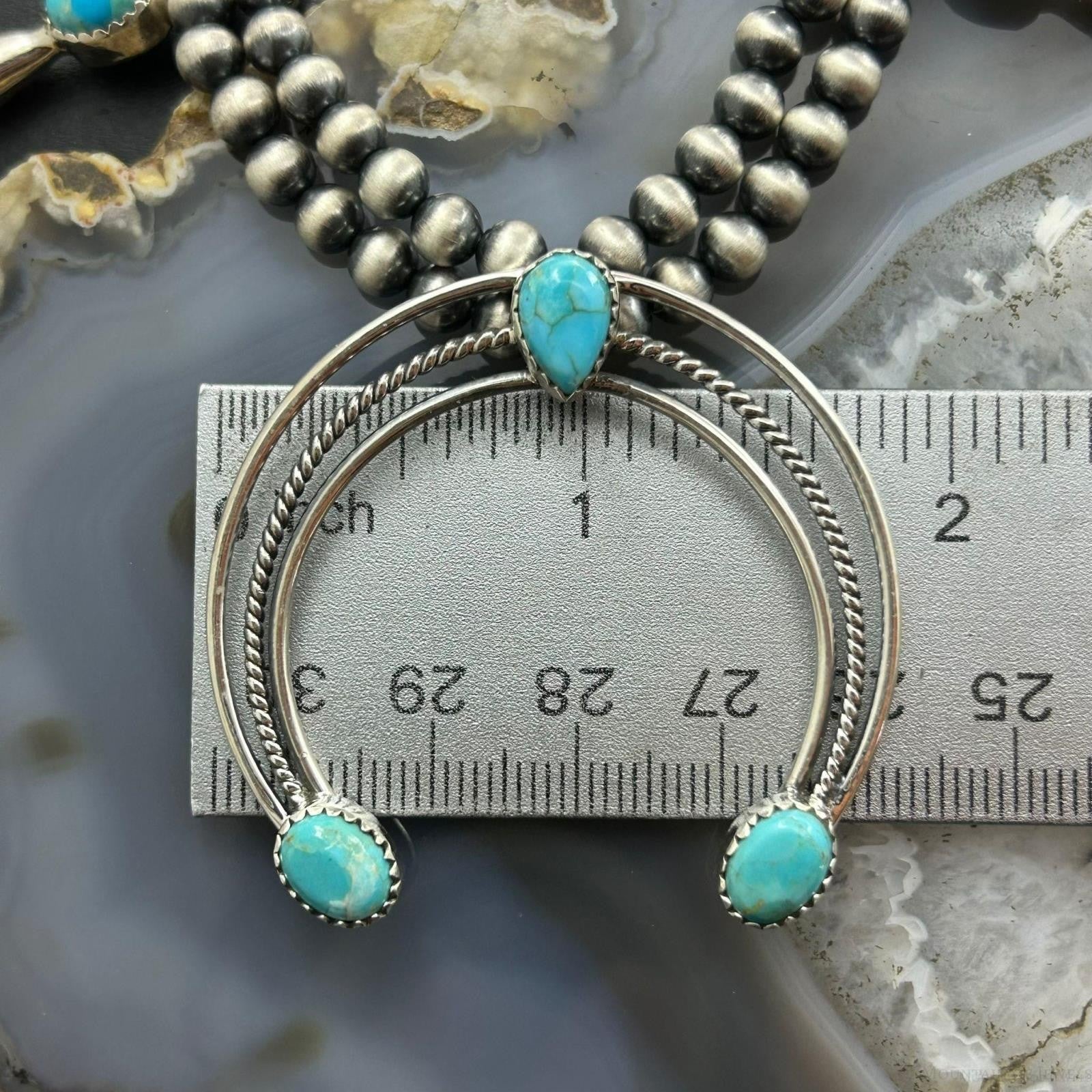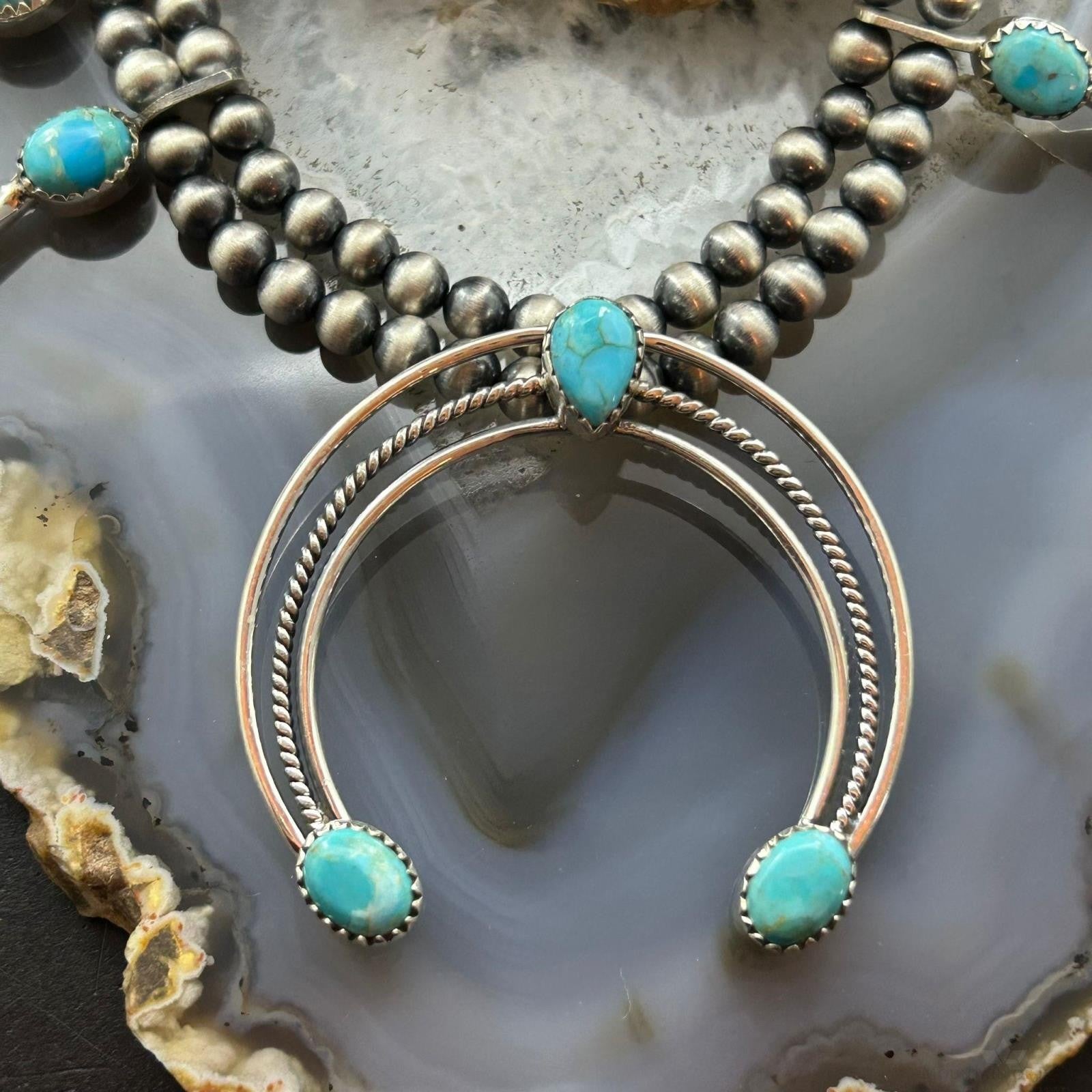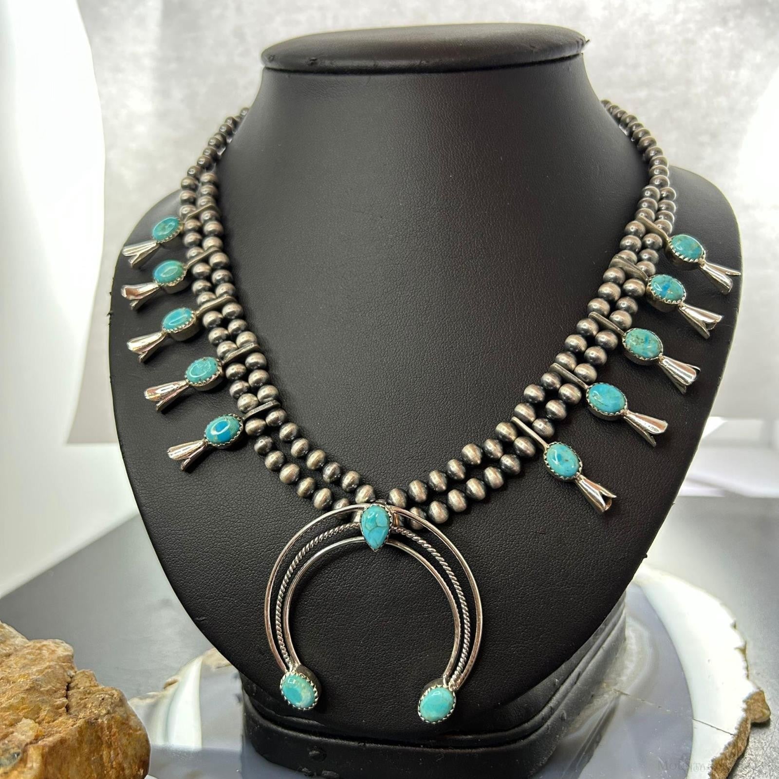 Sterling Silver Southwestern Style Turquoise Squash Blossom Necklace For Women