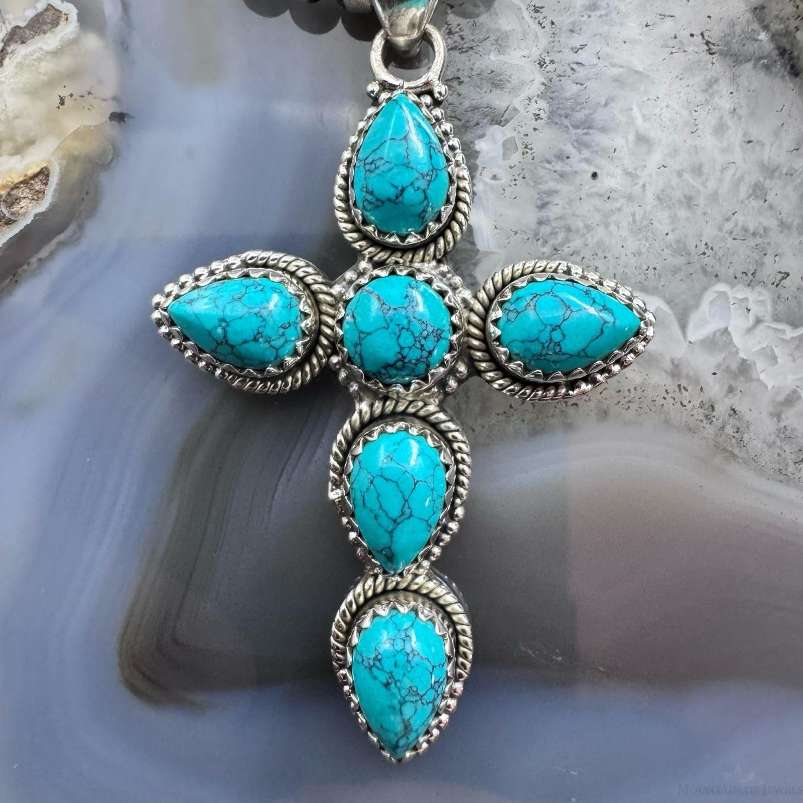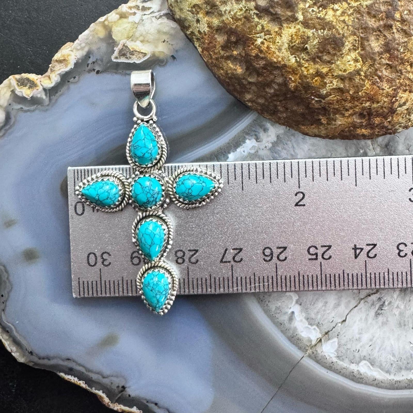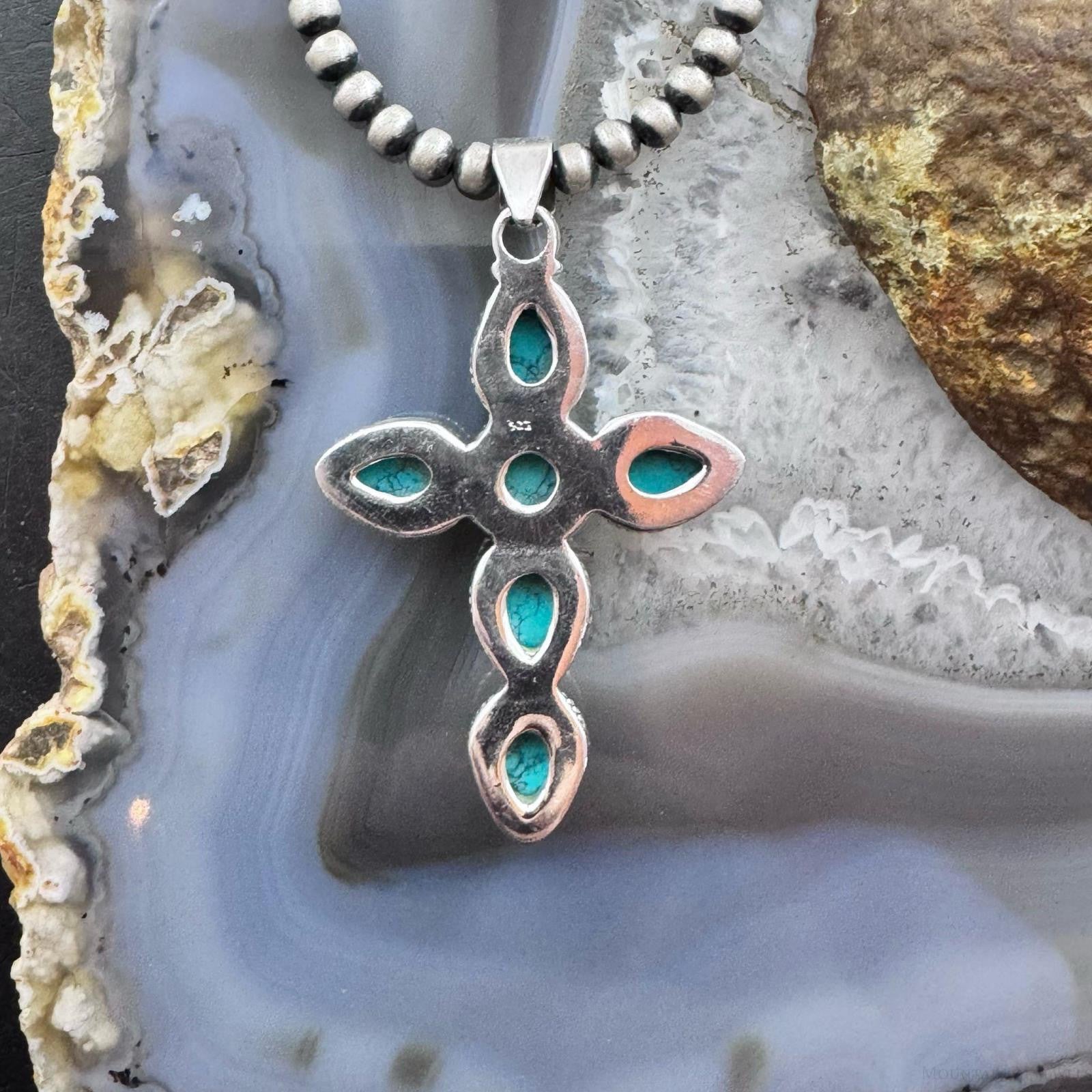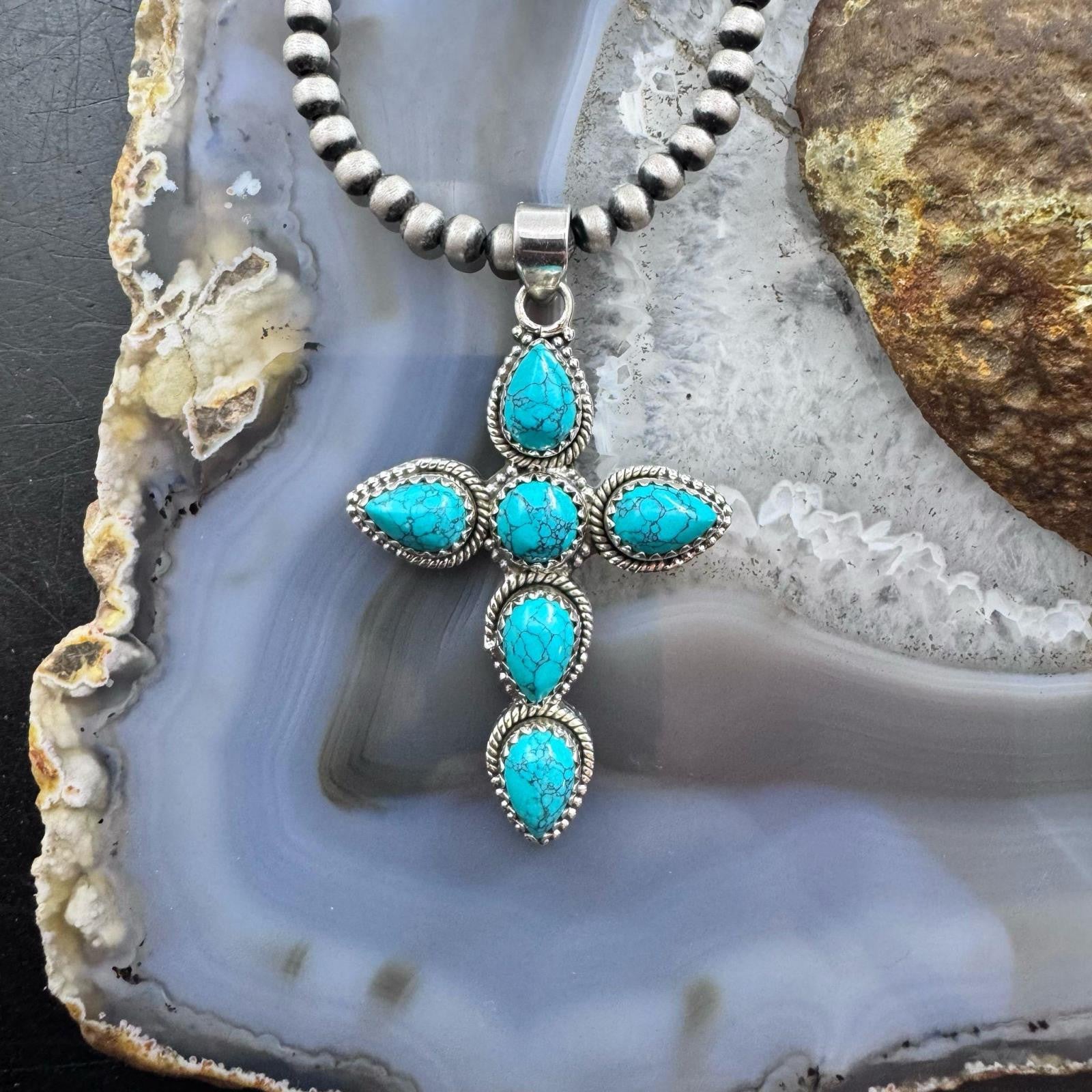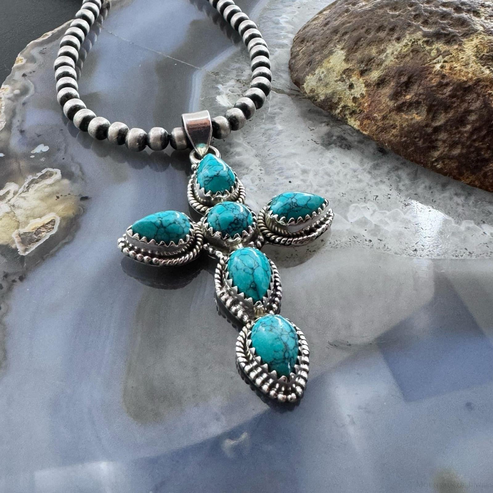 Sterling Silver Southwestern Style 6 Green Howlite Decorated Cross Pendant For Women