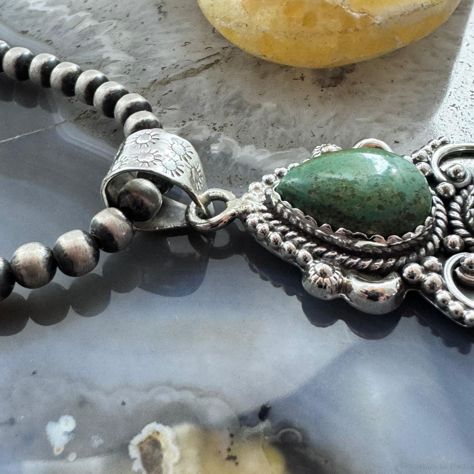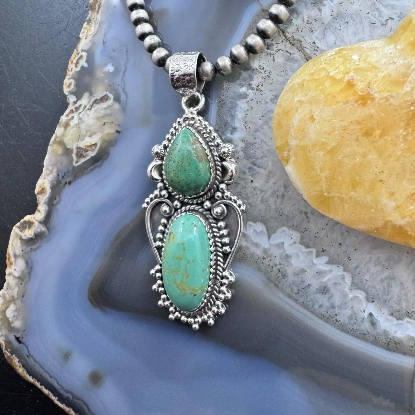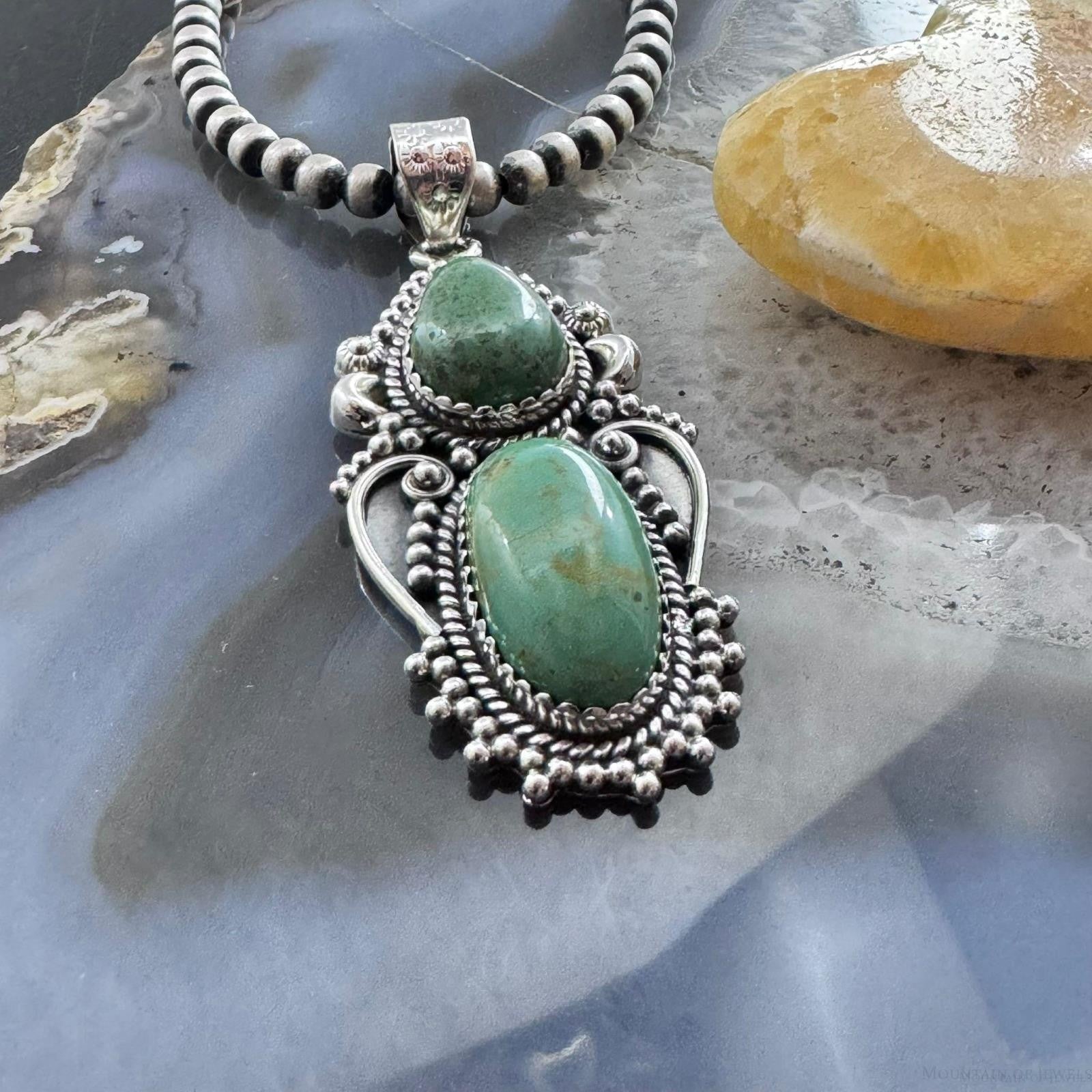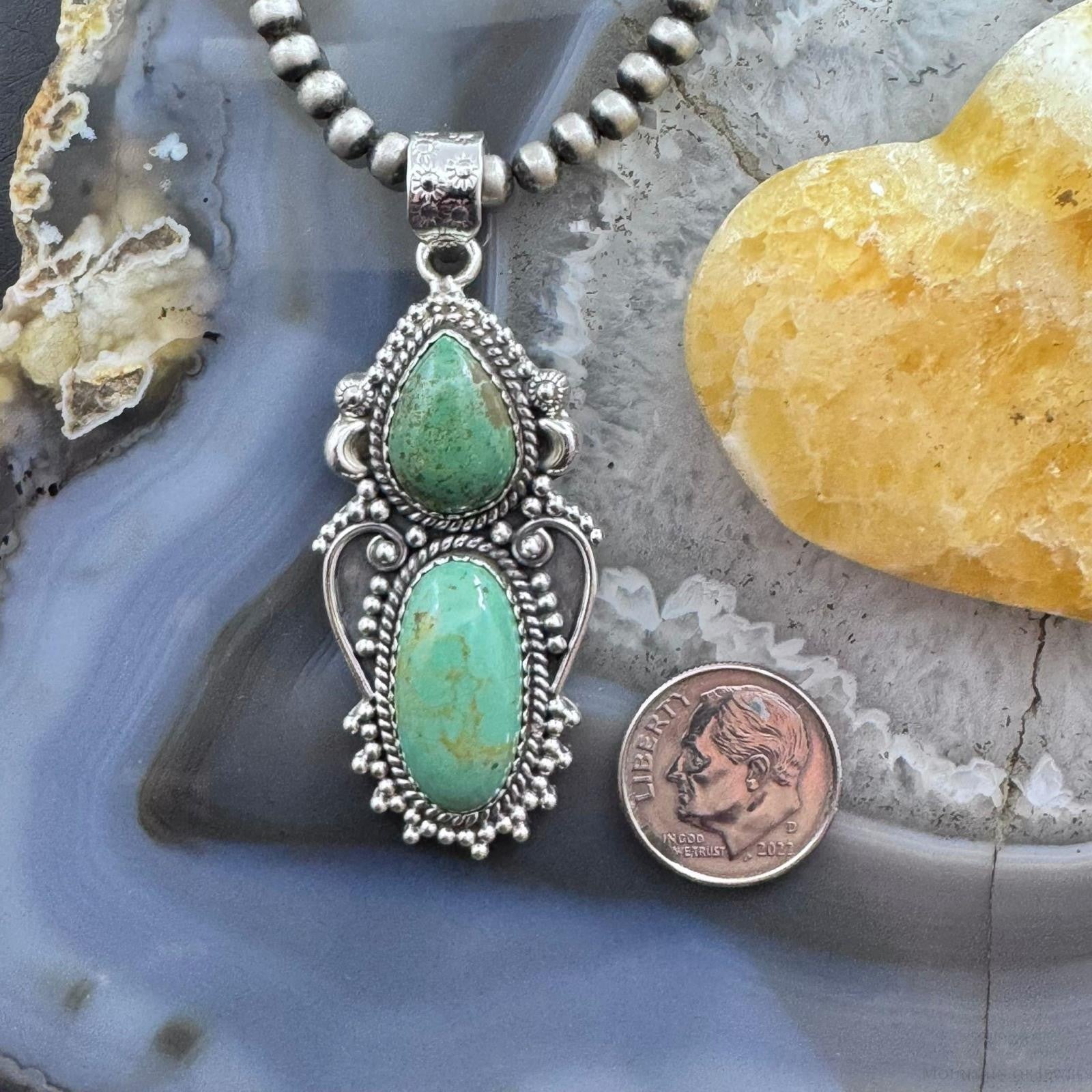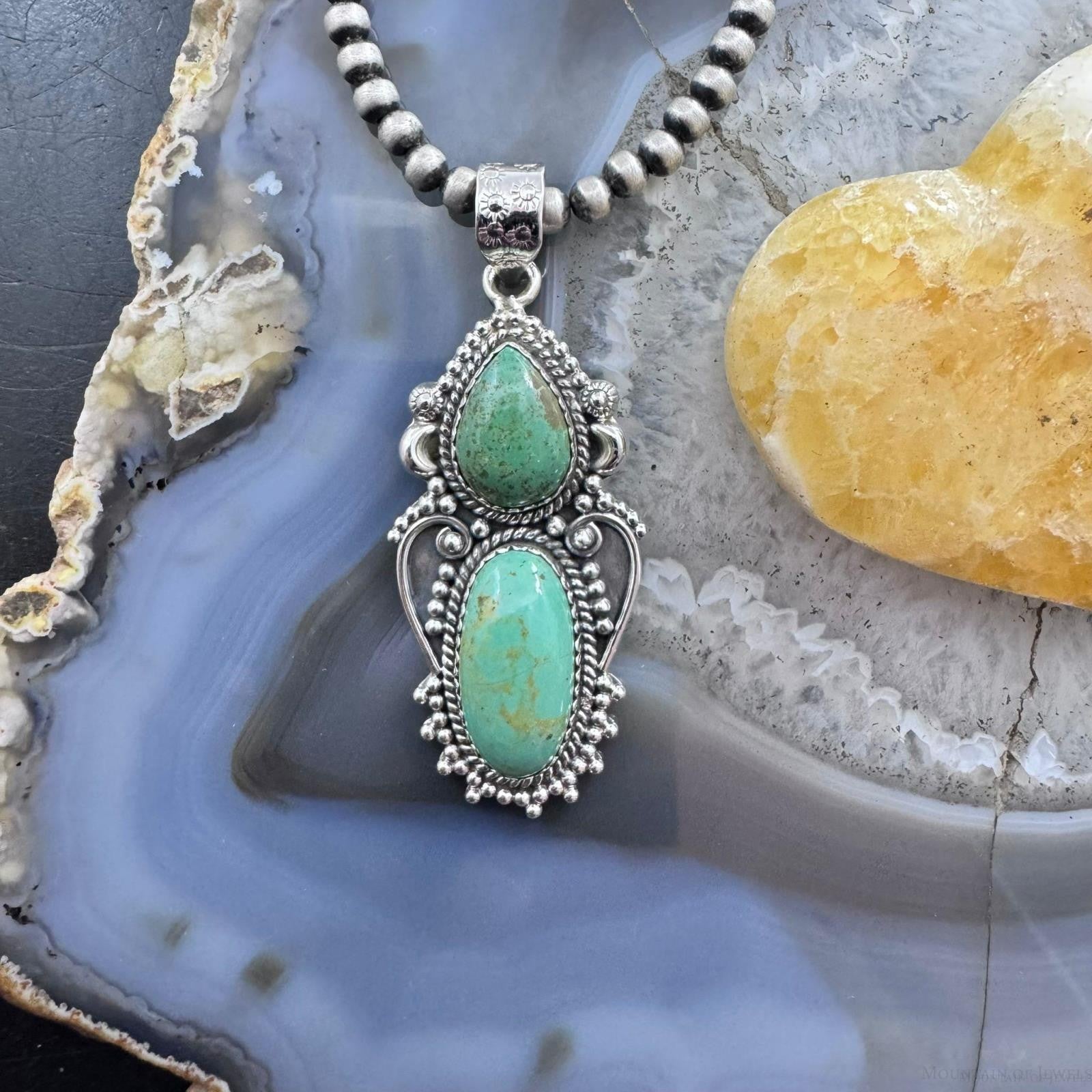 Sterling Silver Southwestern Style 2 Green Turquoise Decorated Pendant For Women