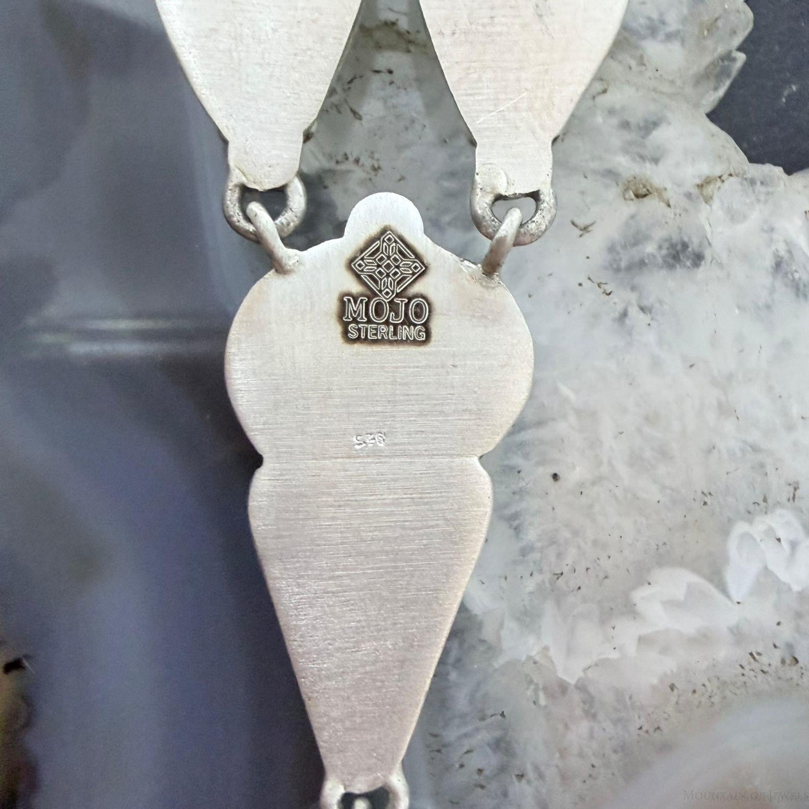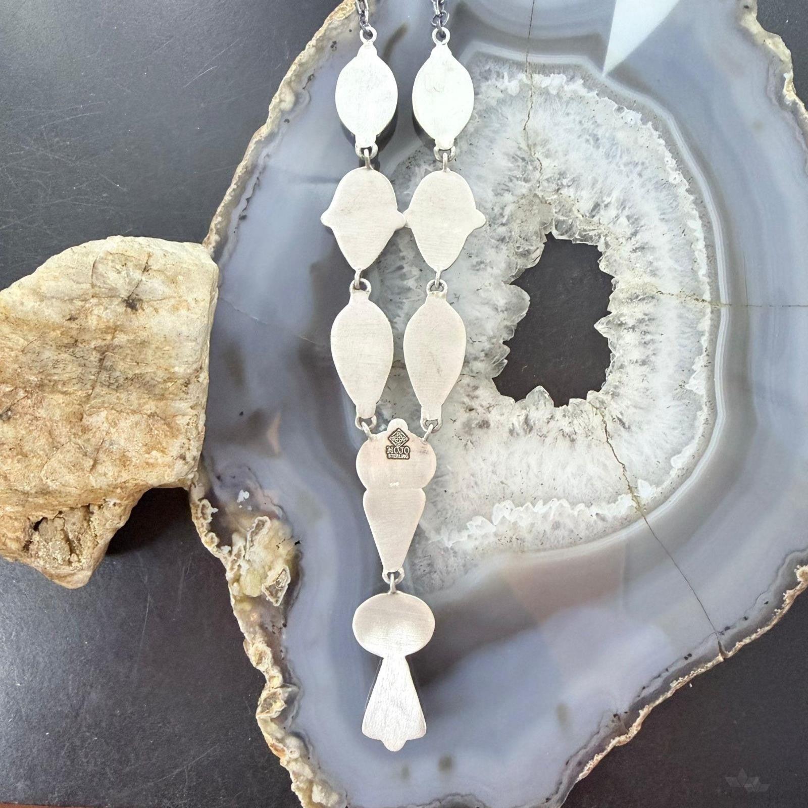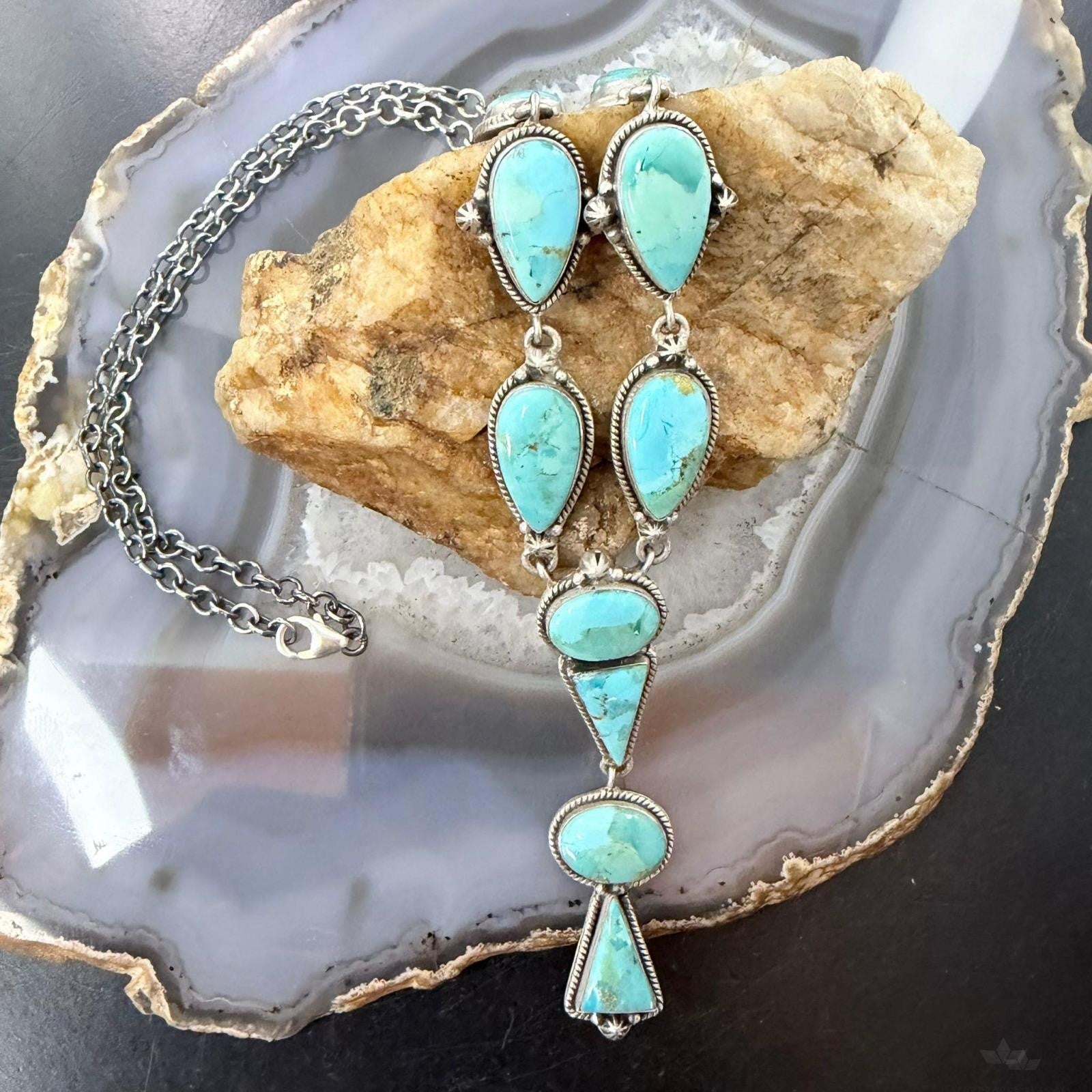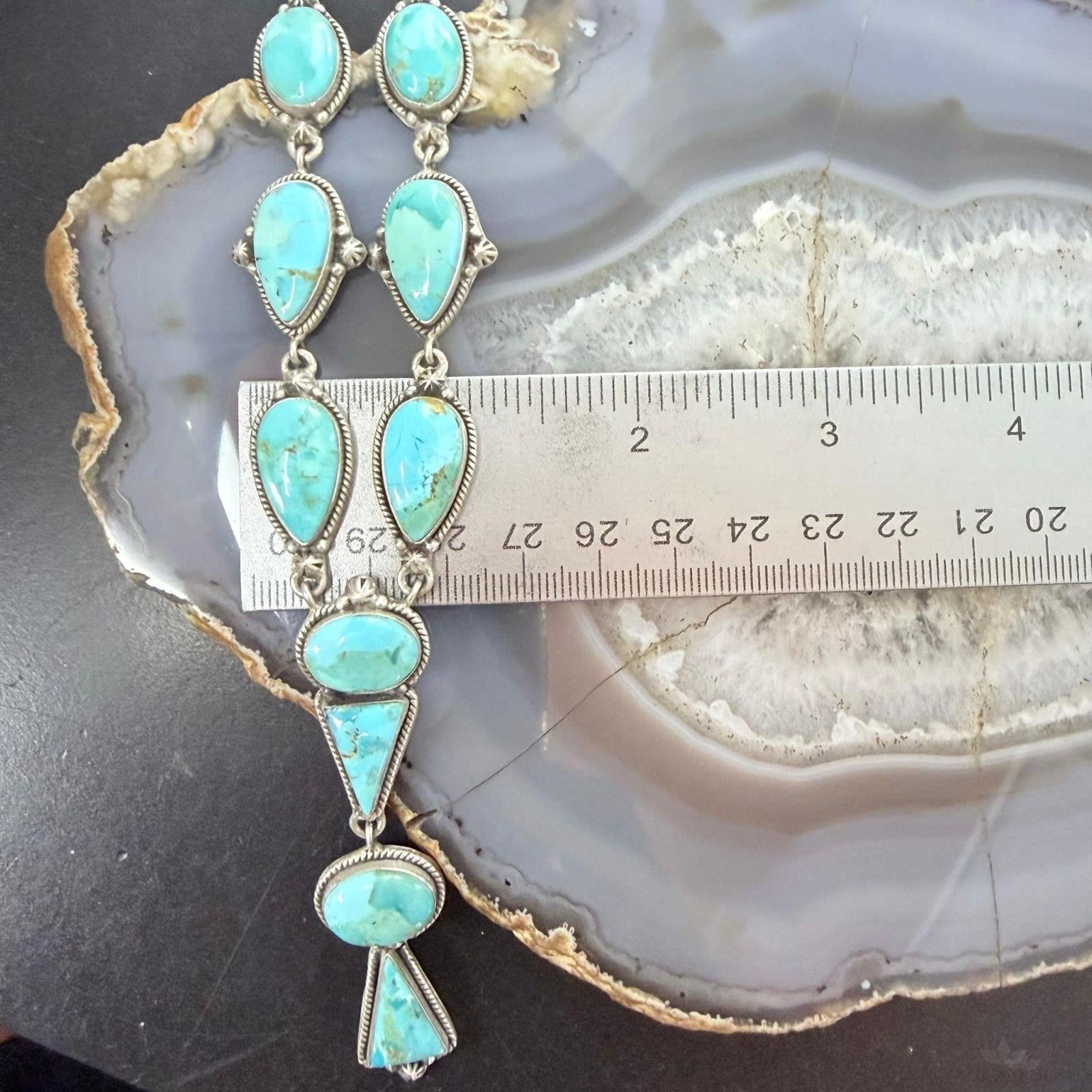 Stylish Sterling Silver Southwestern Style Teardrop, Oval, and Triangular Mohave Turquoise Lariat Necklace For Women.
