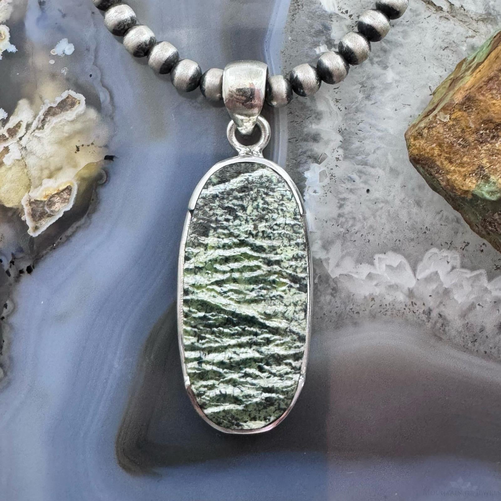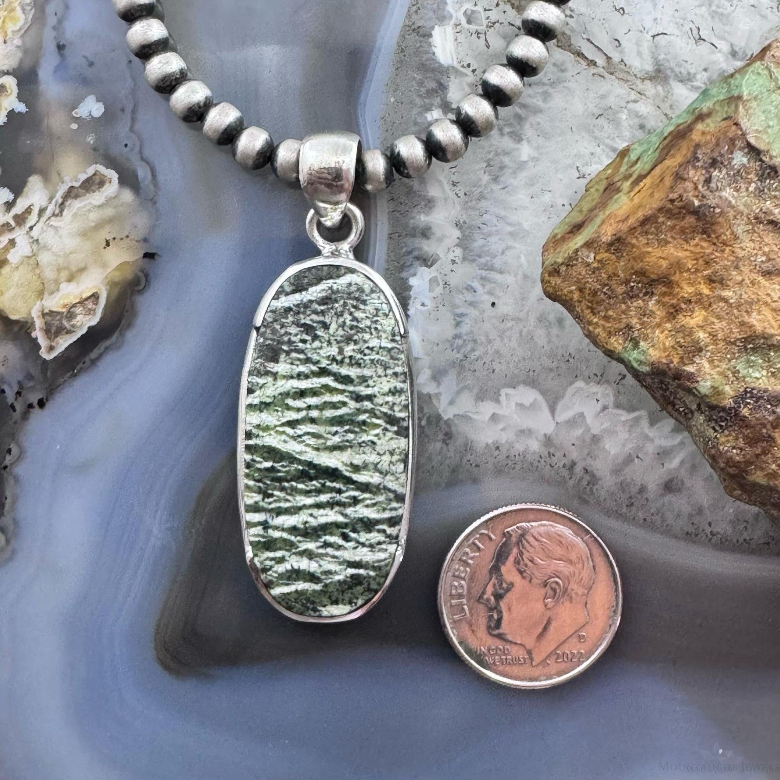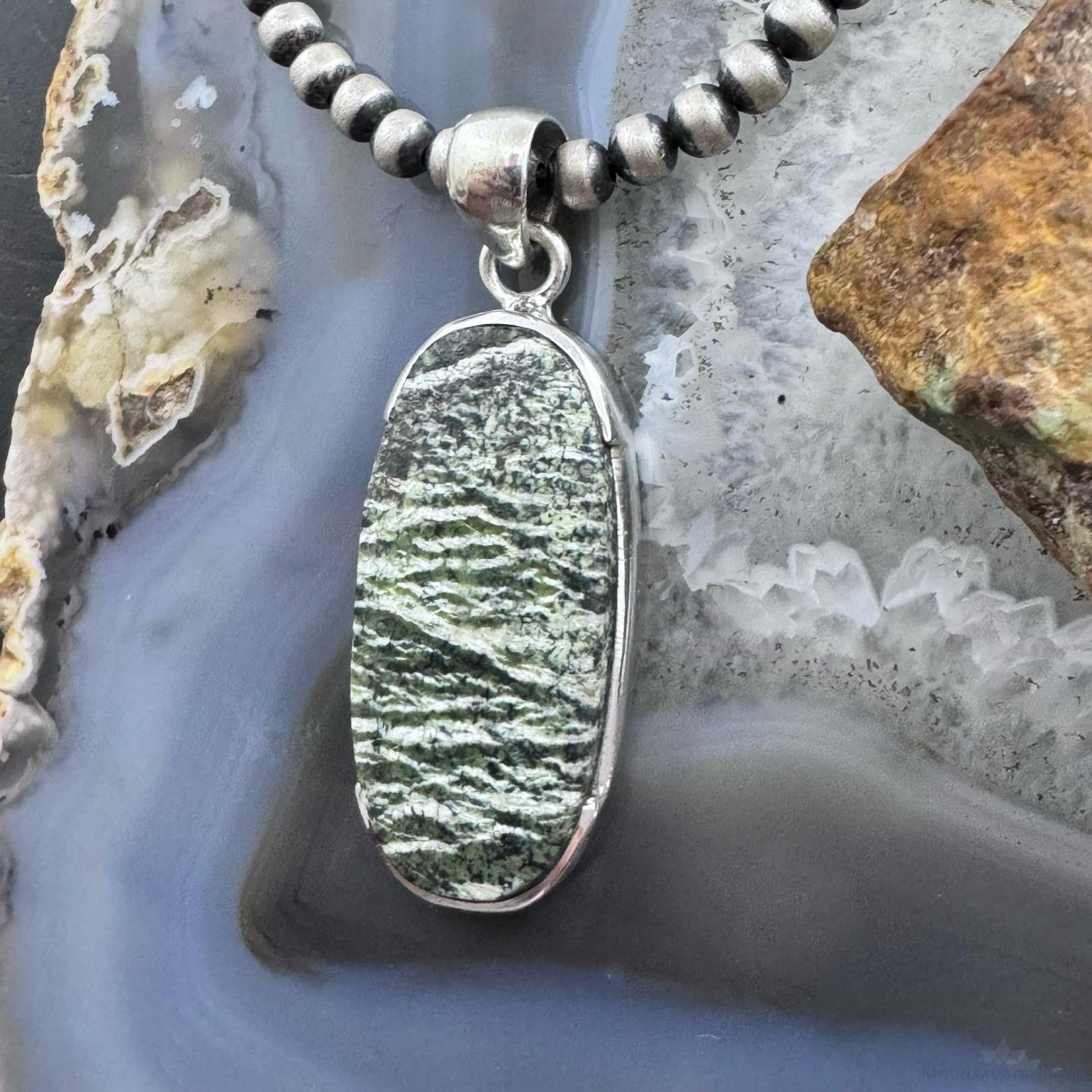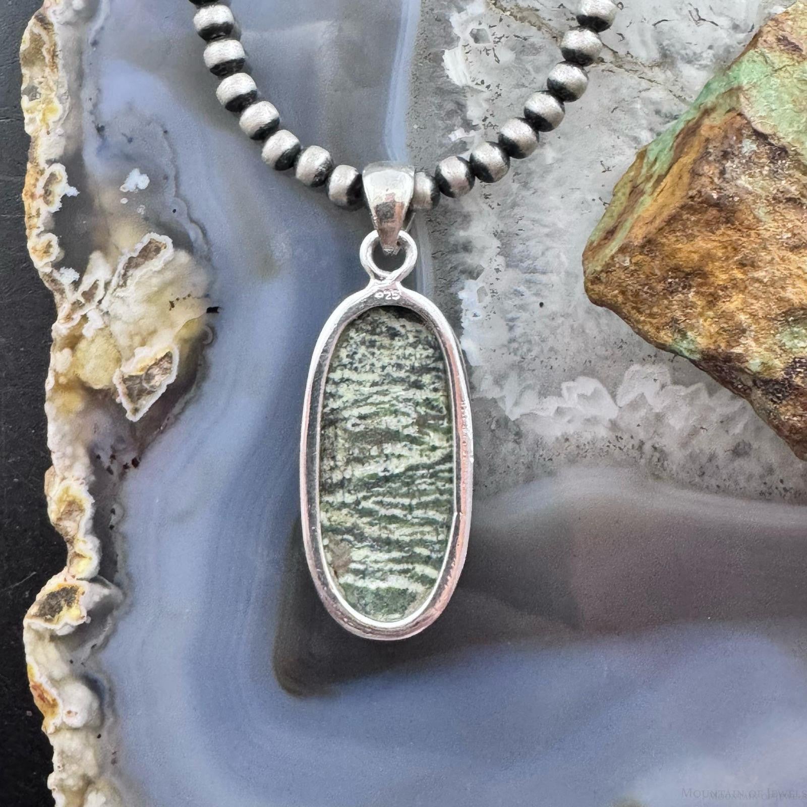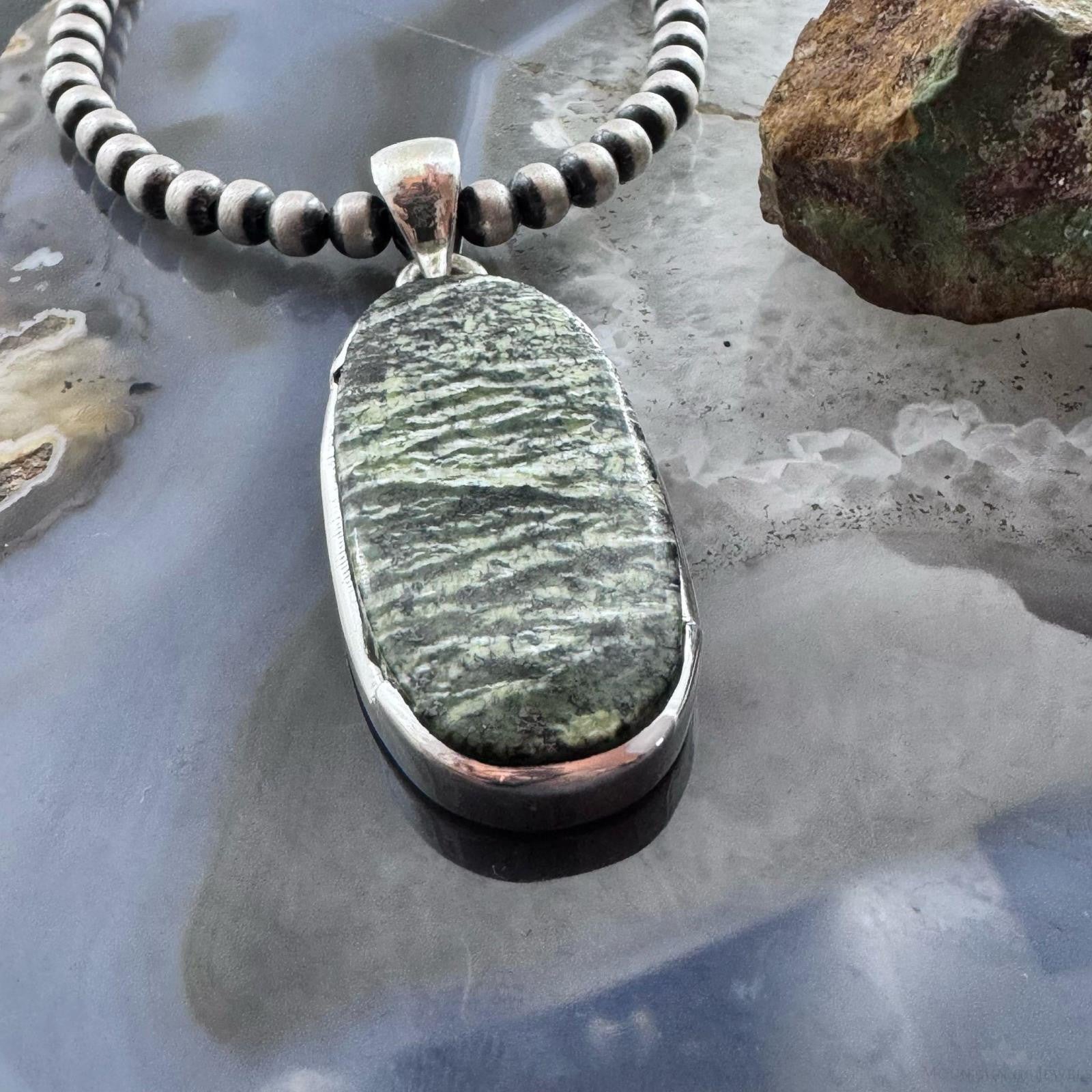 Sterling Silver Southwestern Style Oblong Oval Green Serpentine Pendant For Women