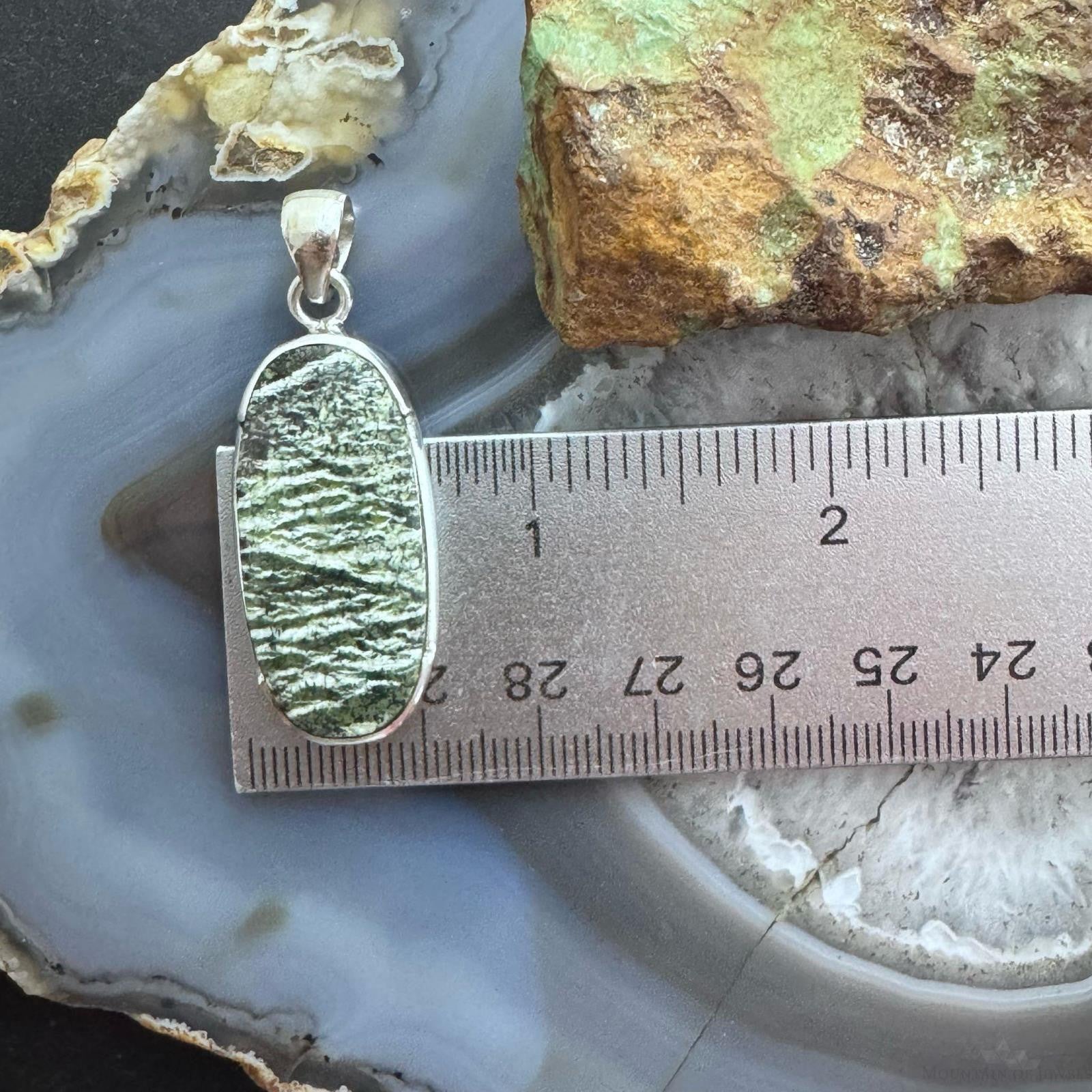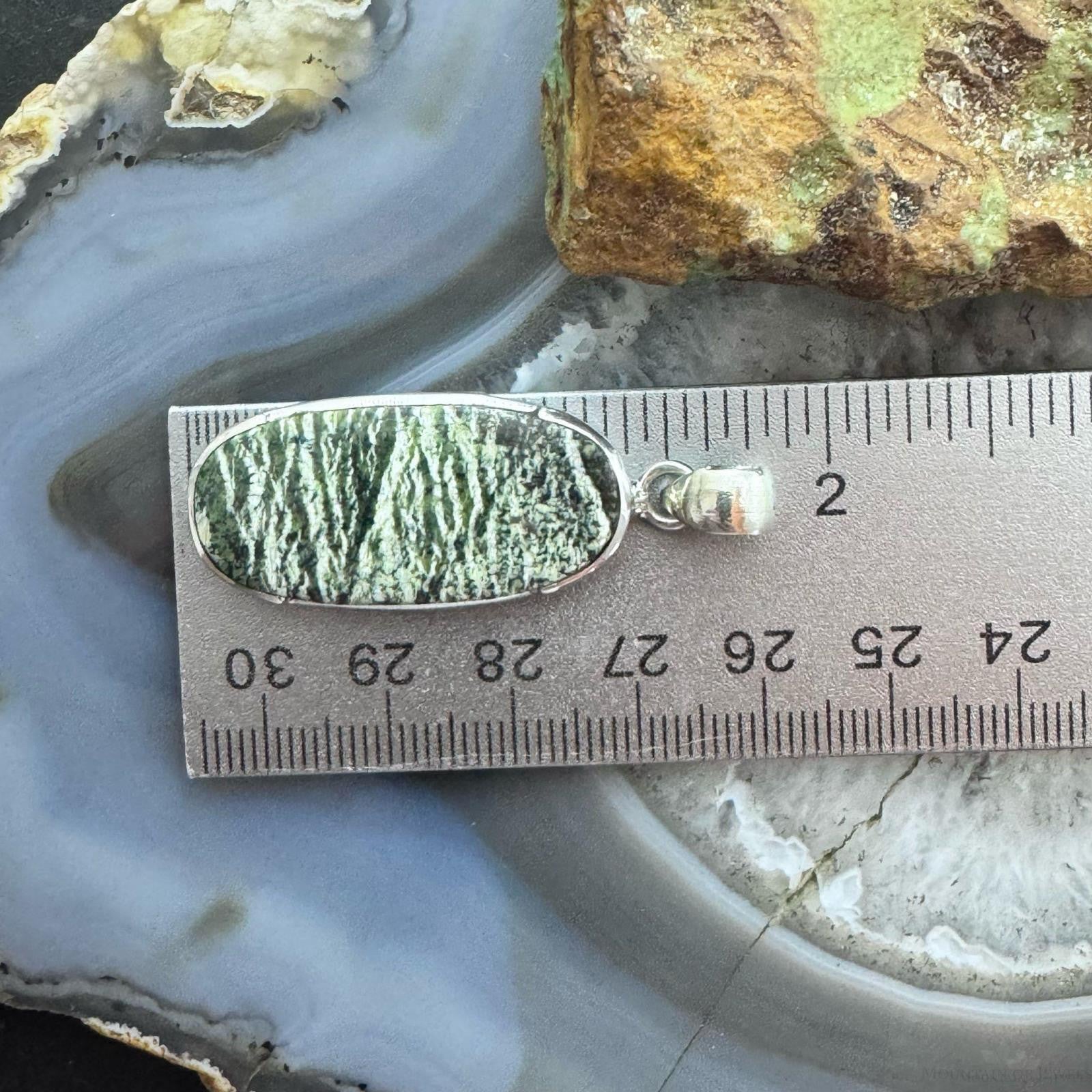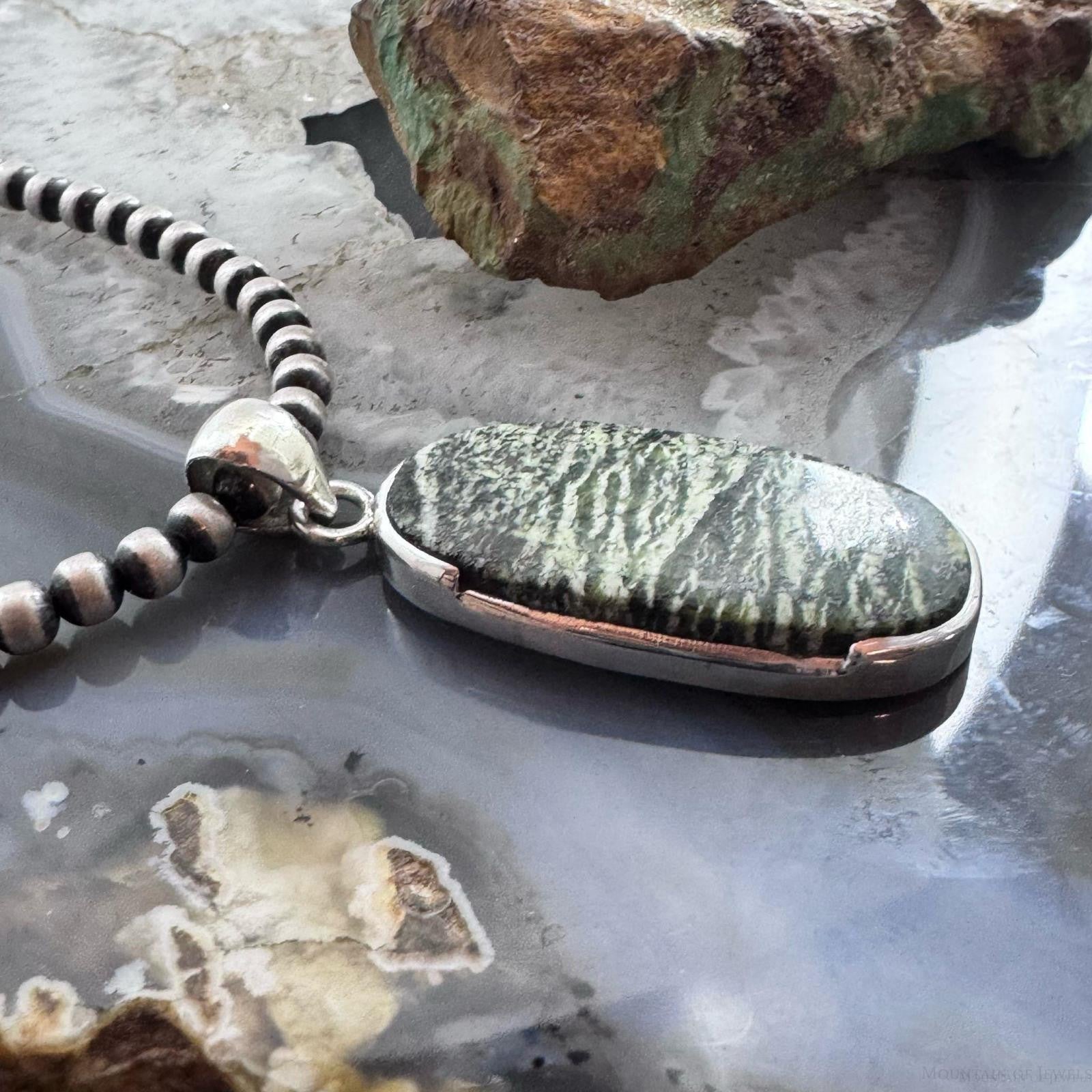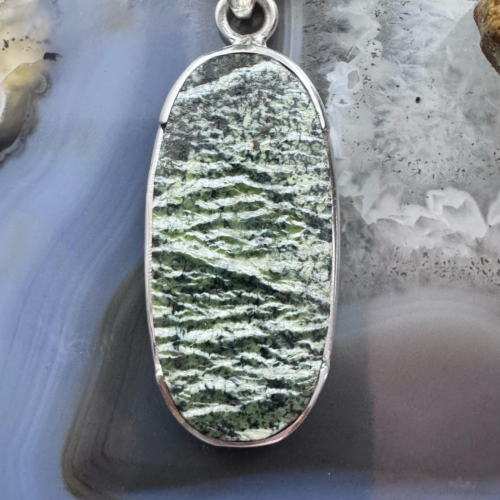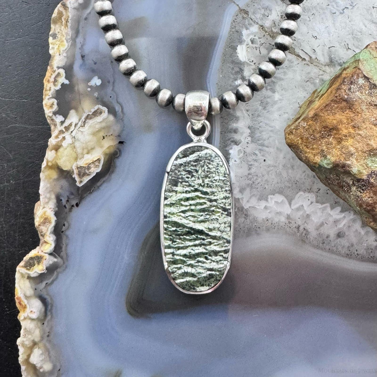 Sterling Silver Southwestern Style Oblong Oval Green Serpentine Pendant For Women