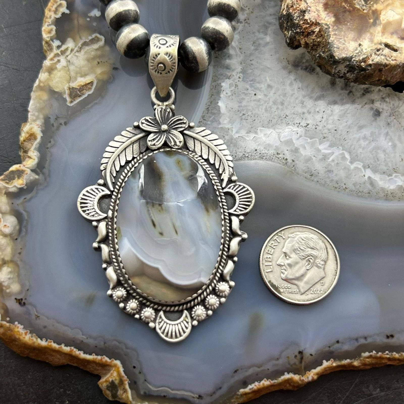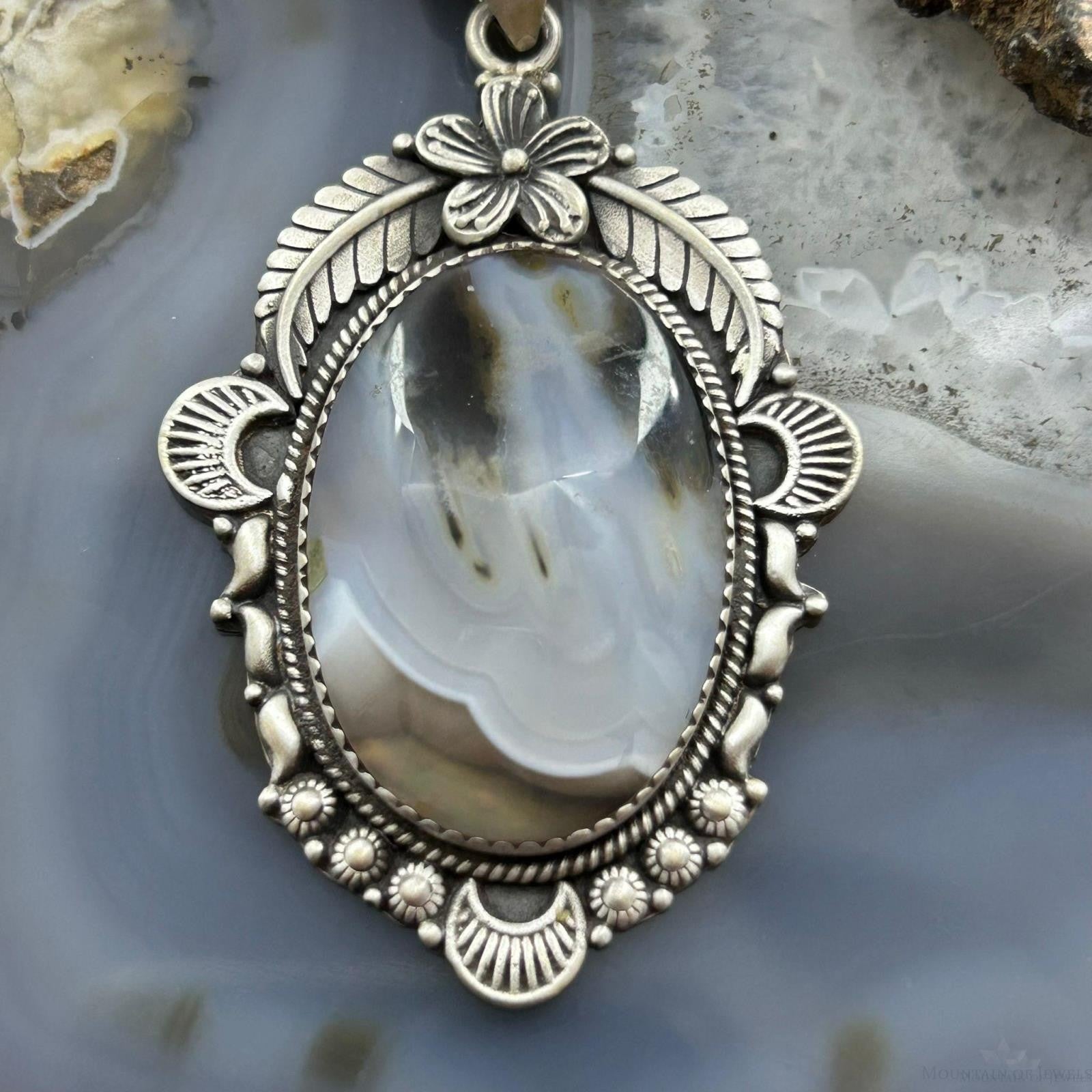 Sterling Silver Southwestern Style Oval Moss Agate Tube Decorated Pendant For Women