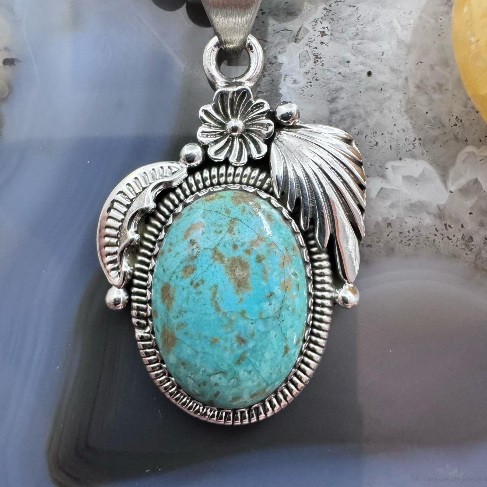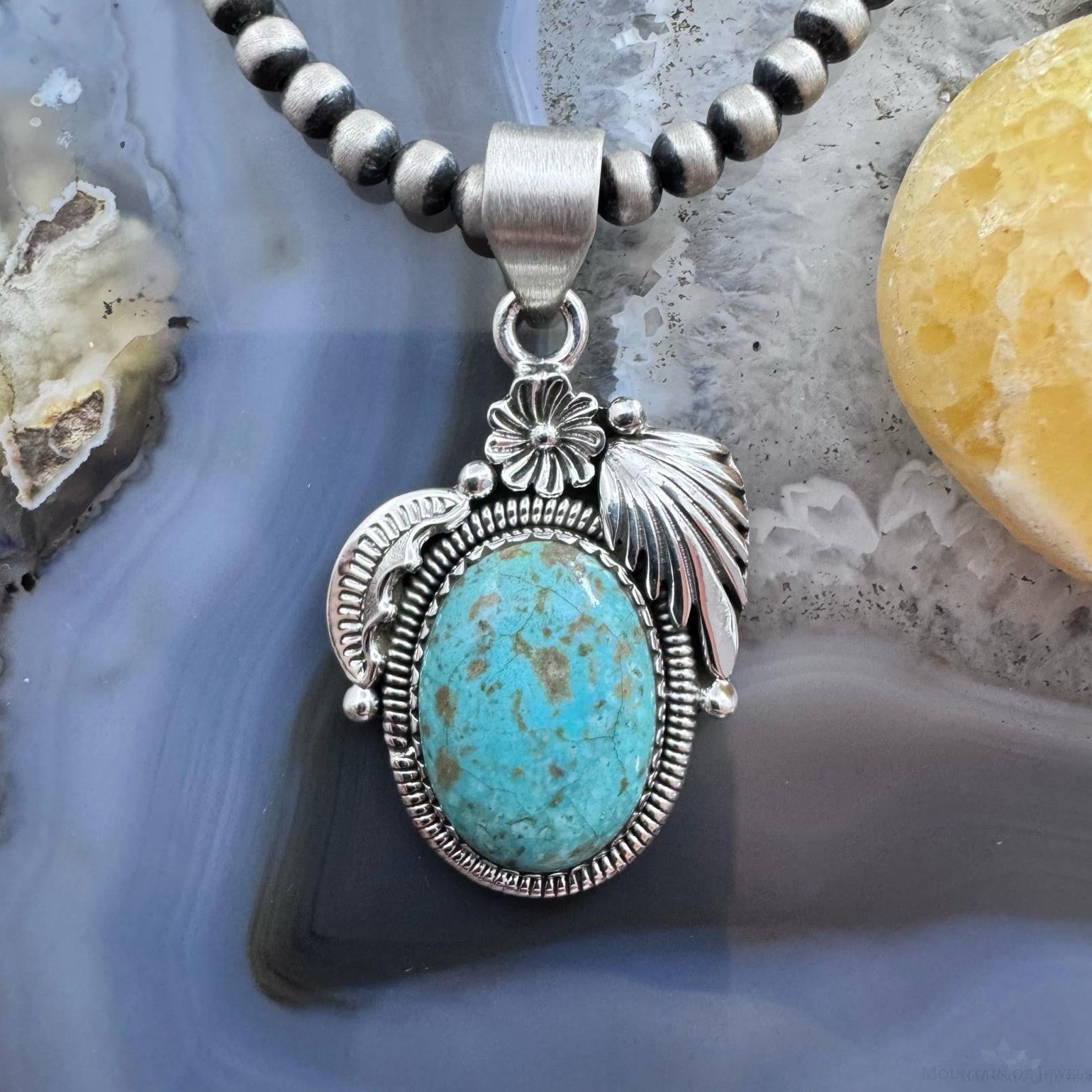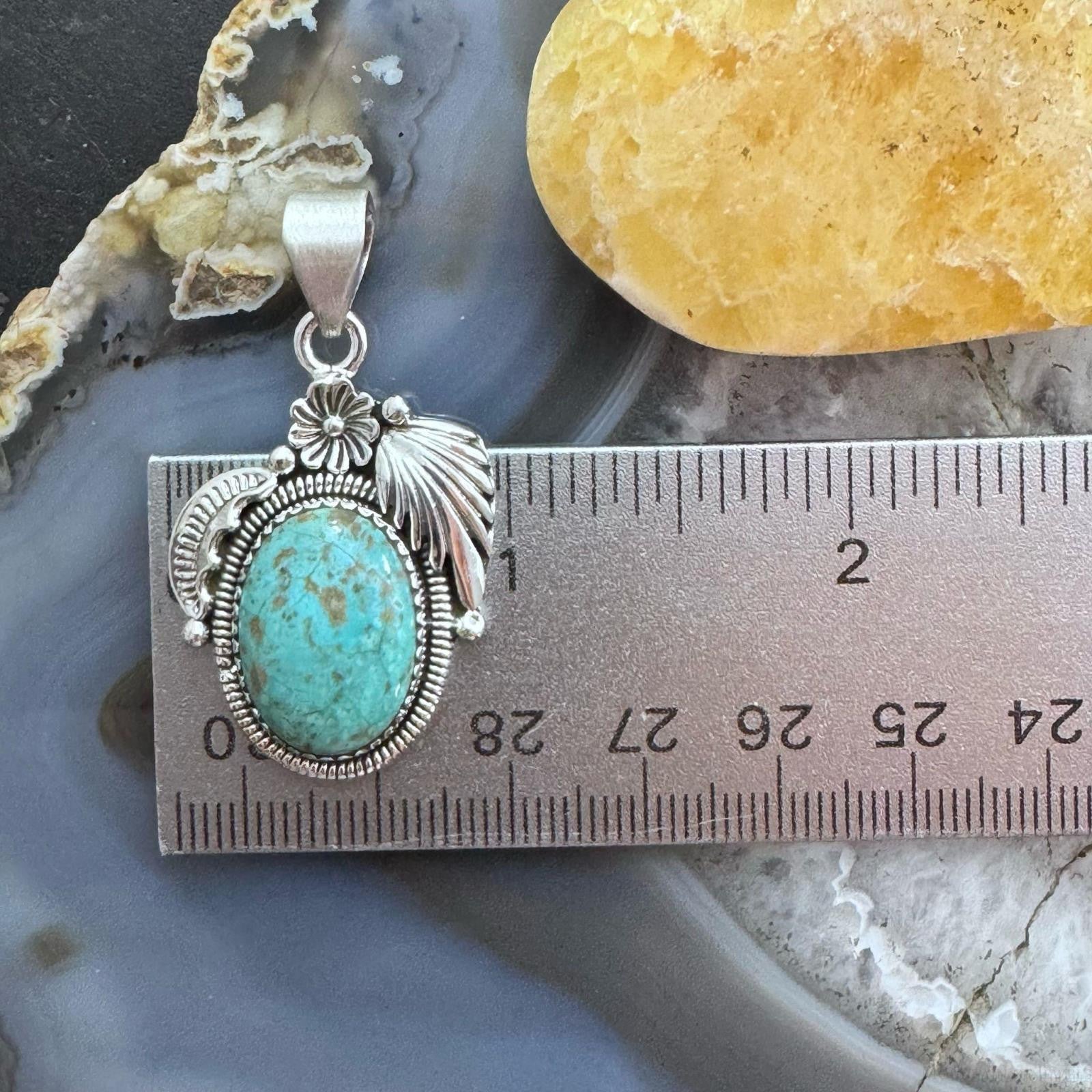 Sterling Silver Southwestern Style Oval Turquoise Leaves Decorated Pendant For Women