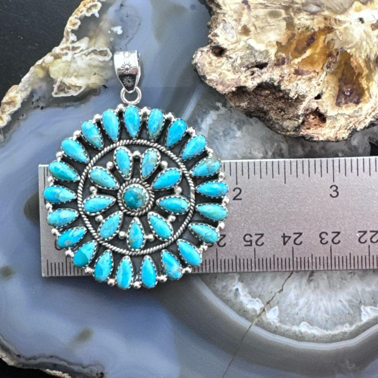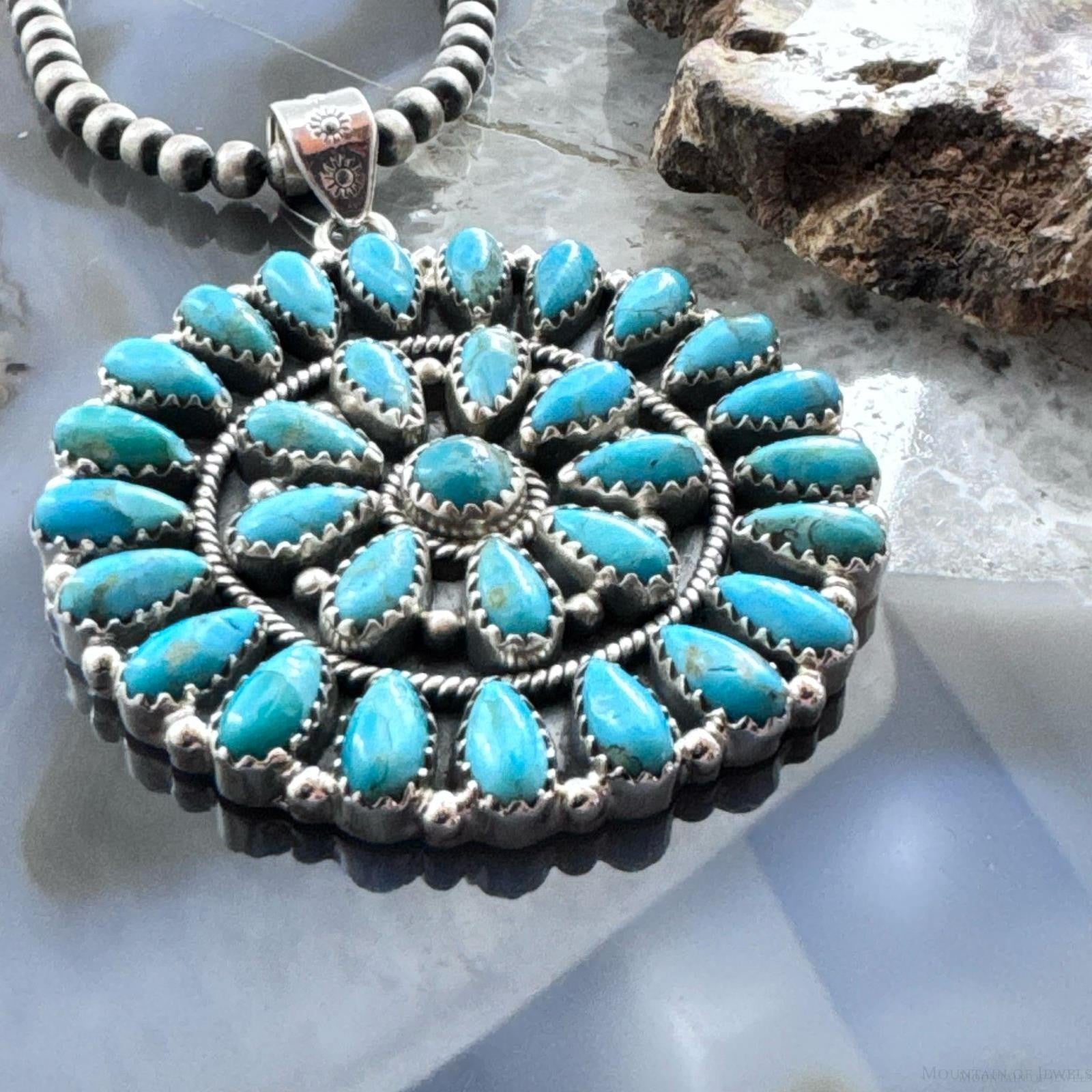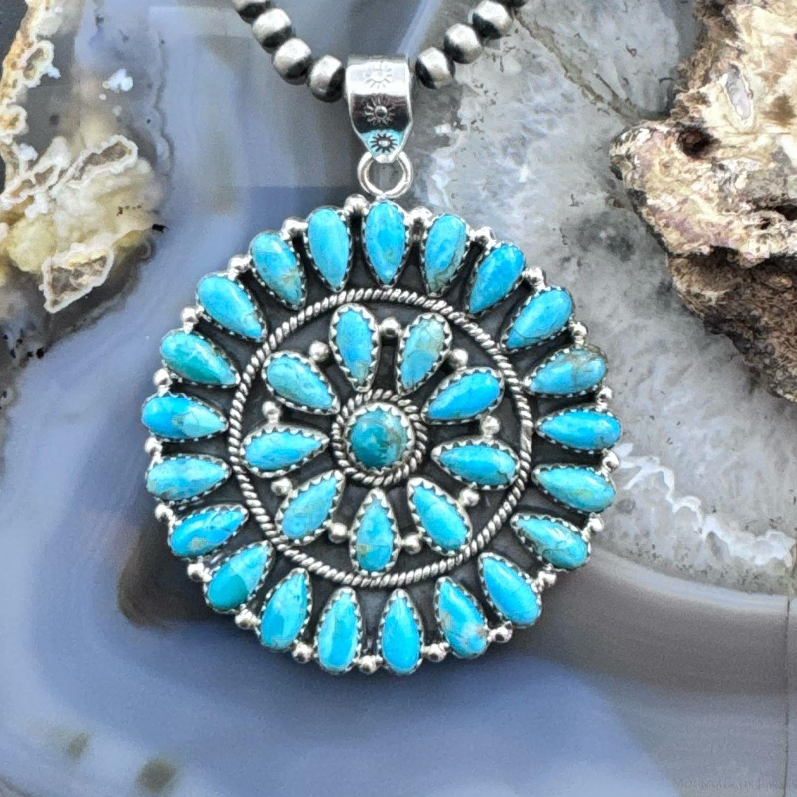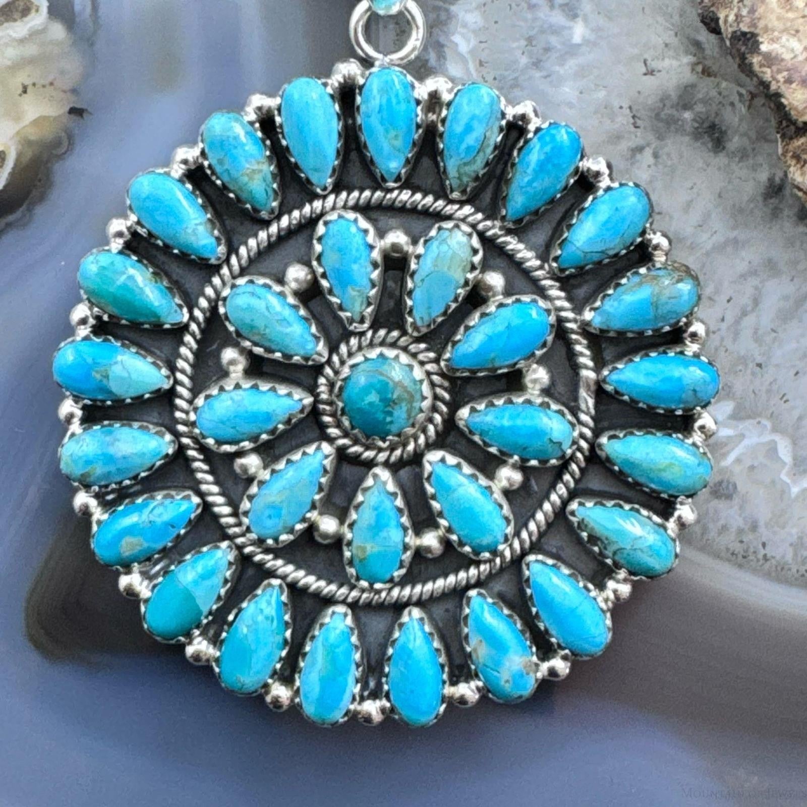 Sterling Silver Southwestern Style Teardrop Turquoise Round Cluster Pendant For Women