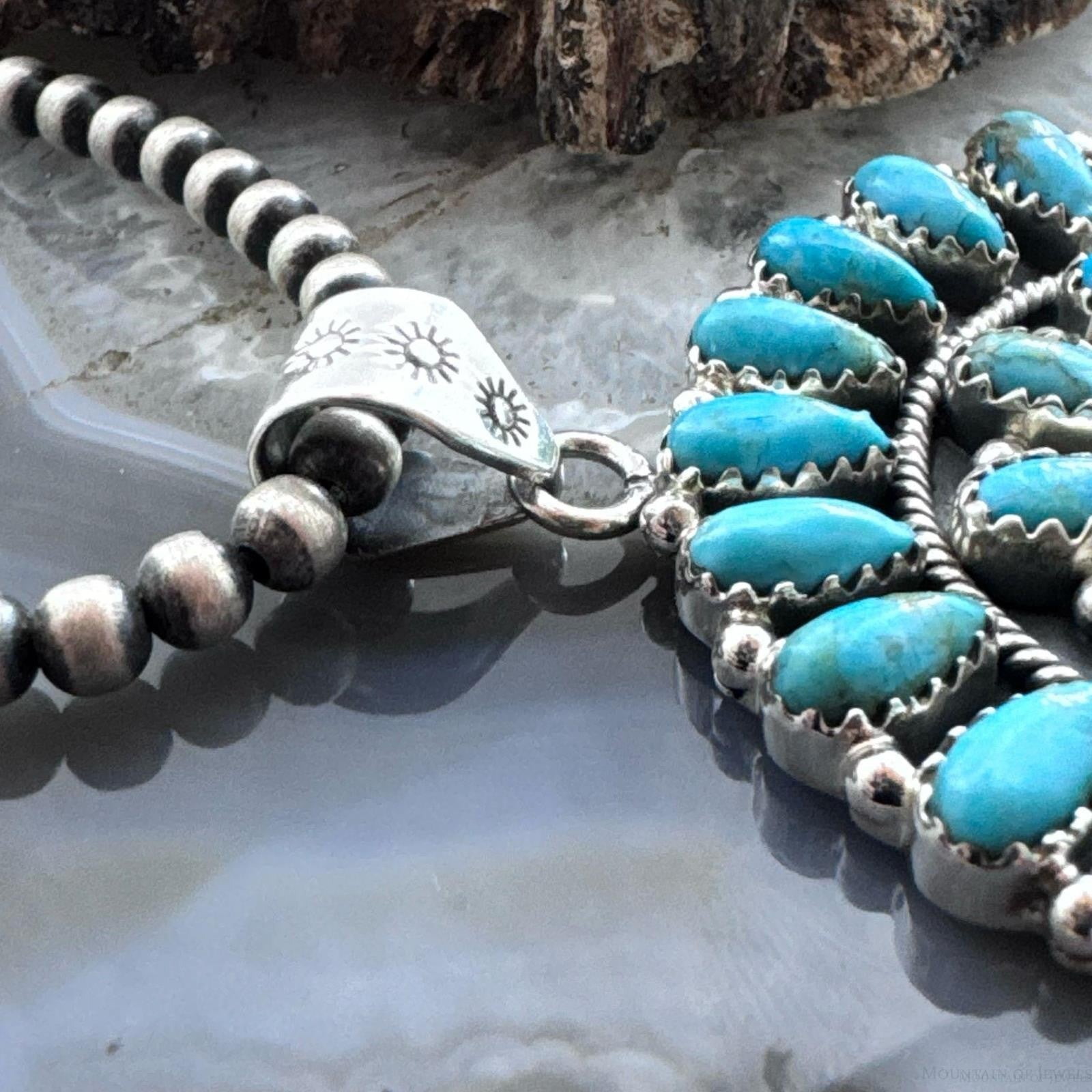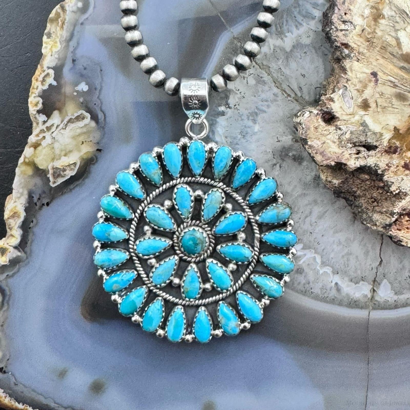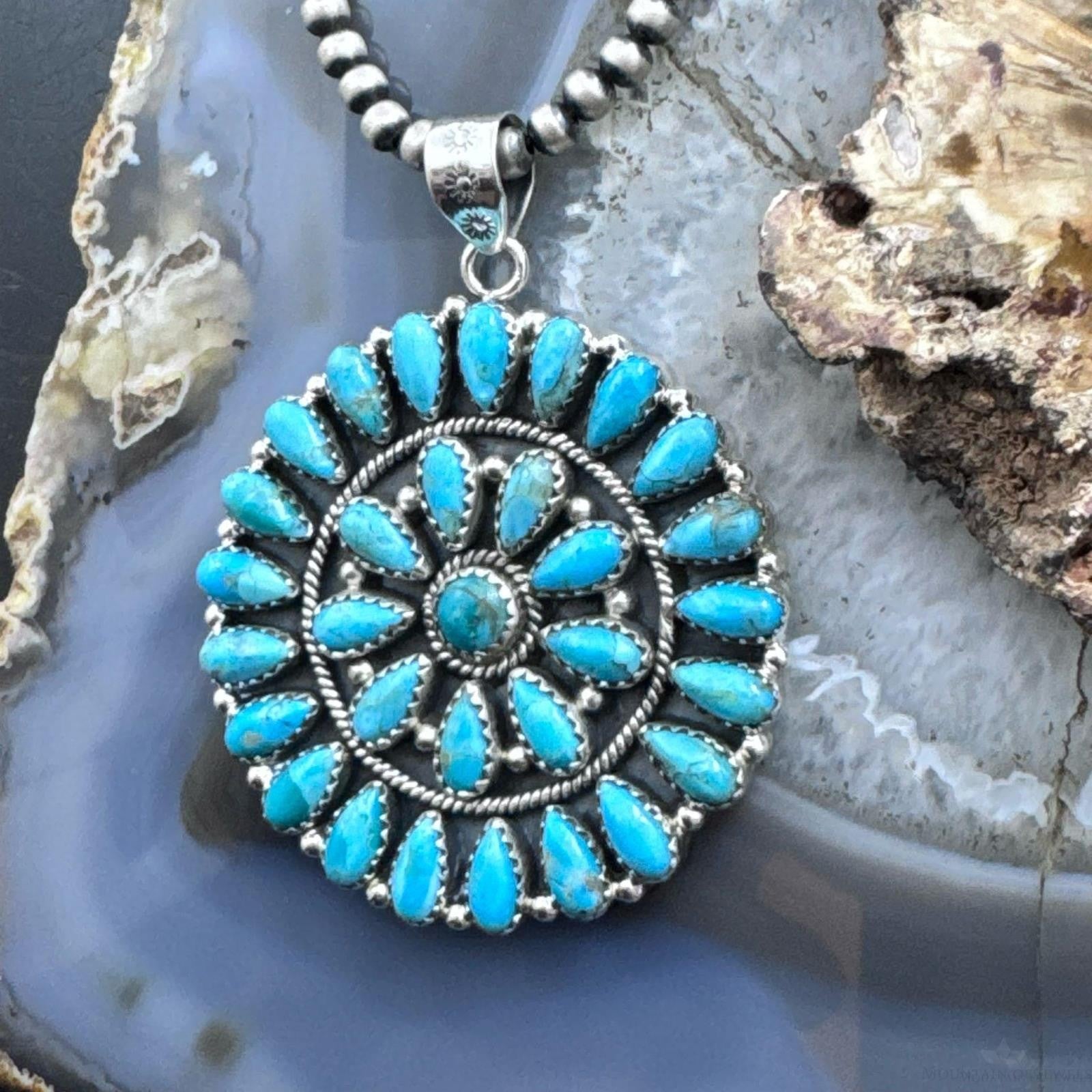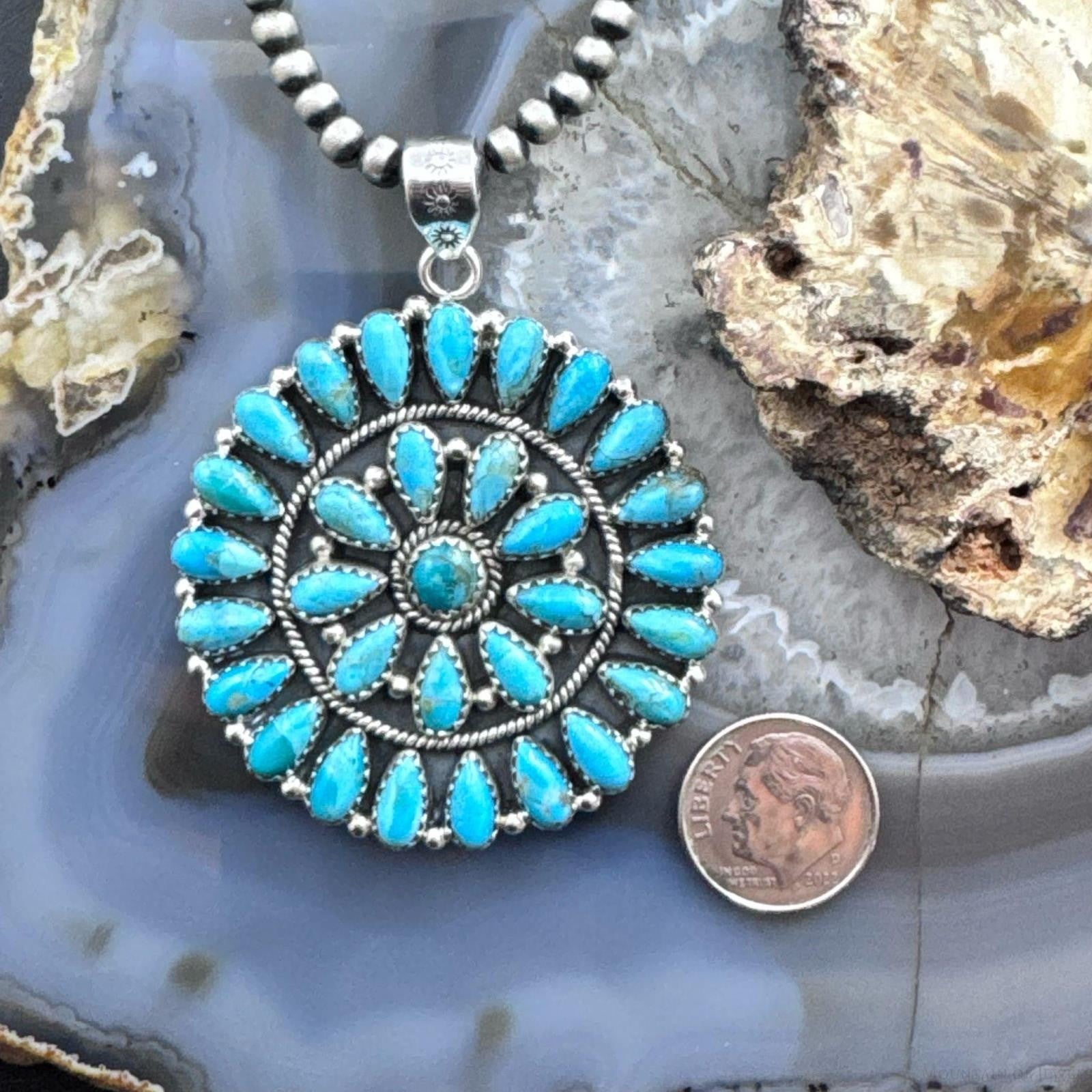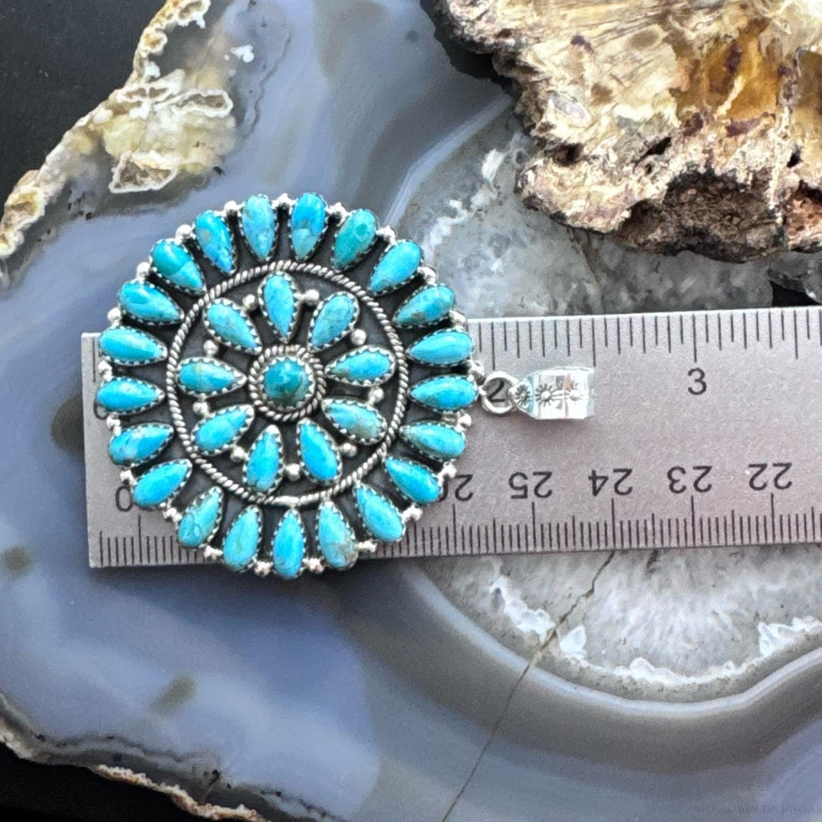 Sterling Silver Southwestern Style Teardrop Turquoise Round Cluster Pendant For Women