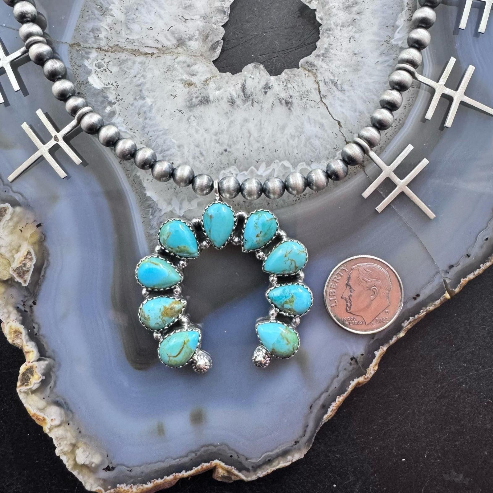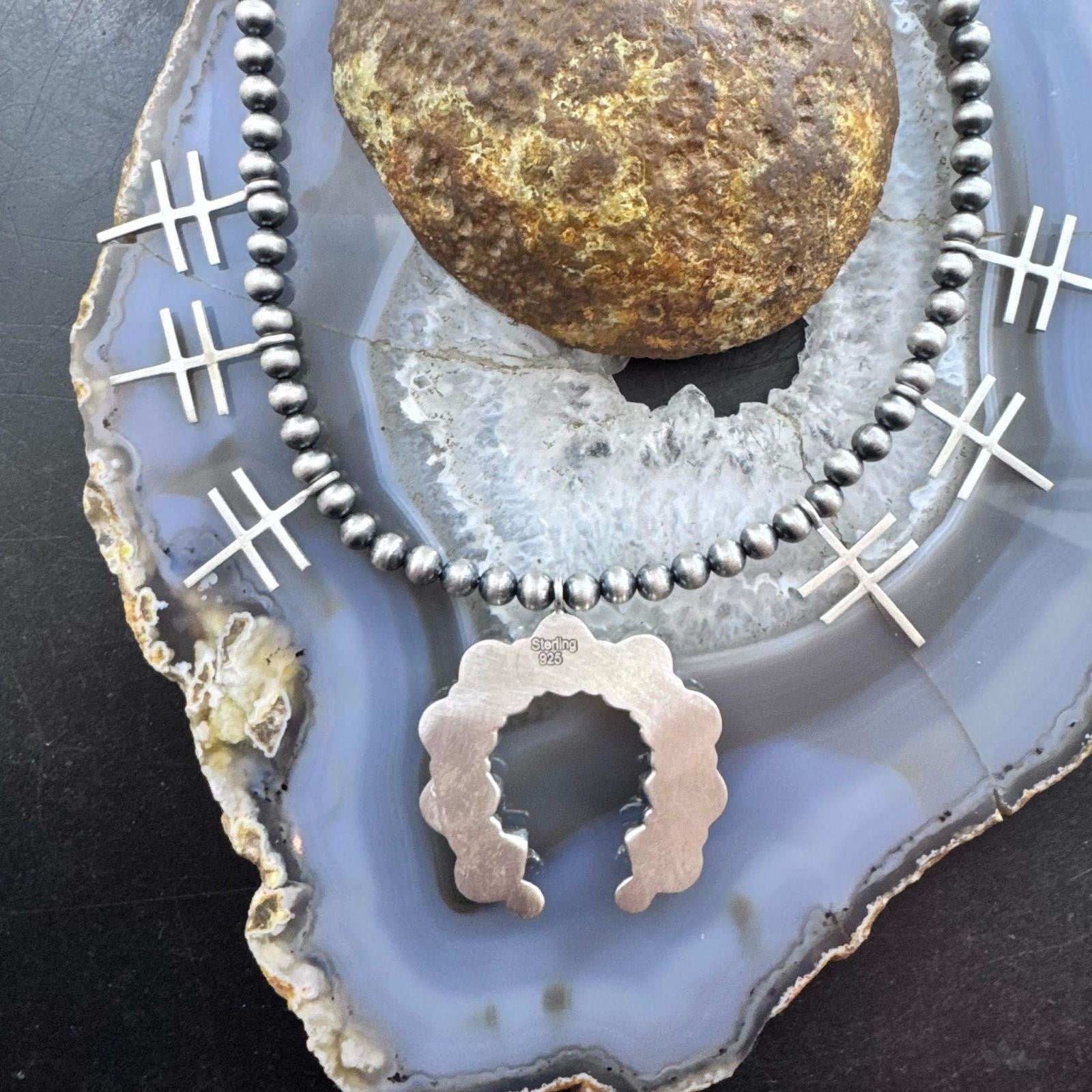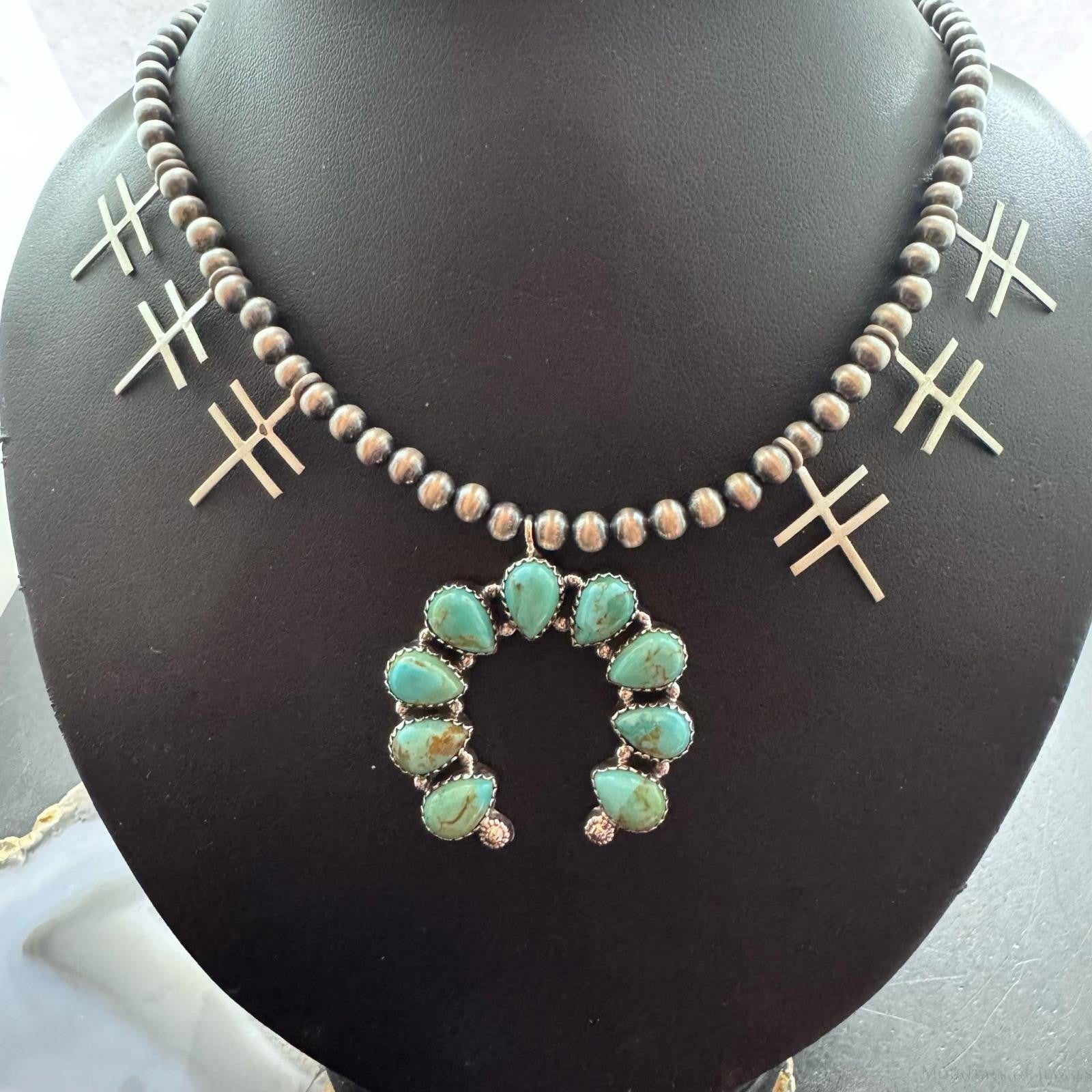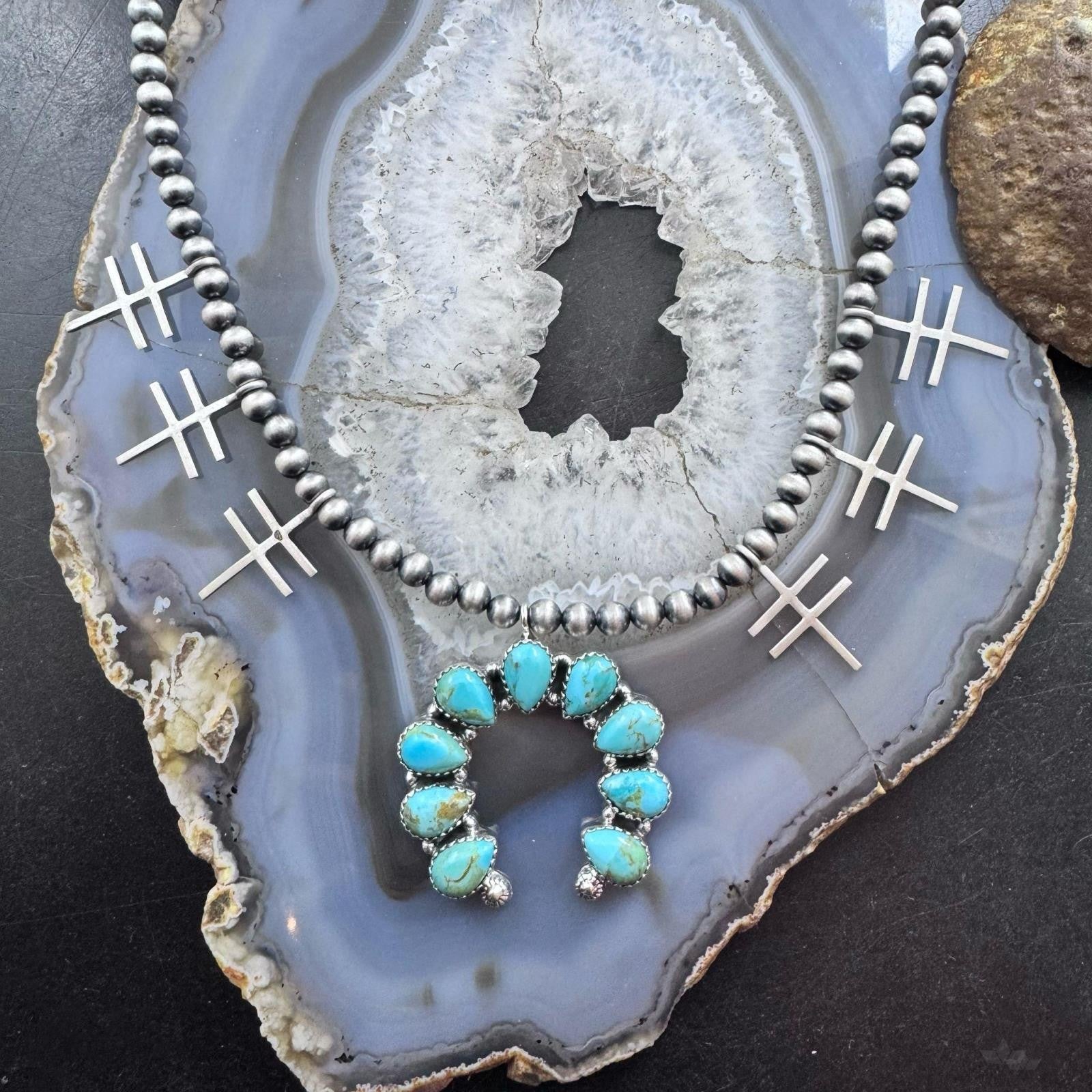 Sterling Silver Southwestern Style Turquoise Naja w/Native Cross Adjustable Navajo Pearl Beads Necklace For Women.