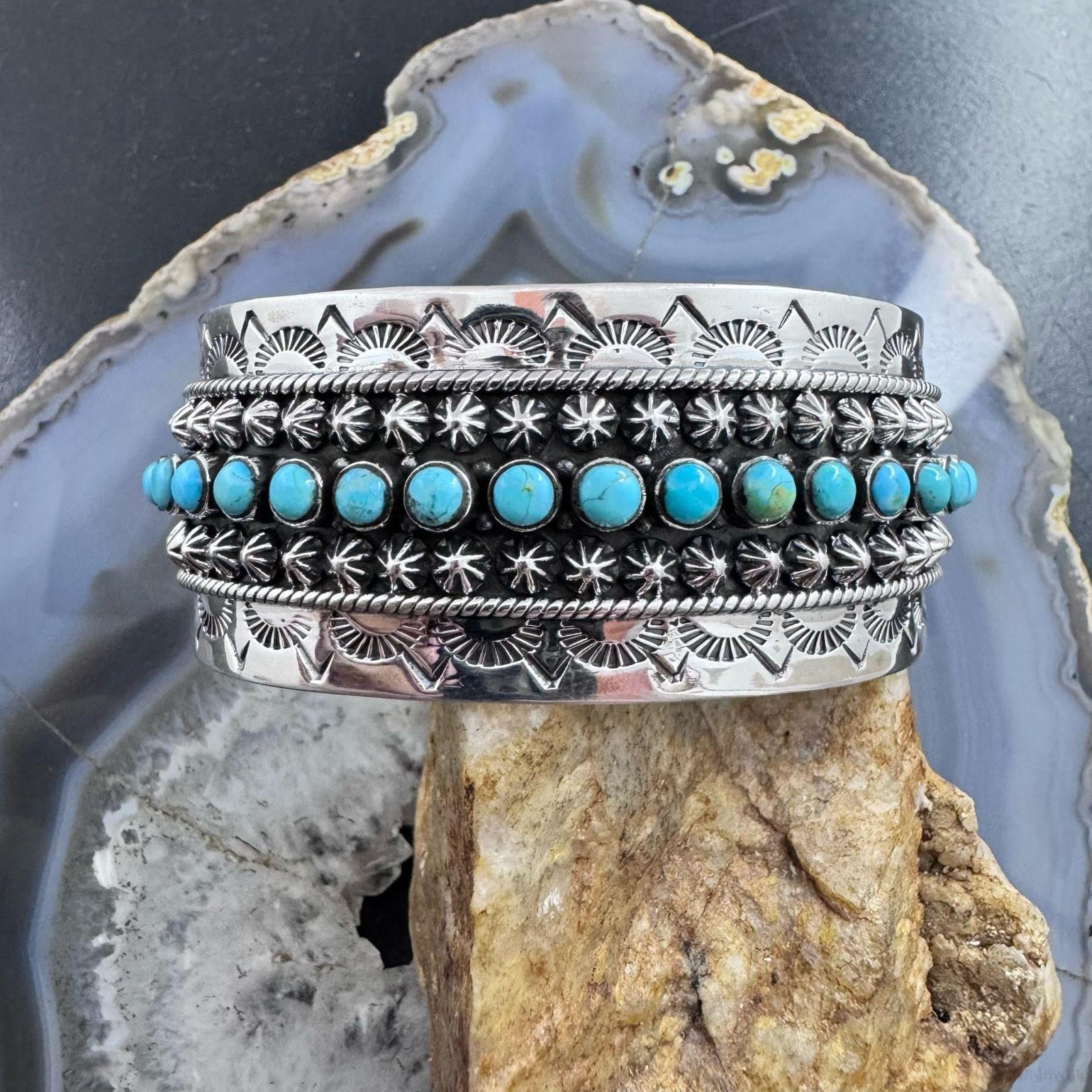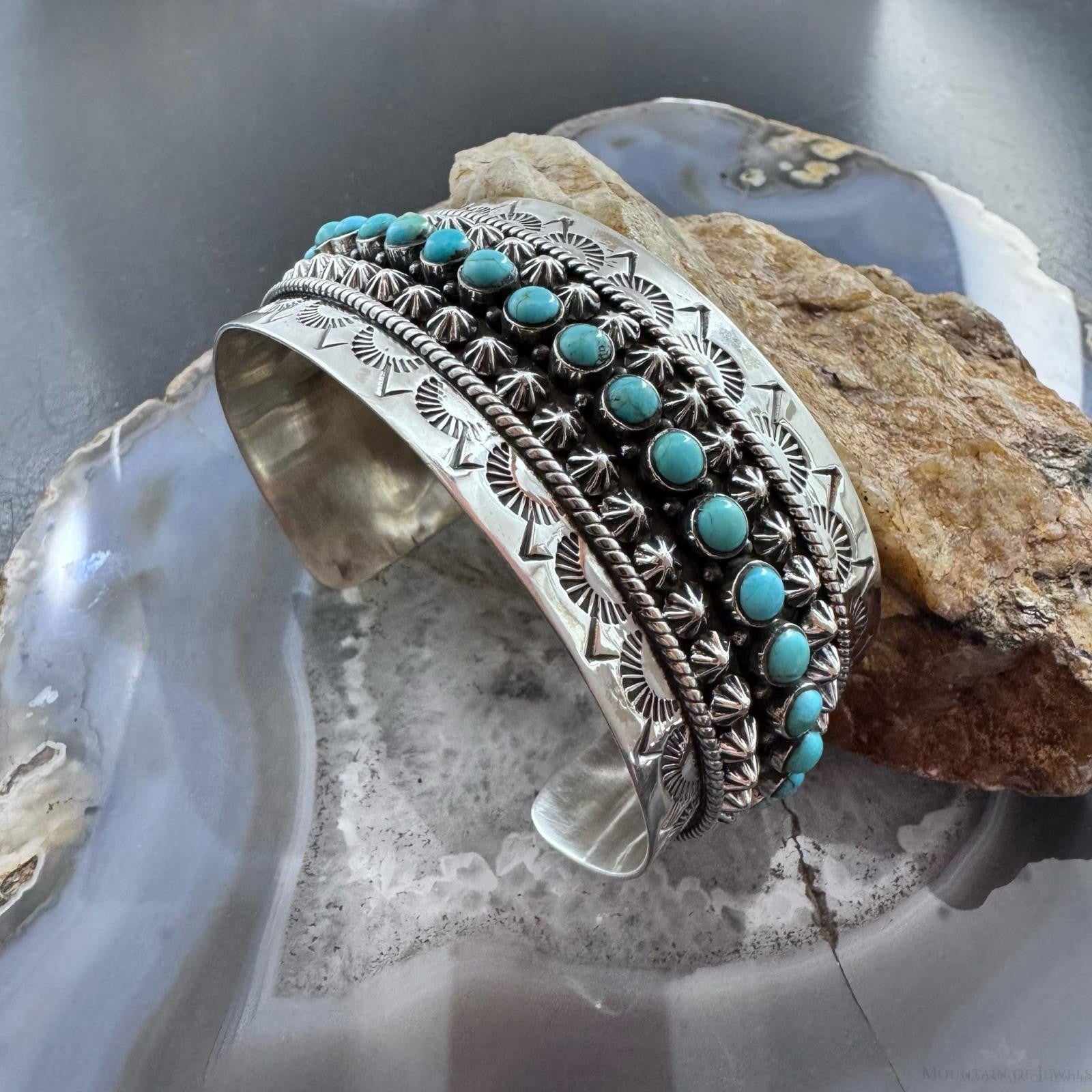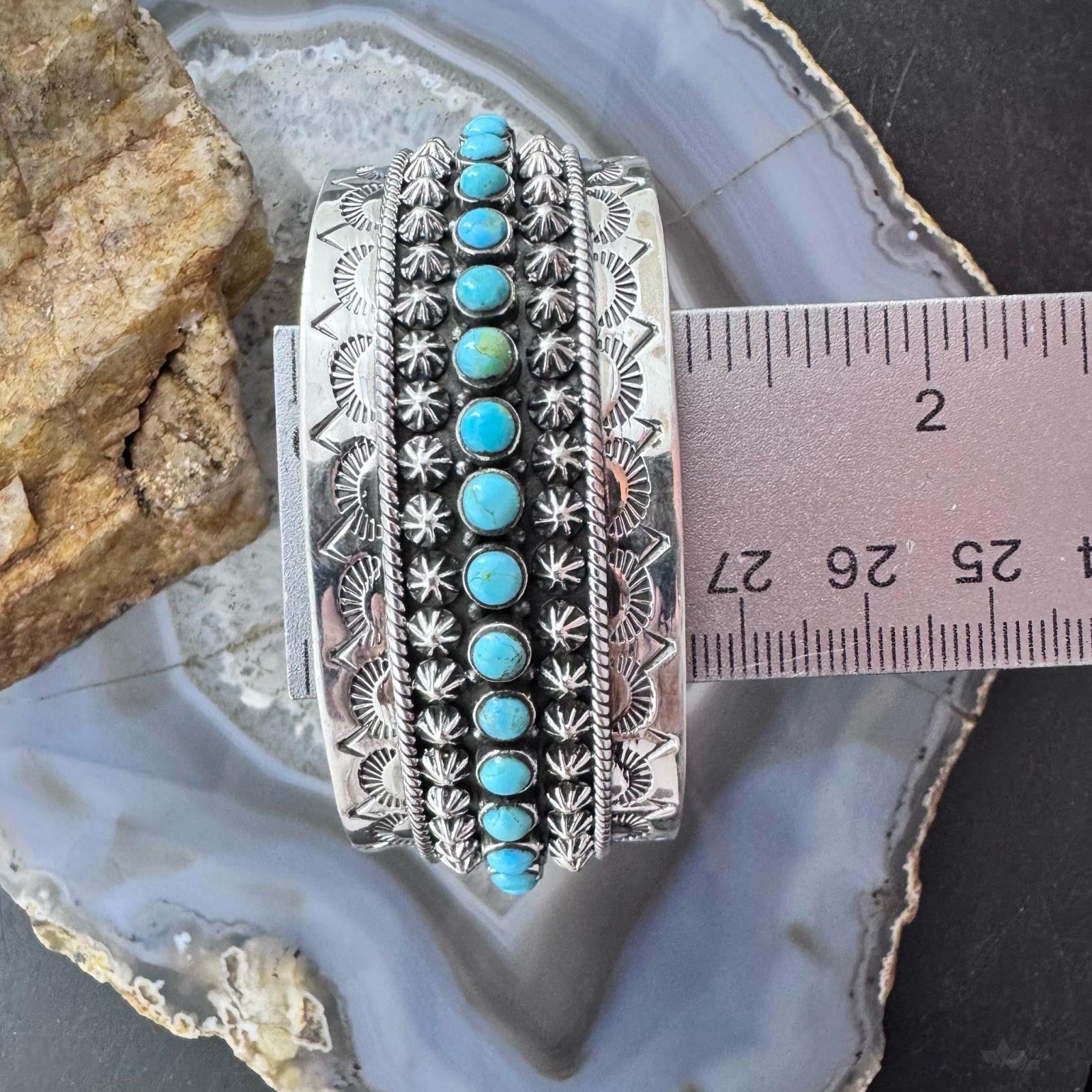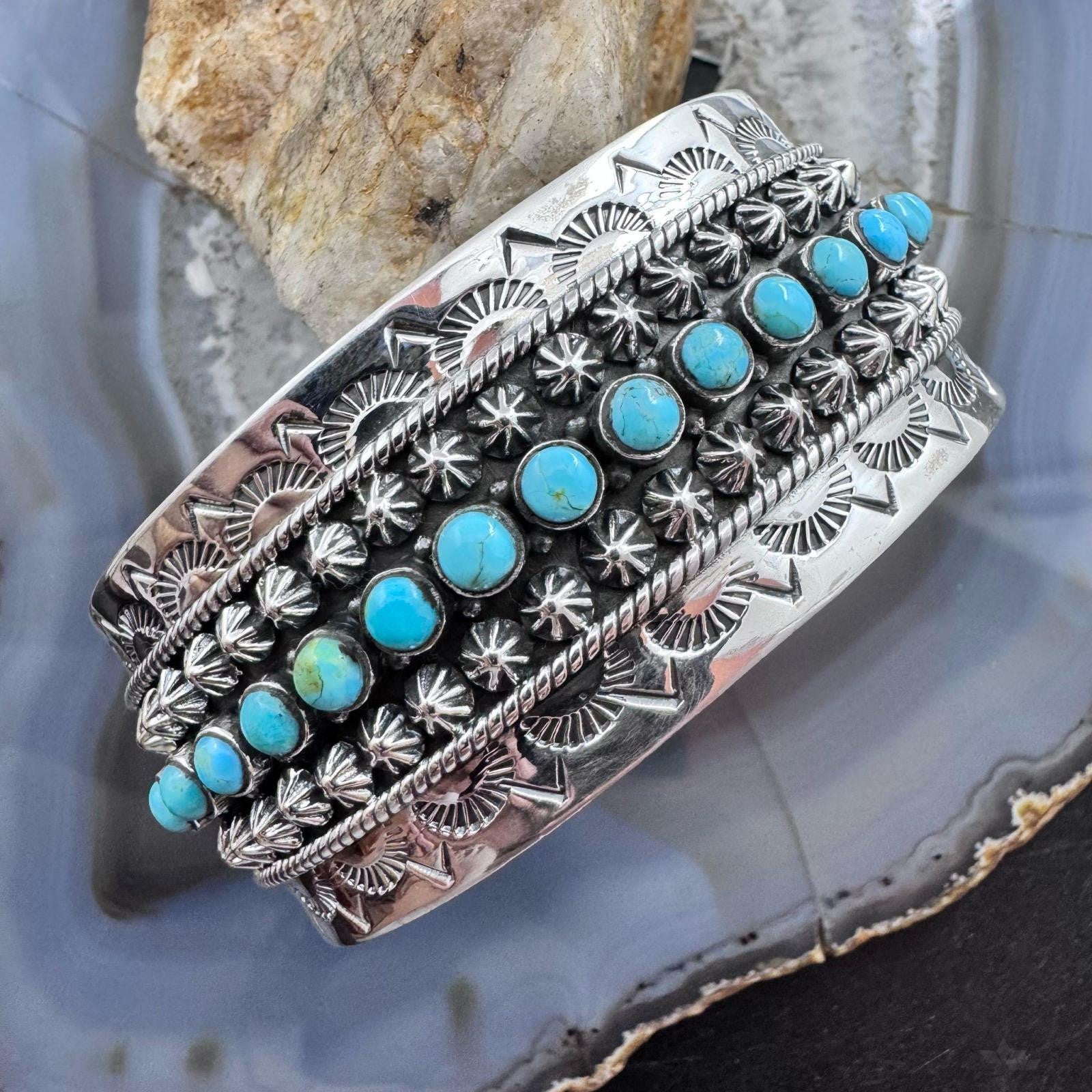 Sterling Silver Southwestern Style Turquoise and Concho Stamped Decorated, Single Row Wide Bracelet For Women.