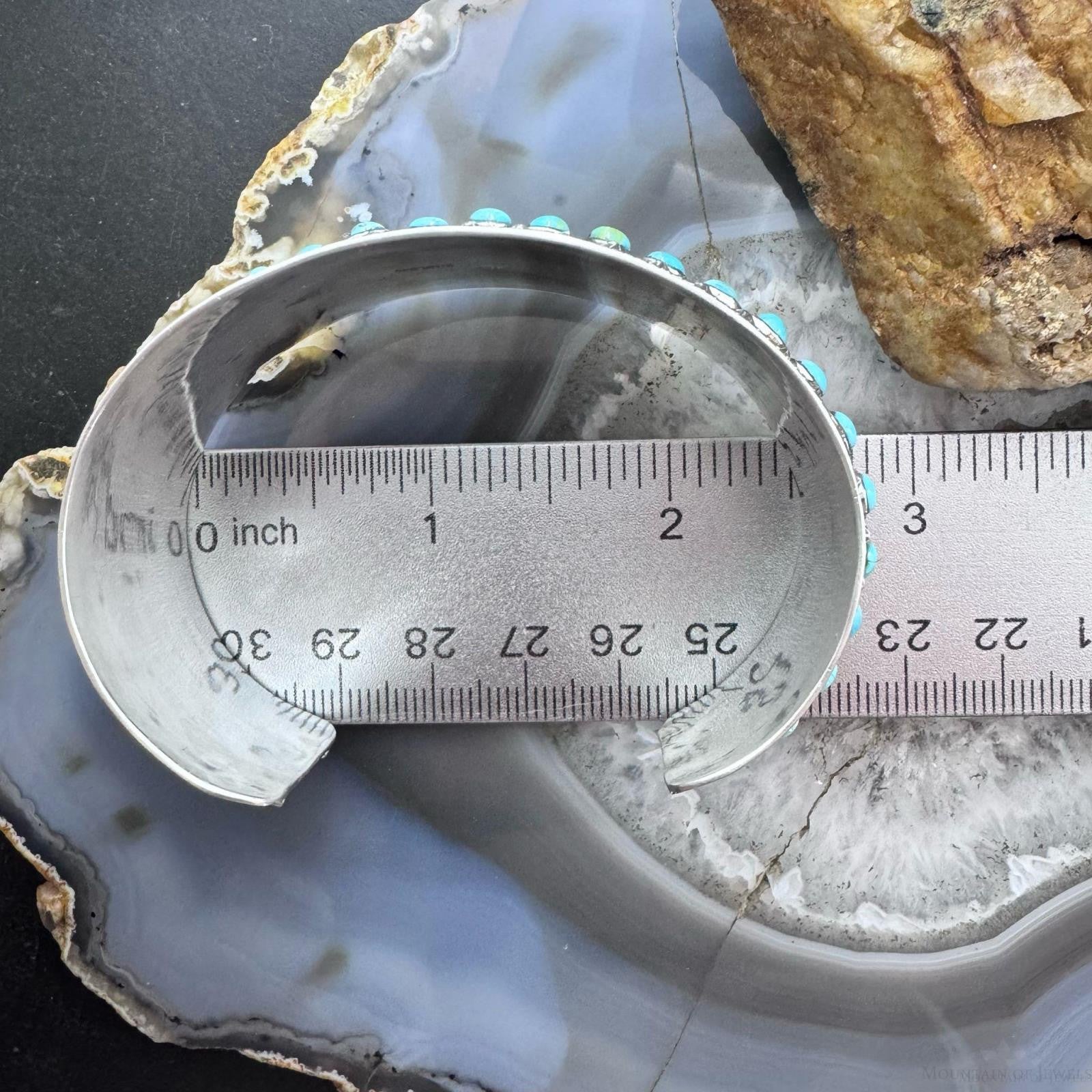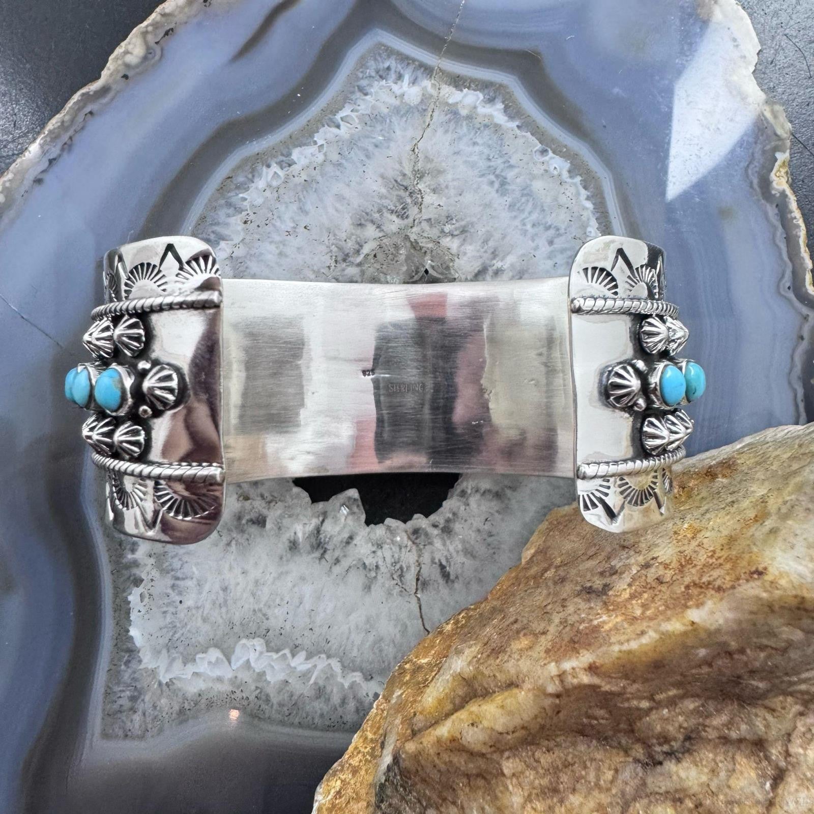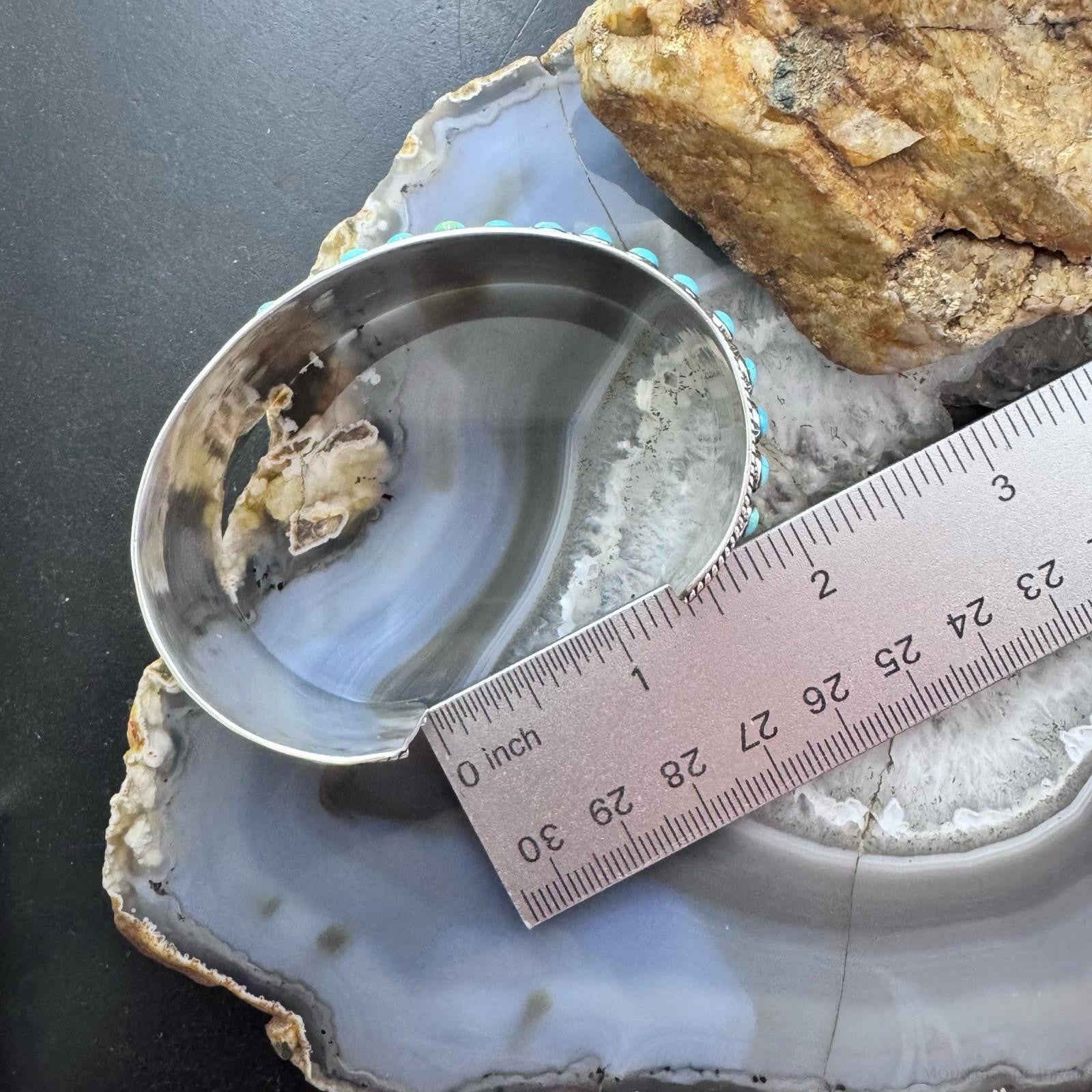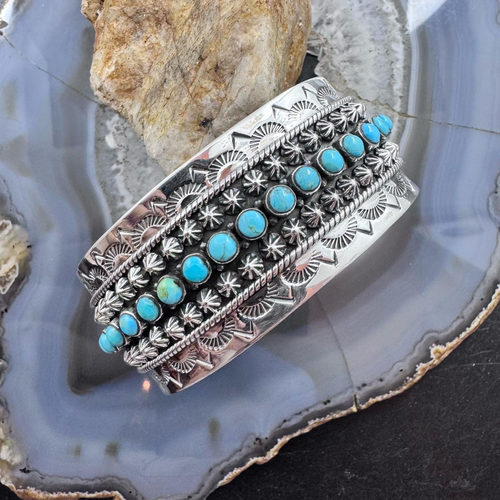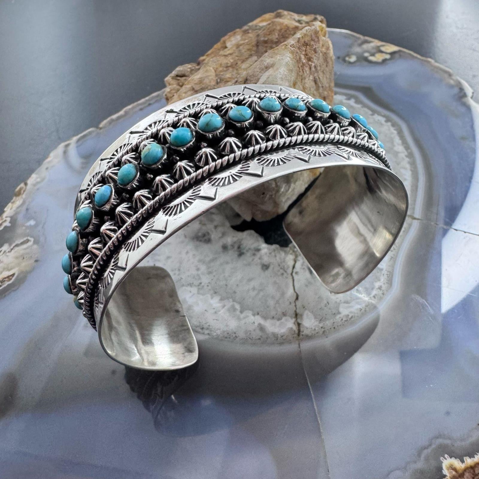Sterling Silver Southwestern Style Turquoise and Concho Stamped Decorated, Single Row Wide Bracelet For Women.