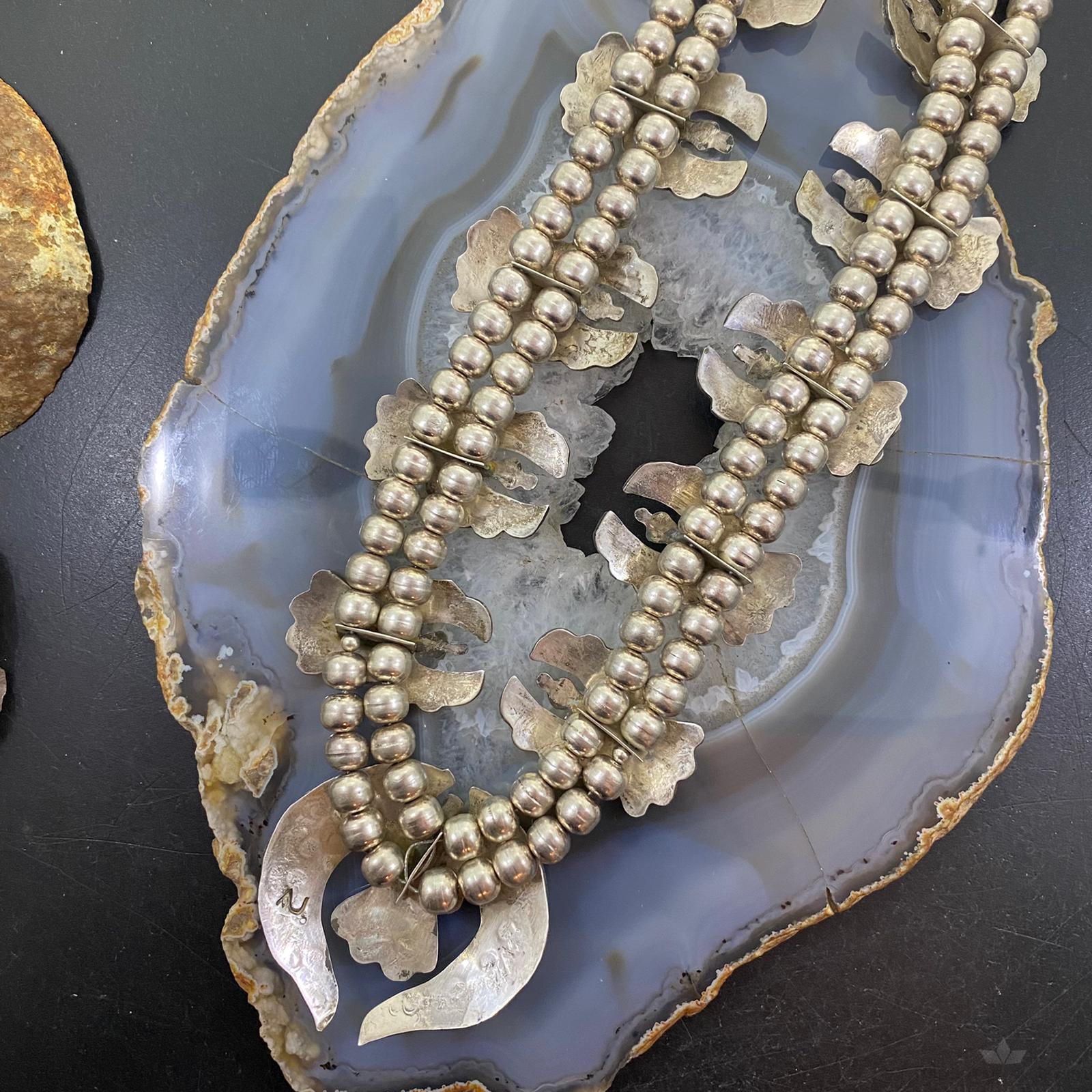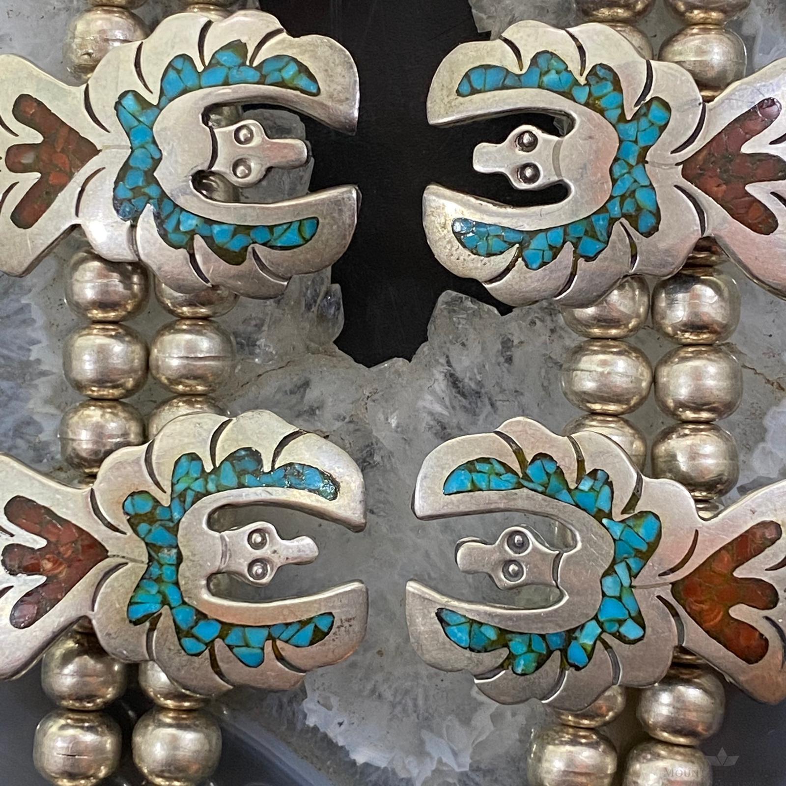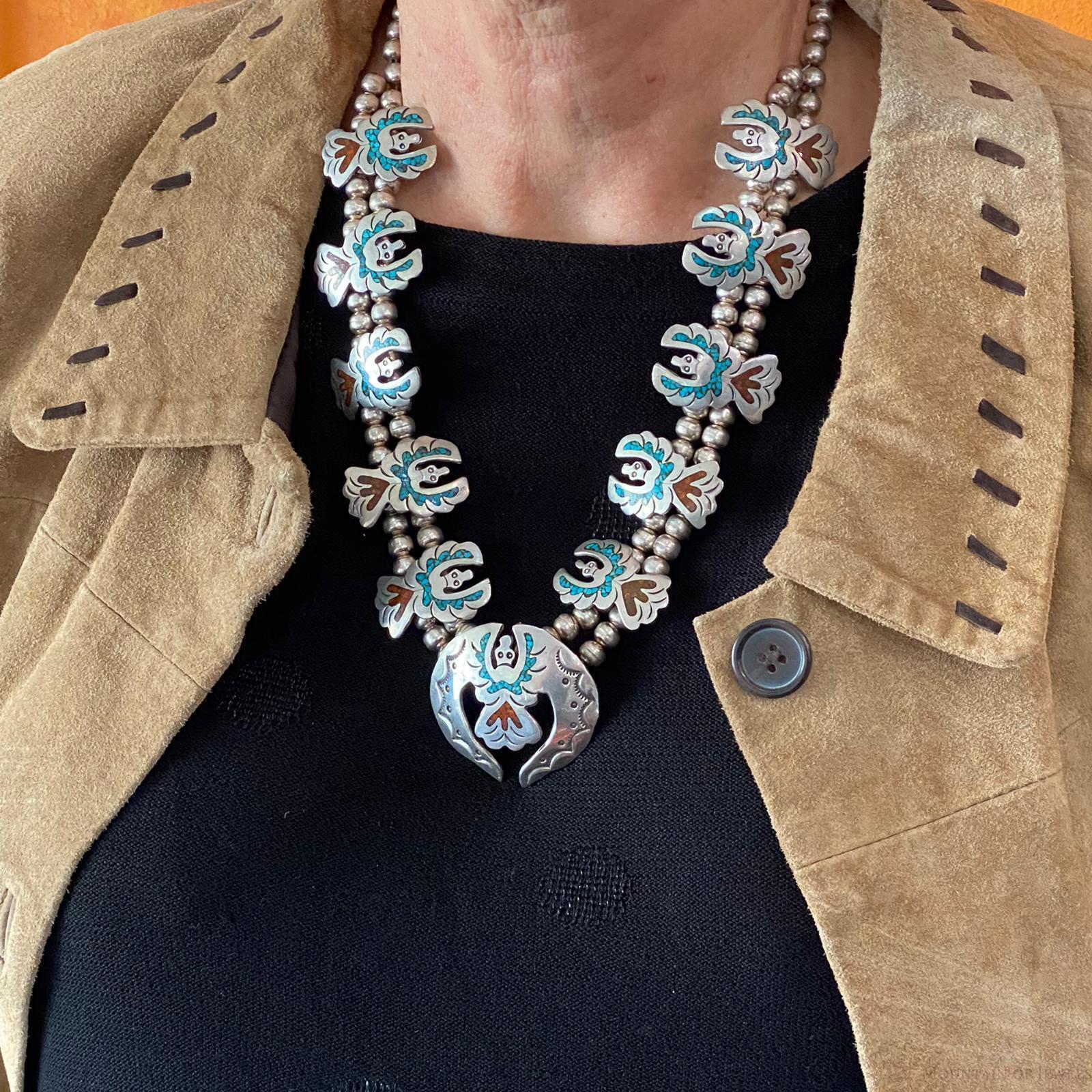 Vintage Native American Silver Chip Inlay Thunderbird Squash Blossom Necklace