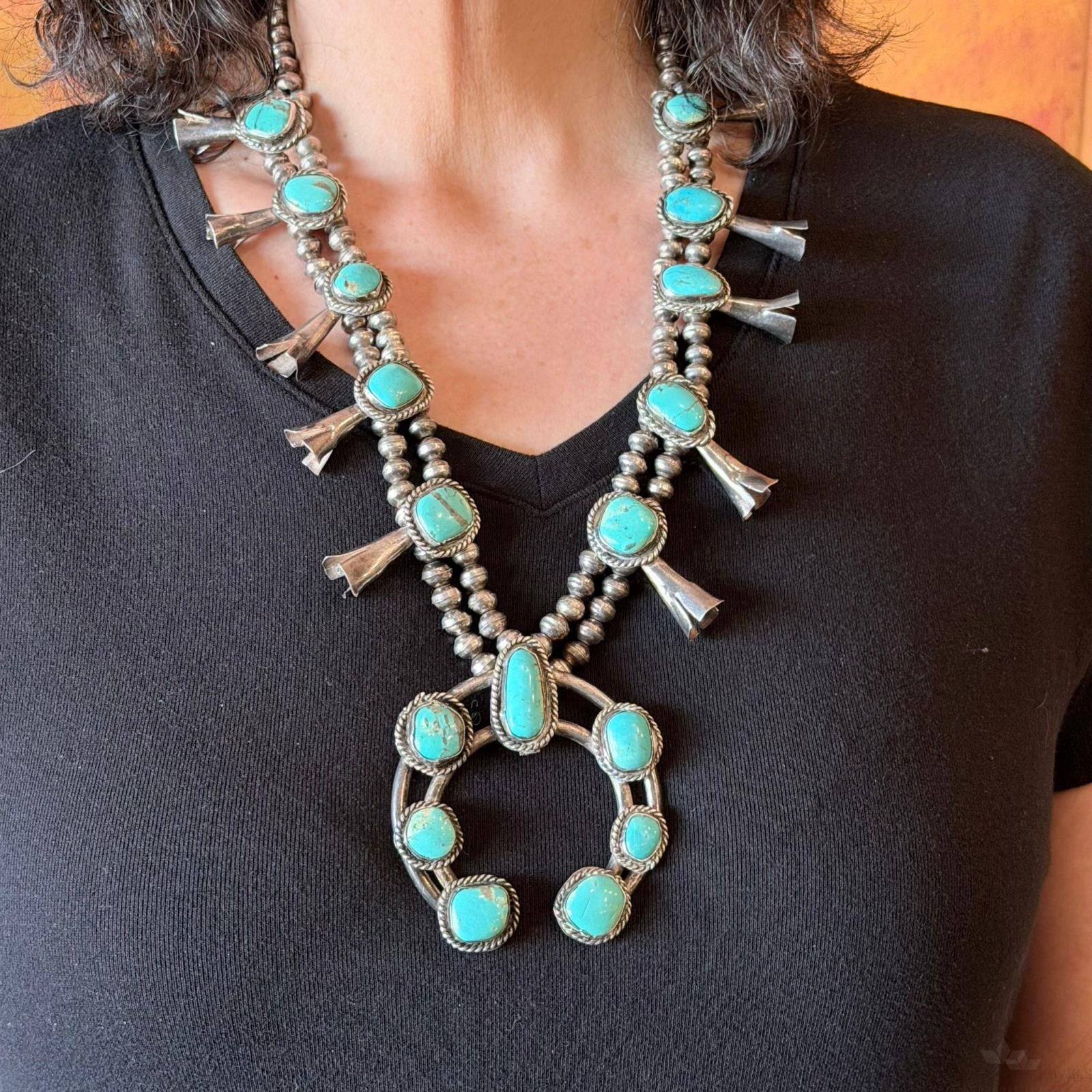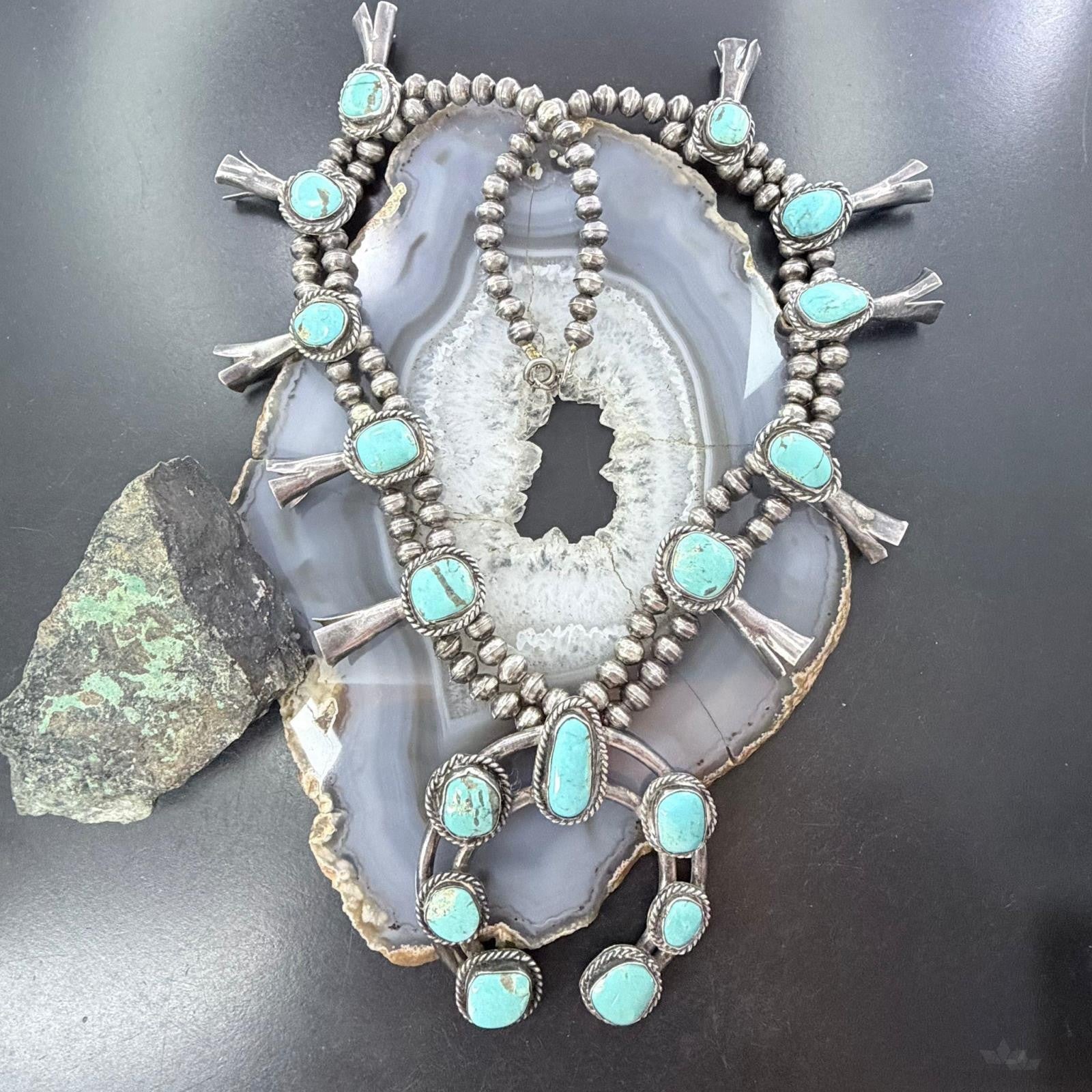 Vintage Native American Sterling Silver Kingman Turquoise Squash Blossom For Women