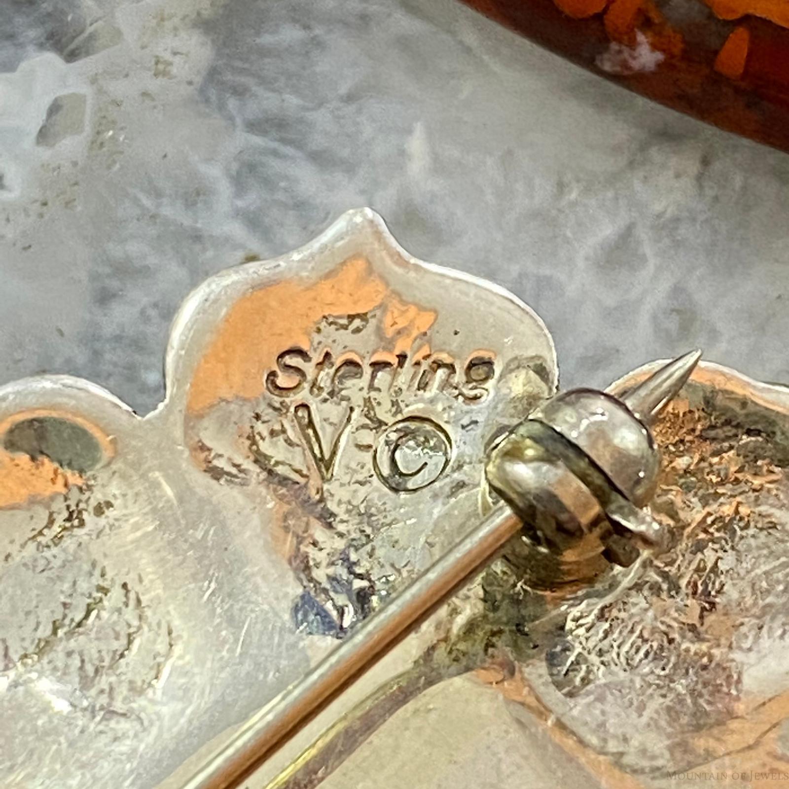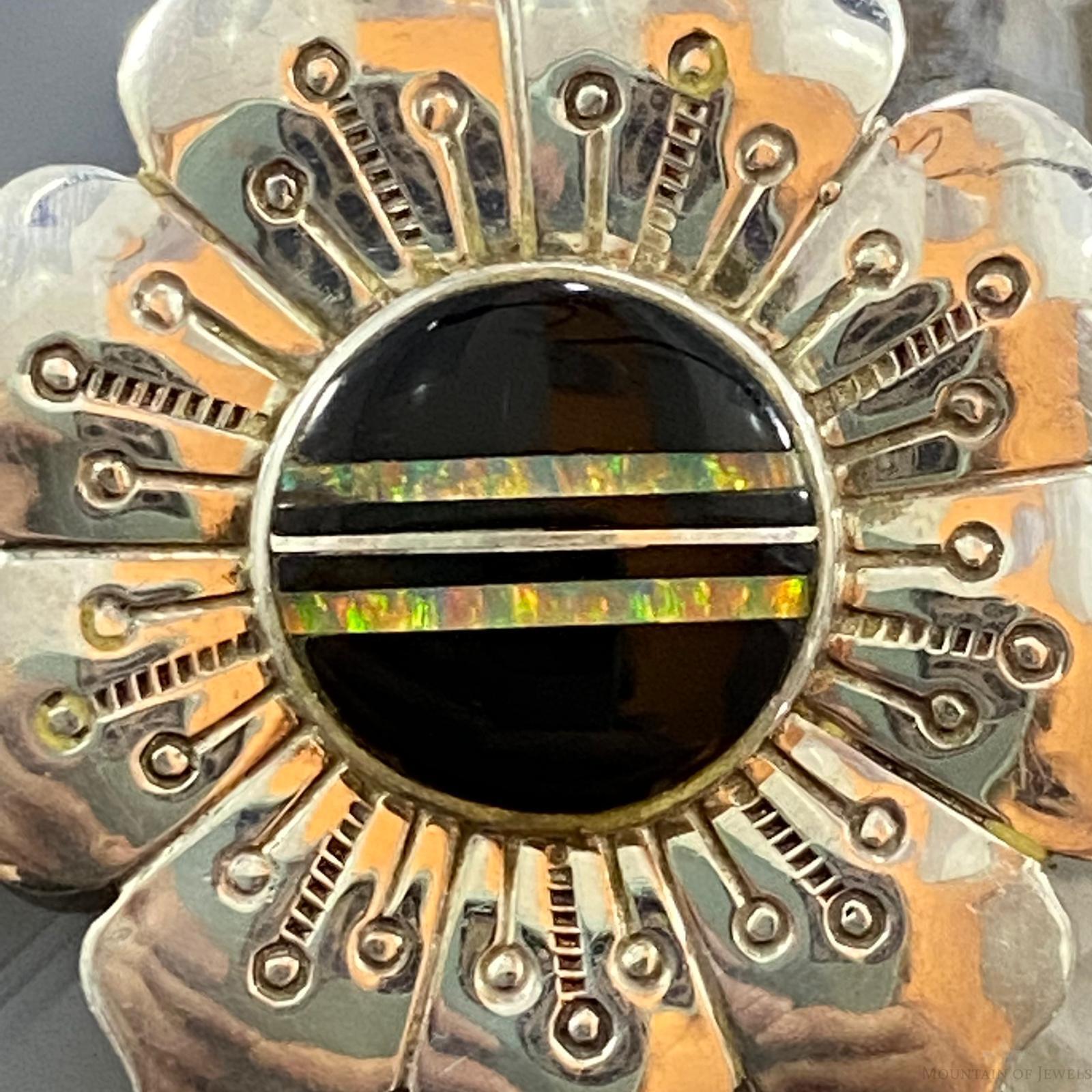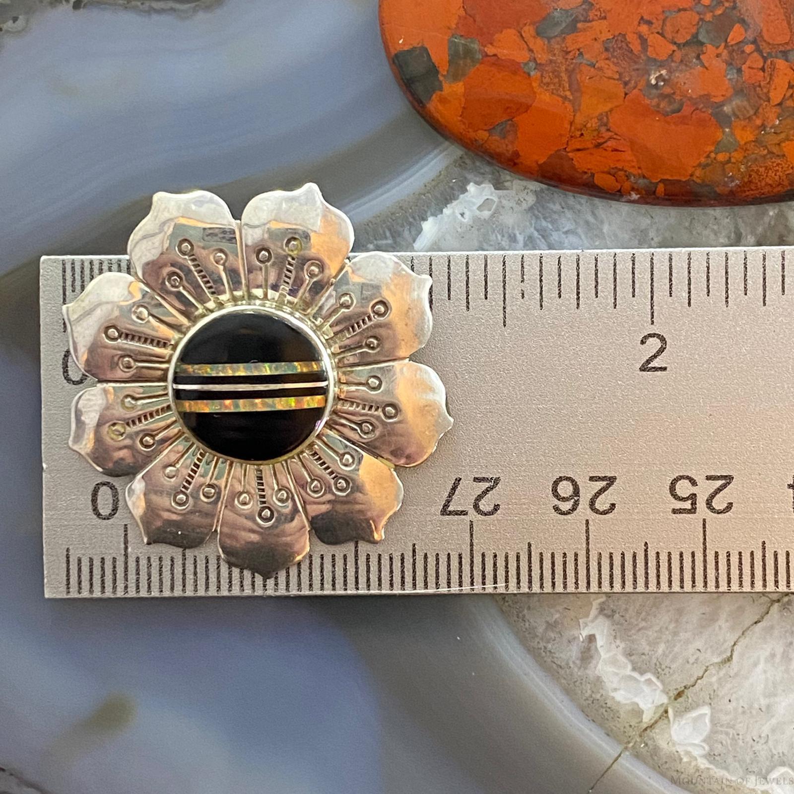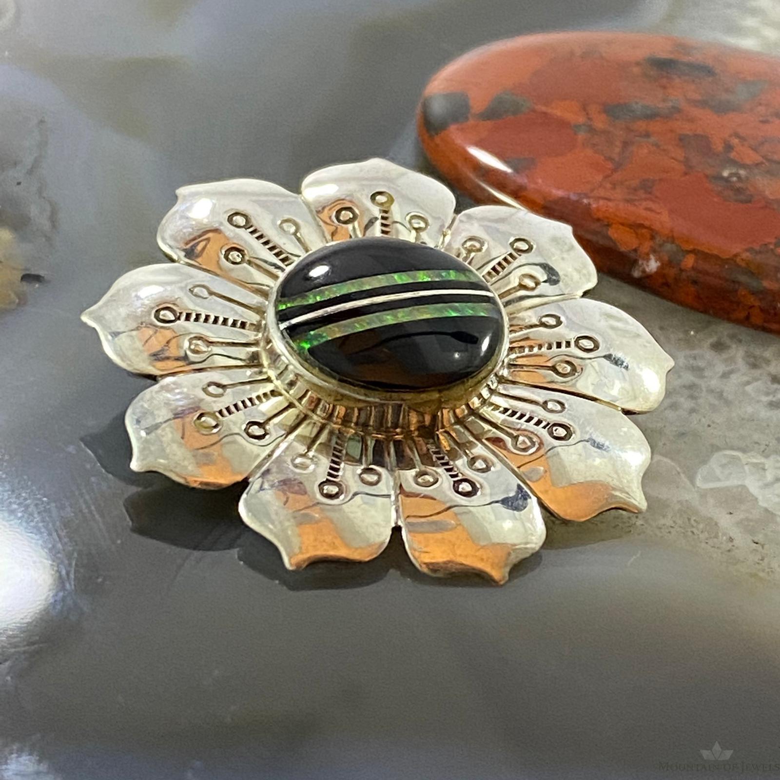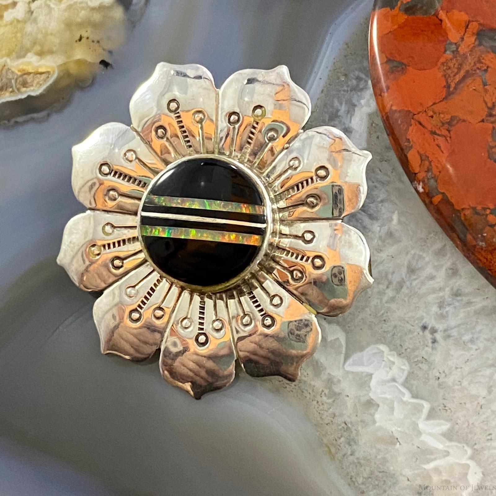 Vintage Native American Sterling Silver Onyx & Opal Stamped Flower Brooch For Women