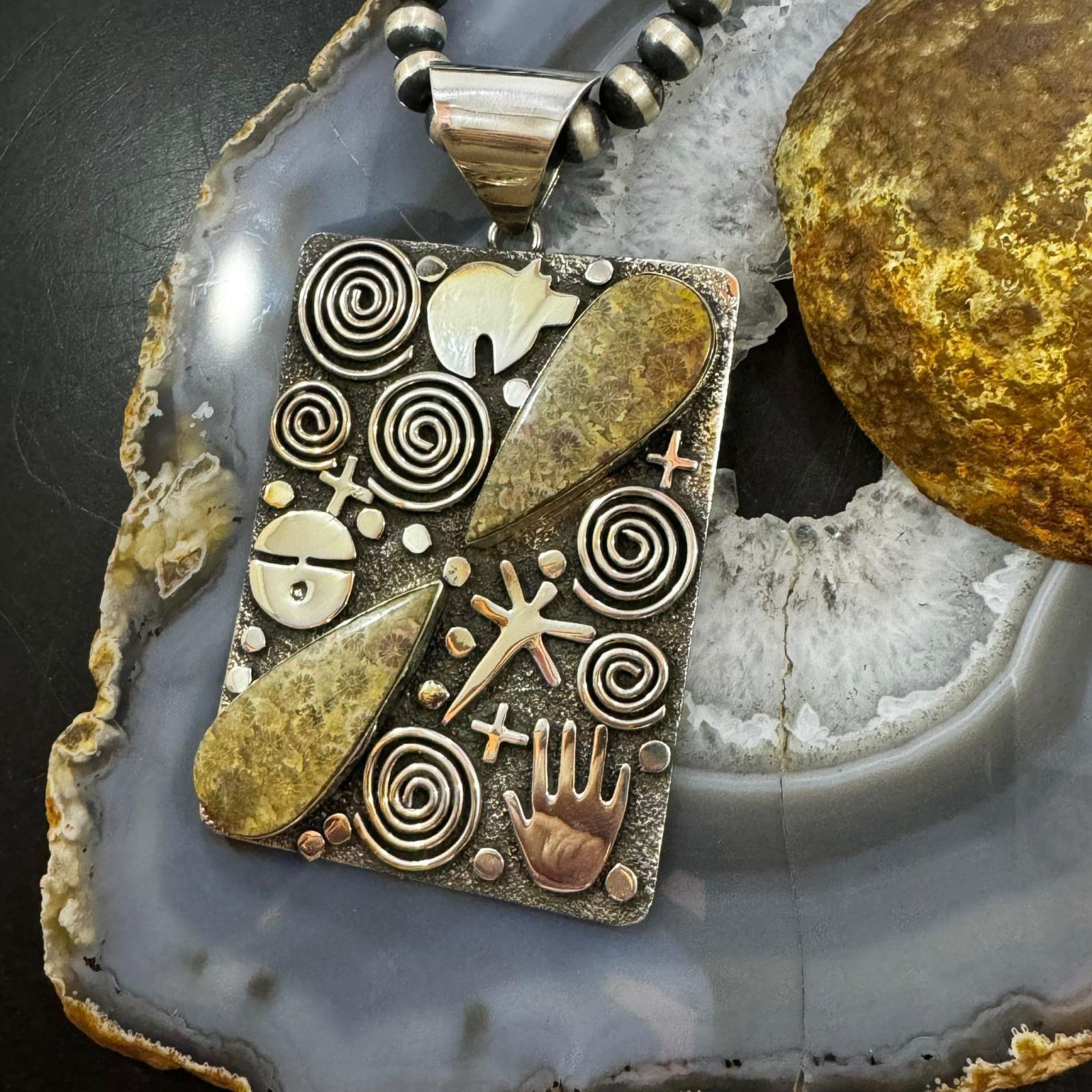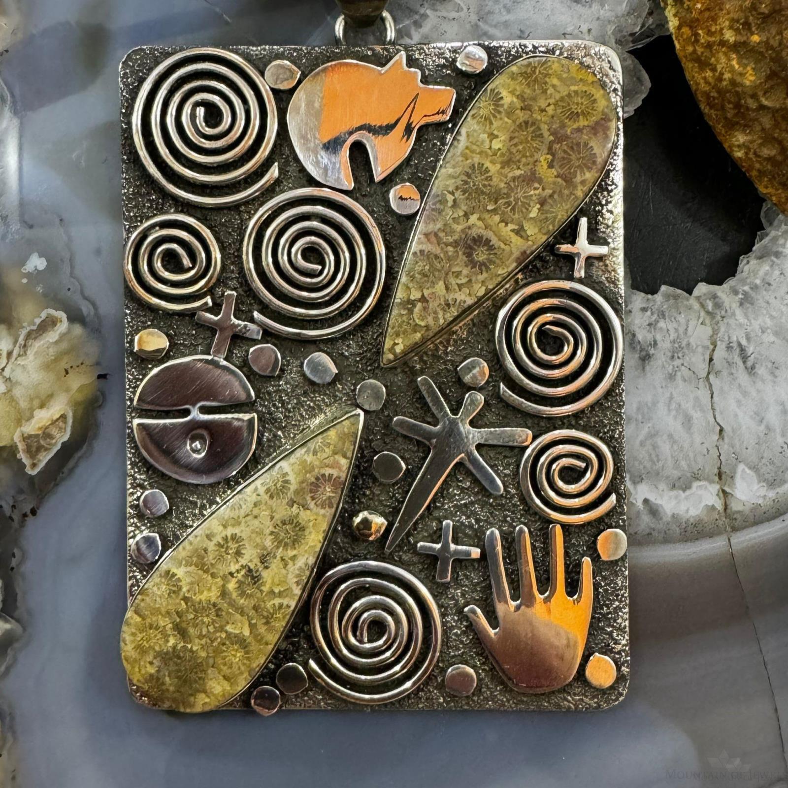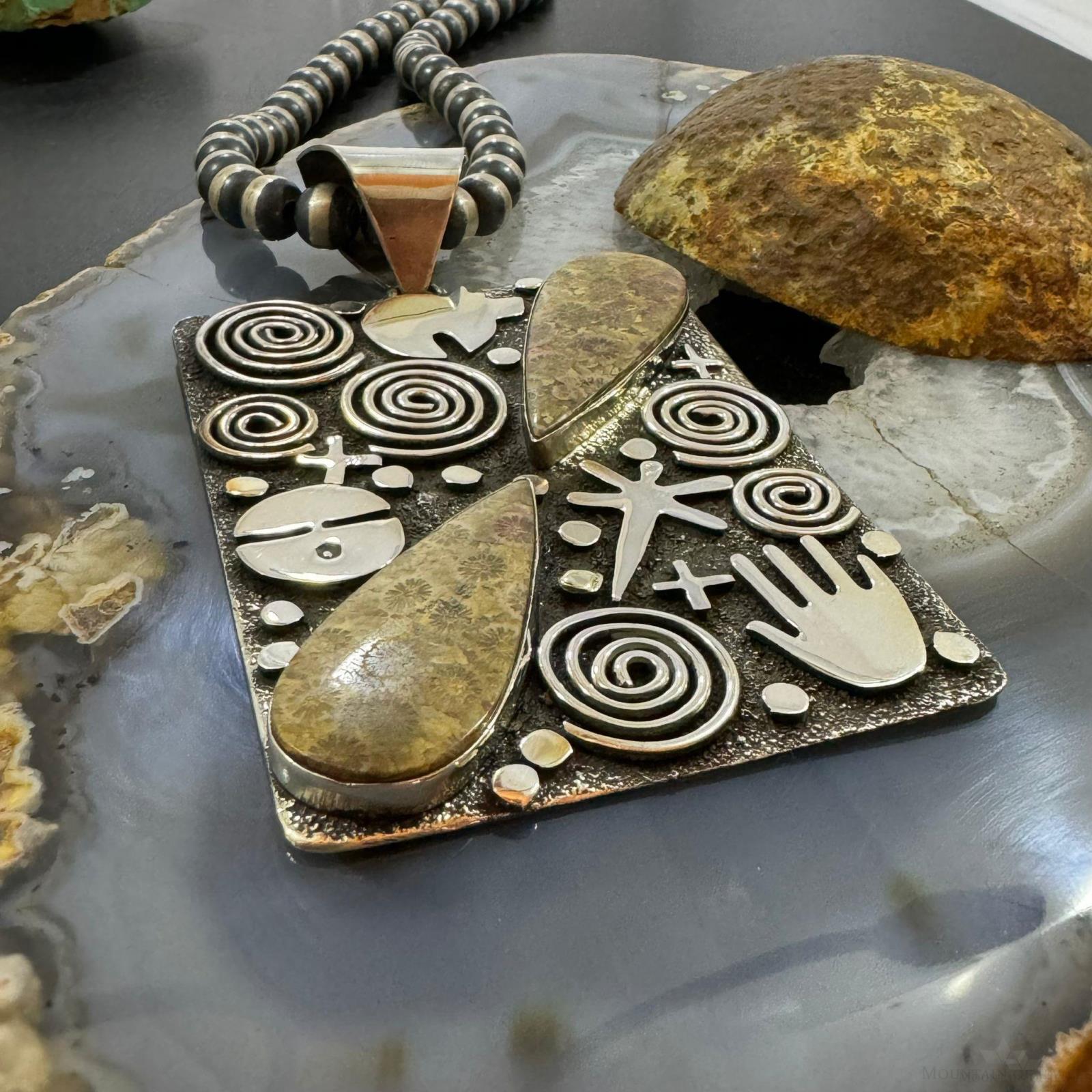 Alex Sanchez Native American Sterling Silver 2 Teardrop Fossilized Coral Rectangle Petroglyph Pendant