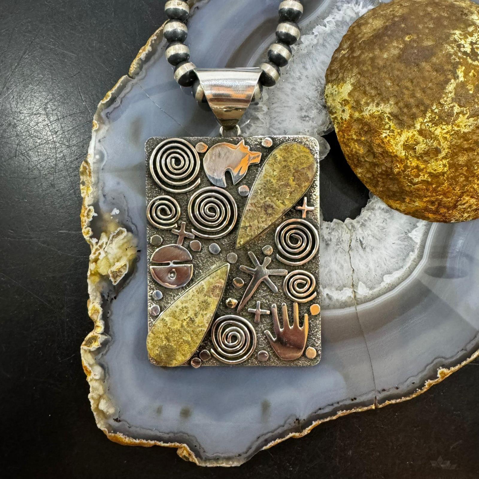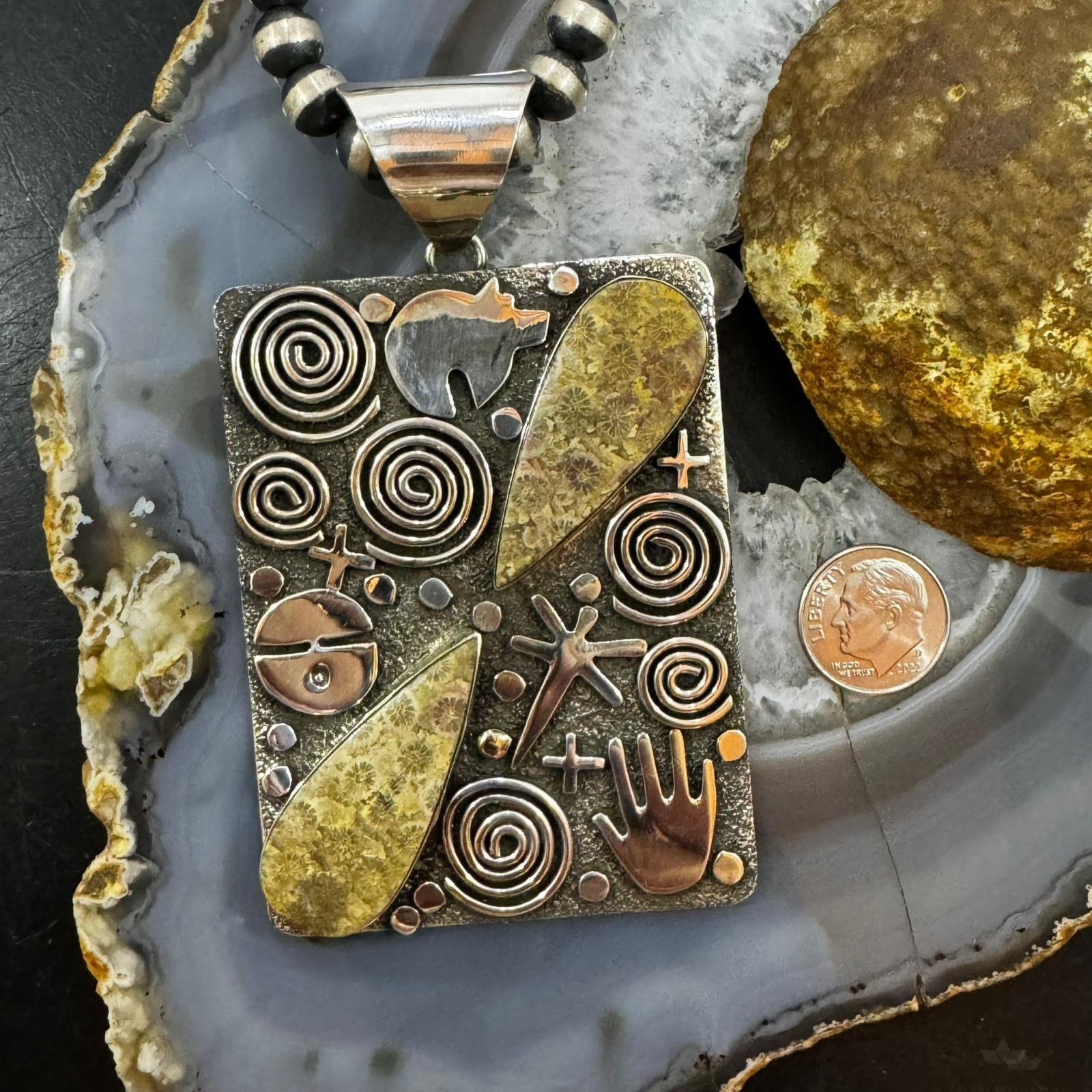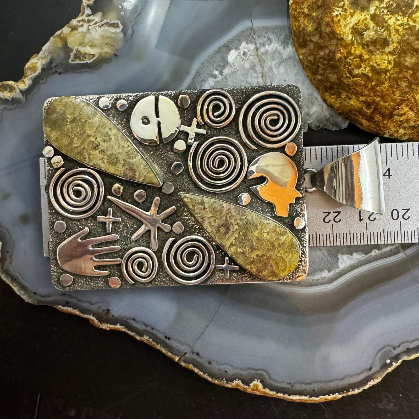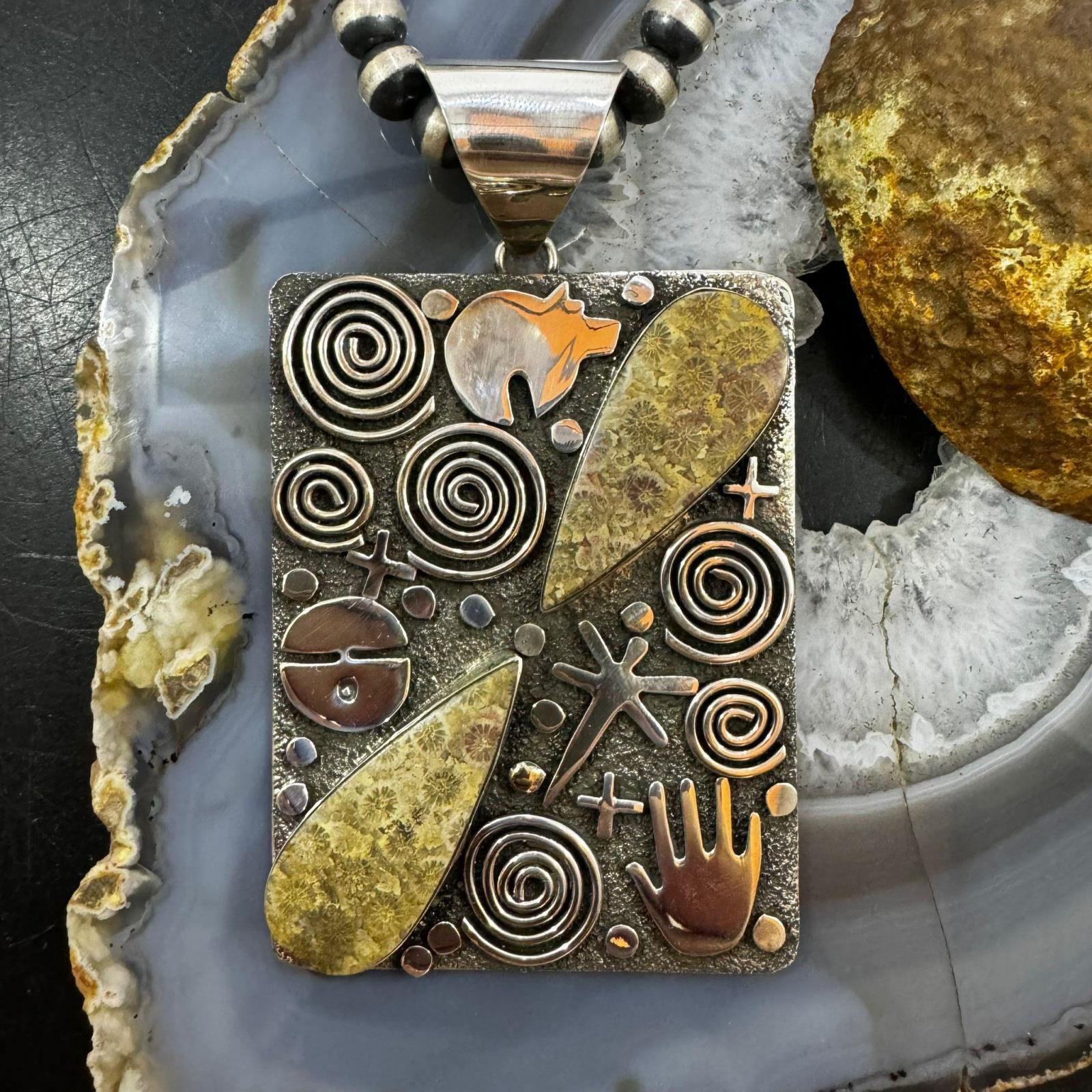 Alex Sanchez Native American Sterling Silver 2 Teardrop Fossilized Coral Rectangle Petroglyph Pendant