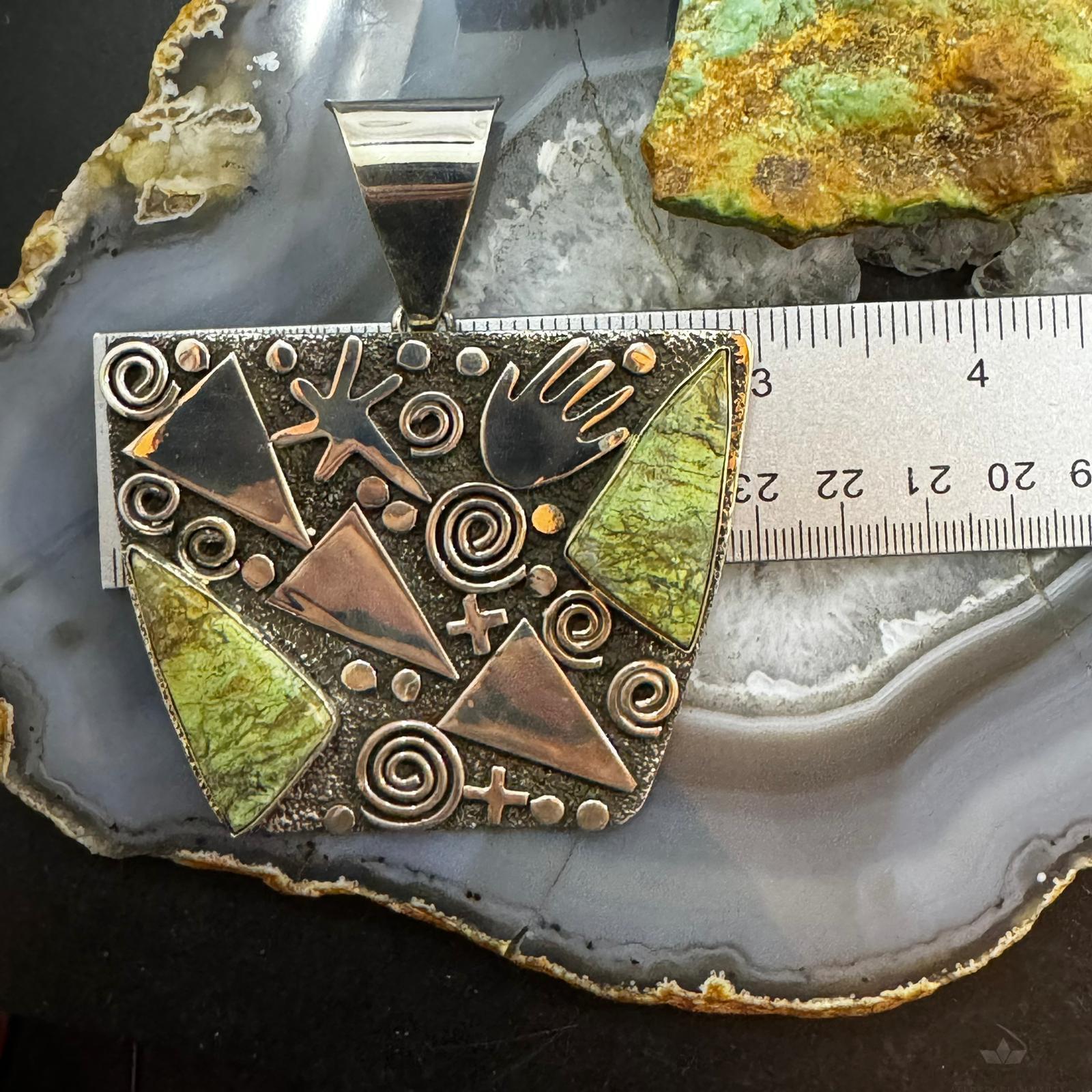Alex Sanchez Native American Sterling Silver Green Sediment Jasper Rectangle Petroglyph Unisex Pendant