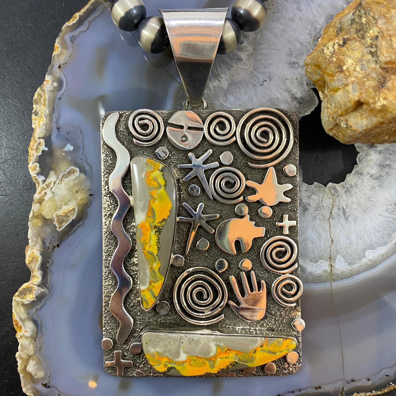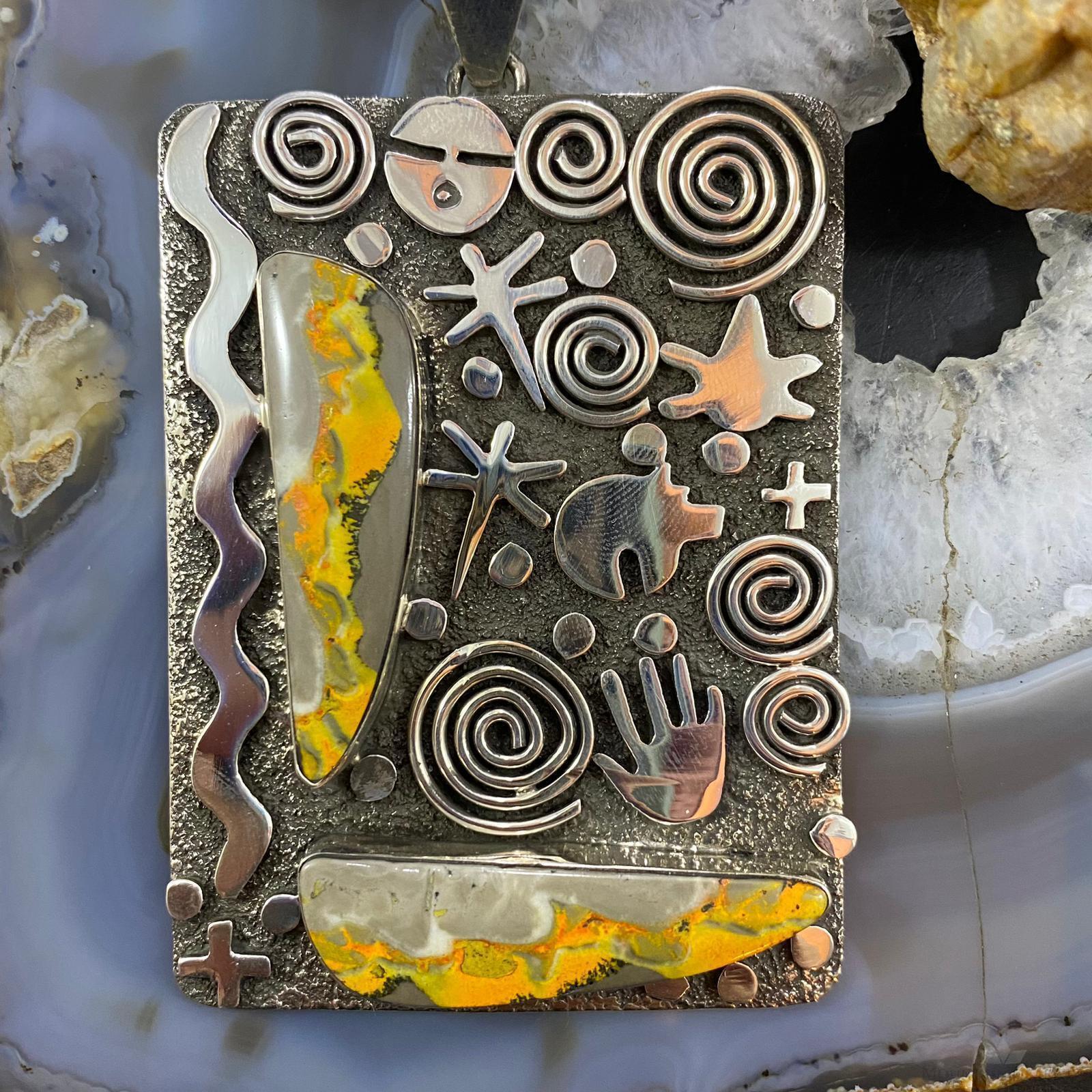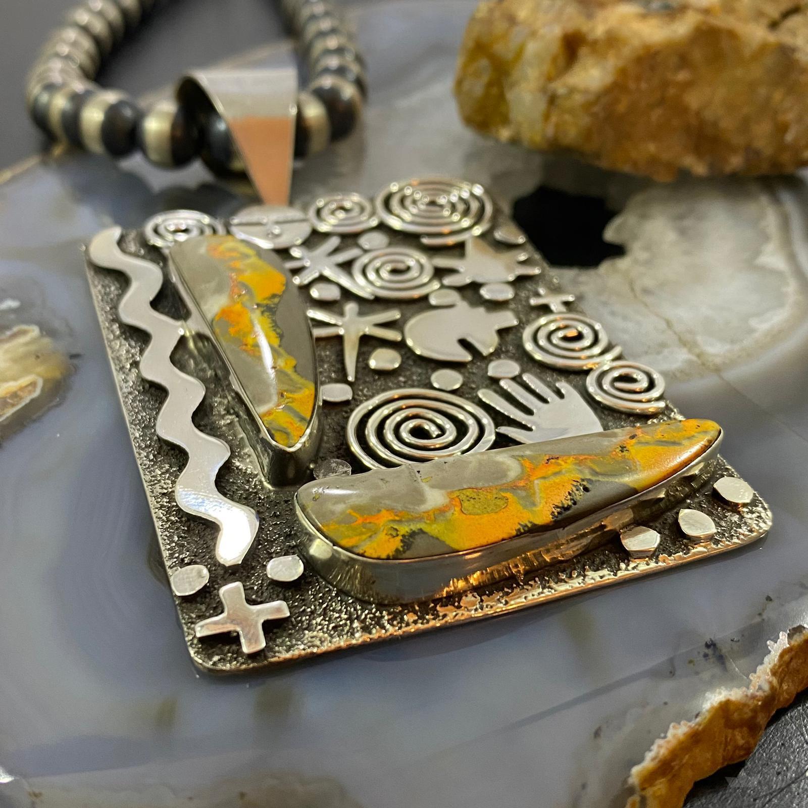 Alex Sanchez Native American Sterling Silver 2 Bumblebee Jasper Petroglyph Tablet Unisex Pendant