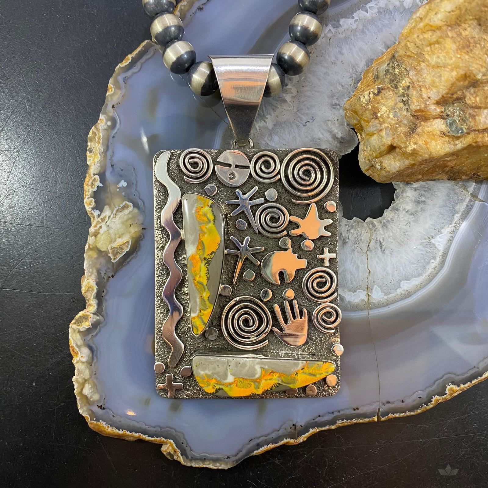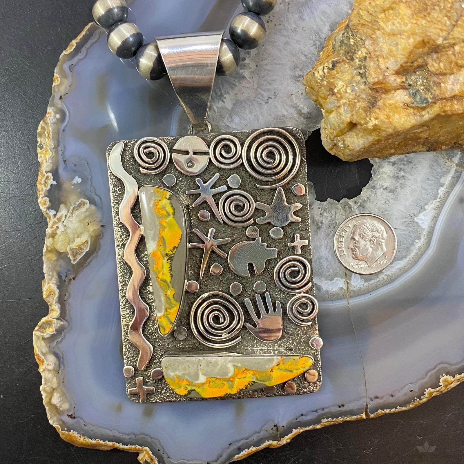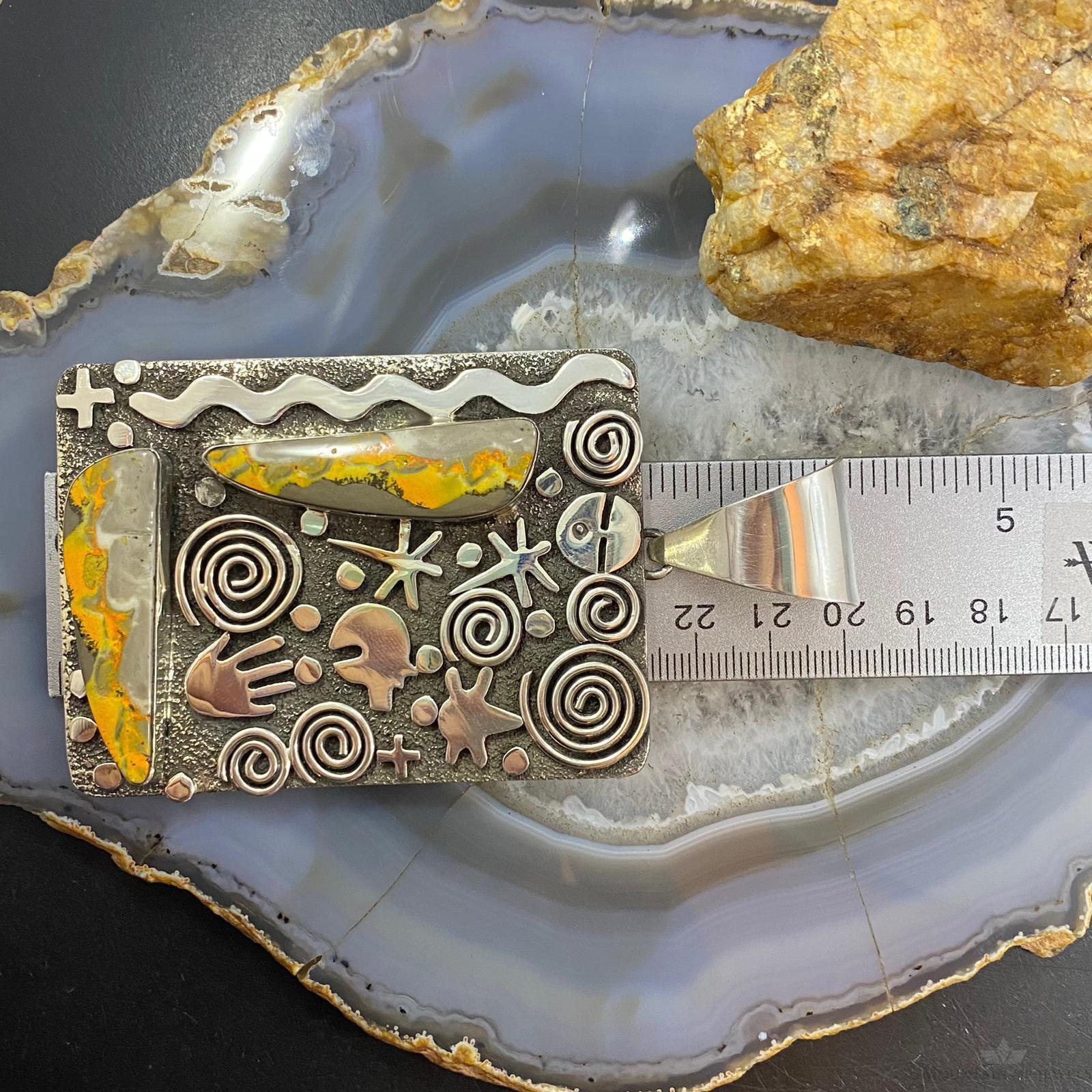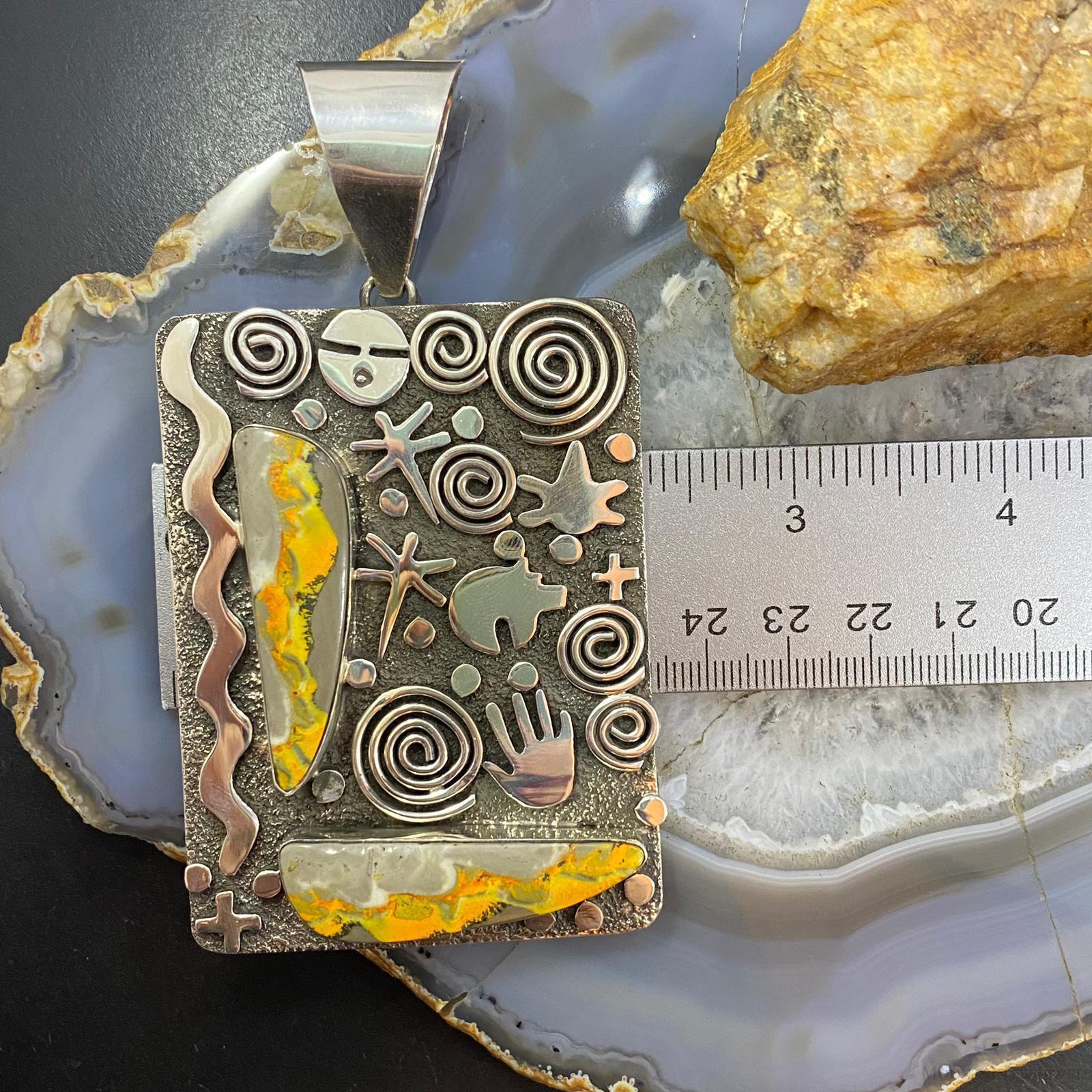 Alex Sanchez Native American Sterling Silver 2 Bumblebee Jasper Petroglyph Tablet Unisex Pendant