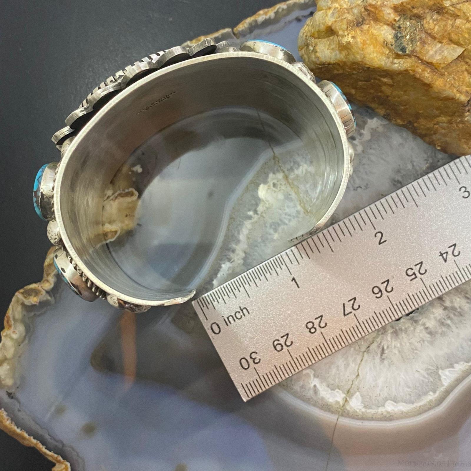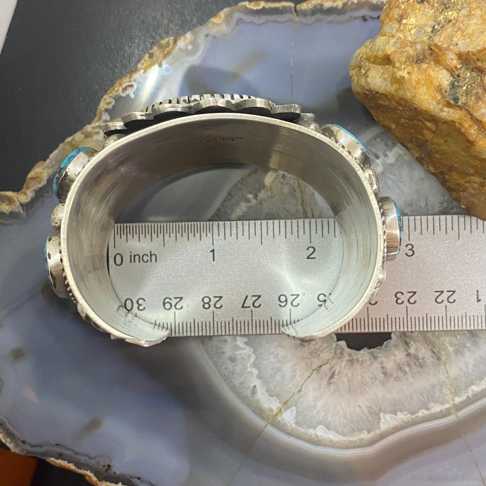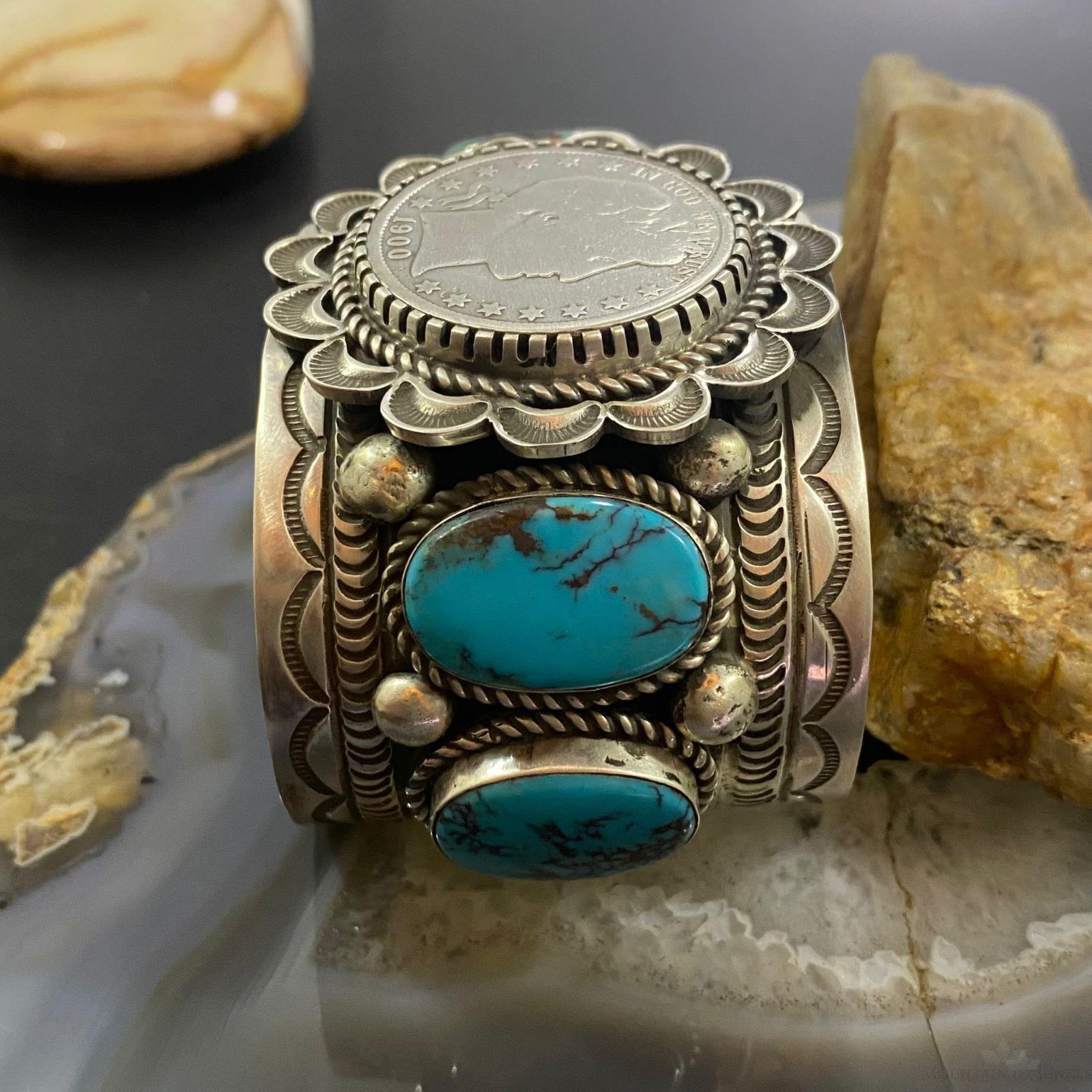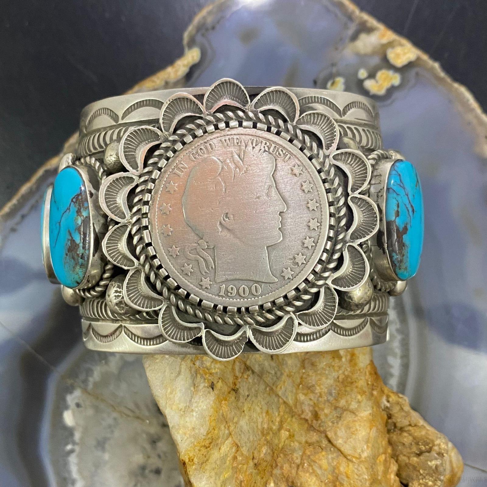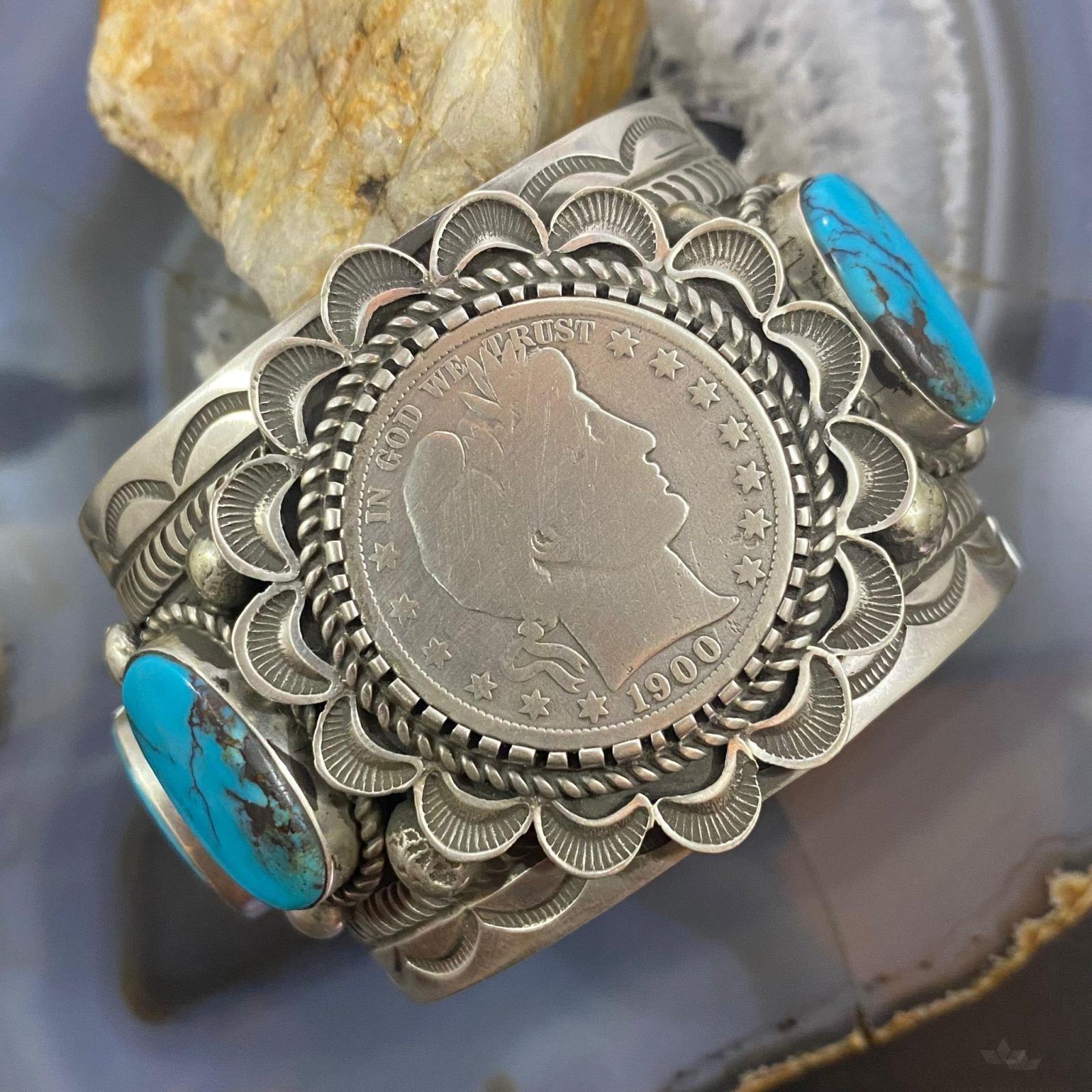 Alex Sanchez Sterling Silver Barber Head Half Dollar & 4 Oval Turquoise Bracelet For Women