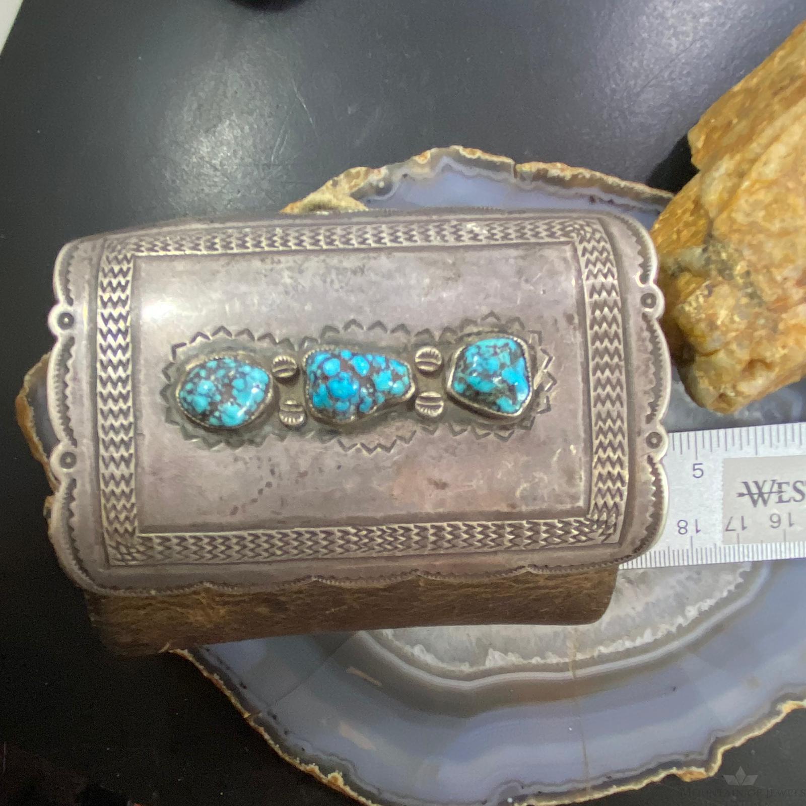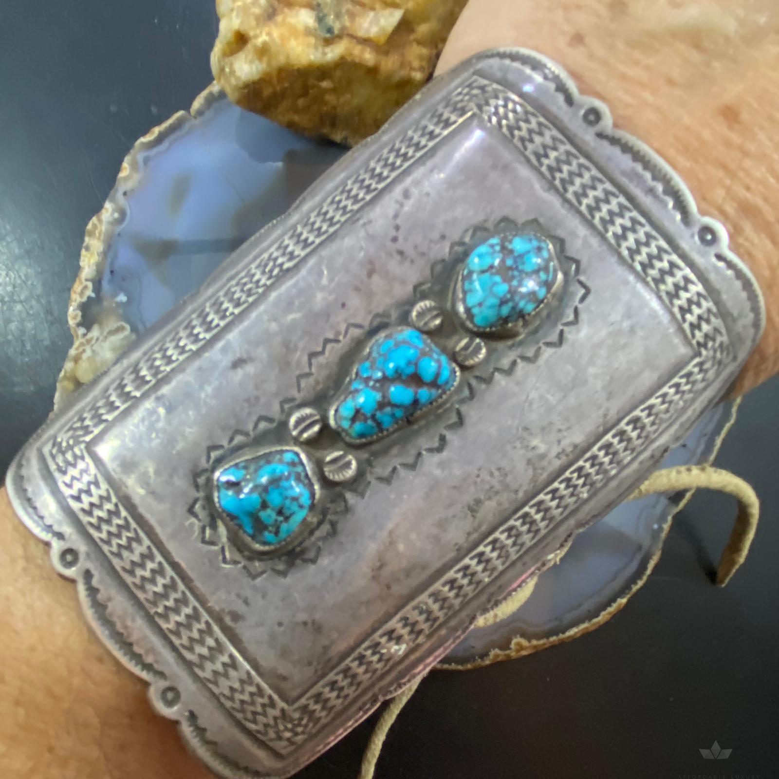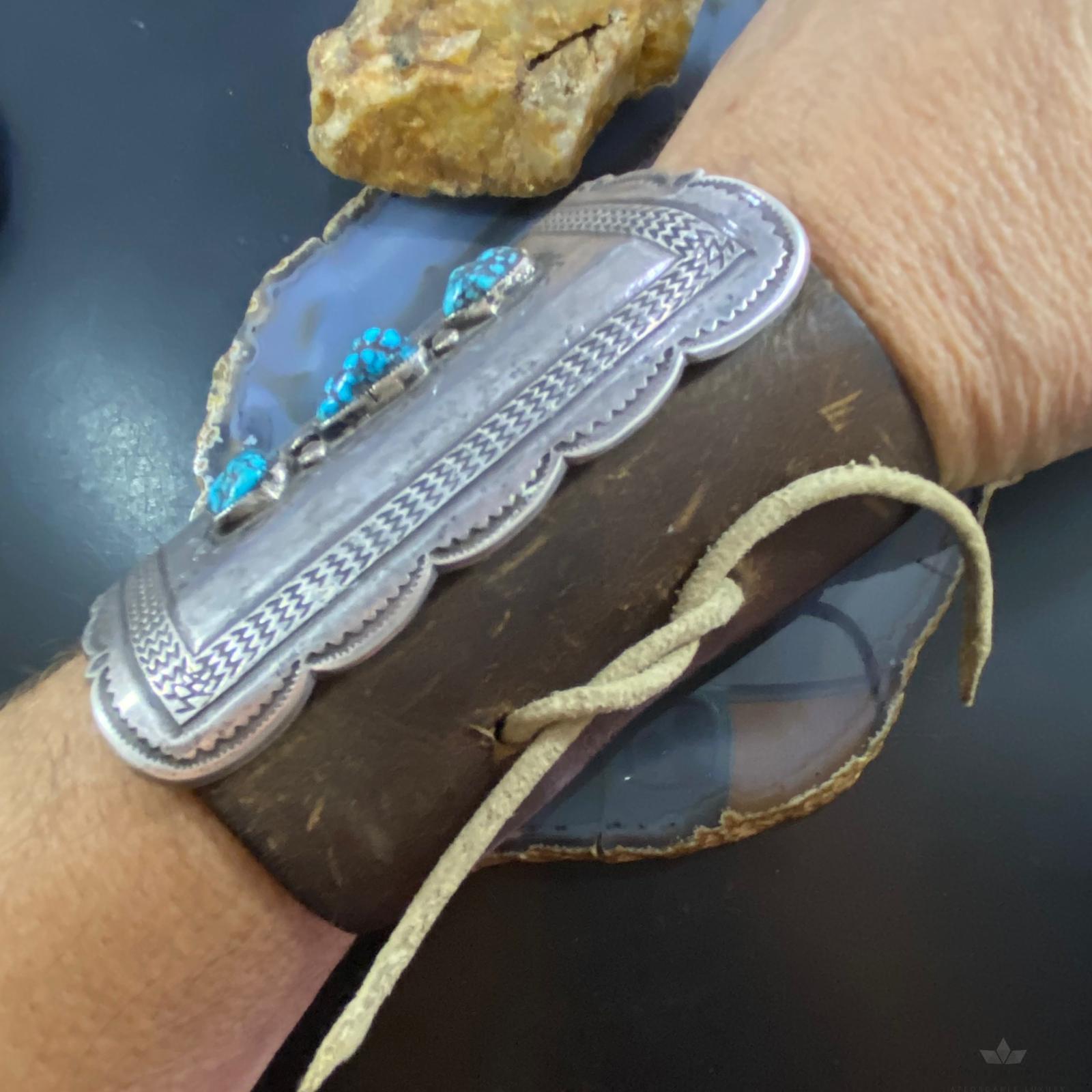 Antique Native American Silver, Leather & 3 Kingman Turquoise Ketoh Bow Guard