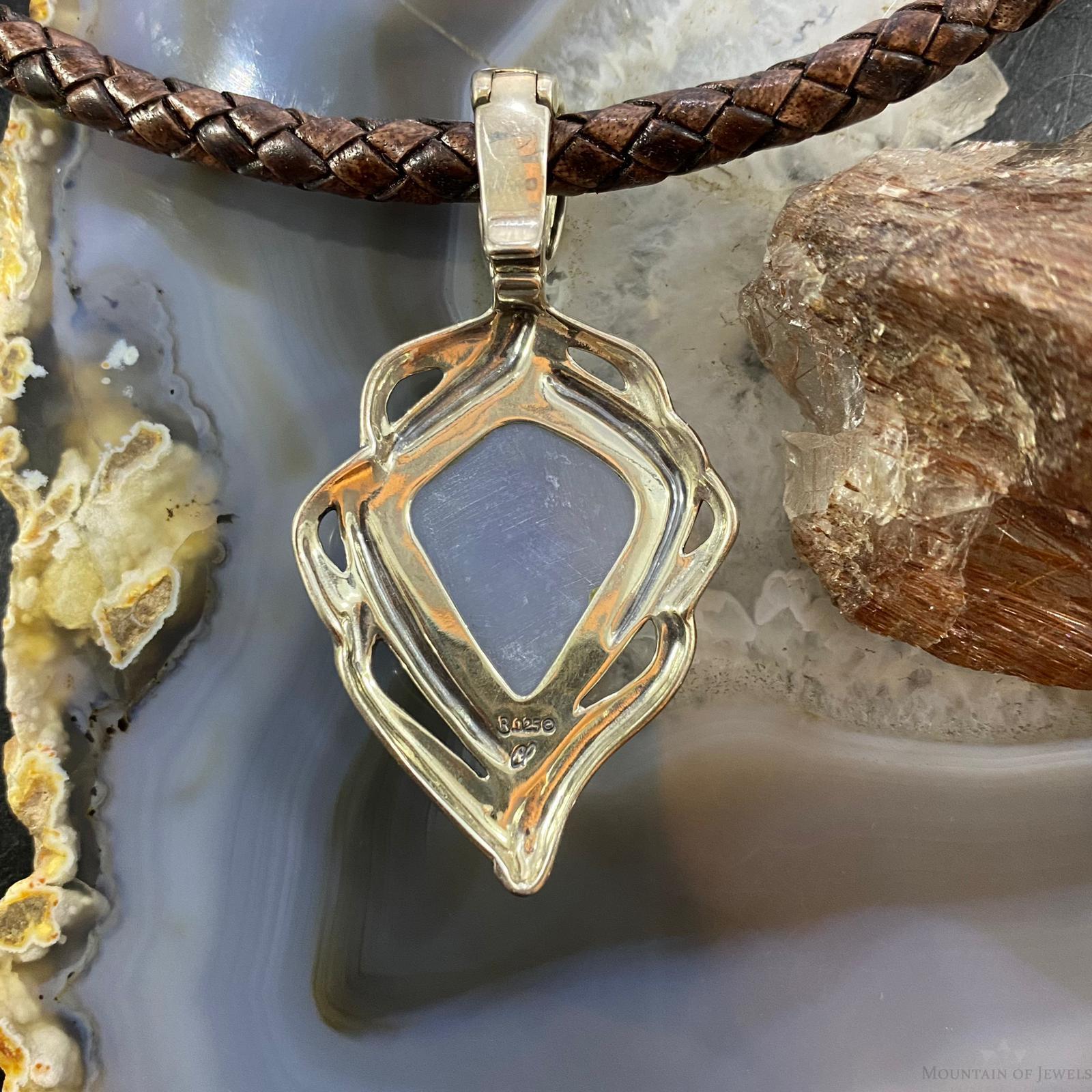 A Beautifully Serene Powder Blue Stone is Set in a Wavy Bezel Framed by More Wavy Sterling Silver Designs. The Snap Hinge Allows You To Wear This On a Variety of Chains, Leather Cords or, as Shown, a Leather Necklace.