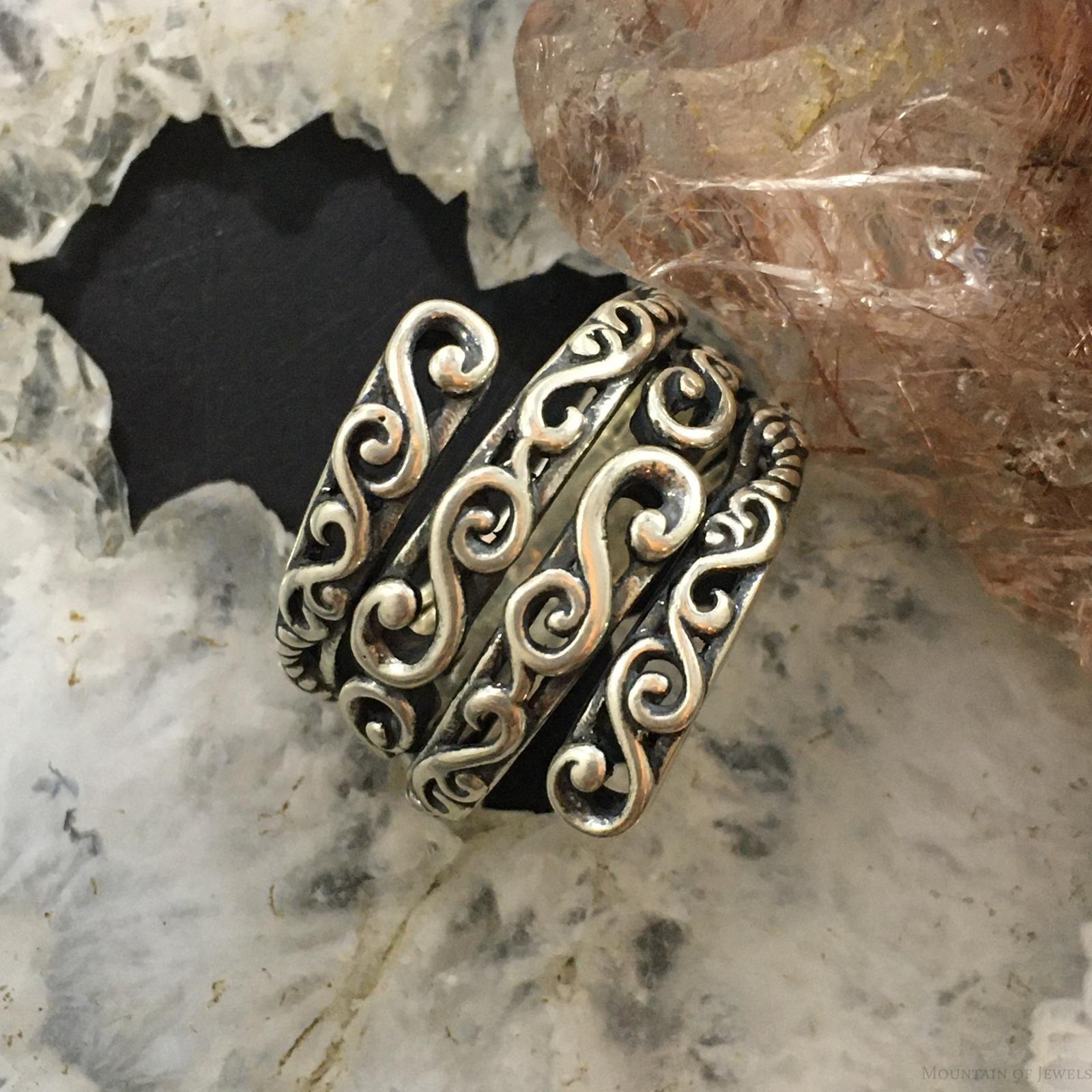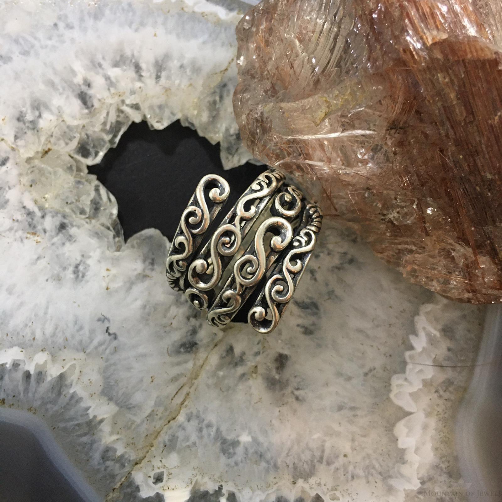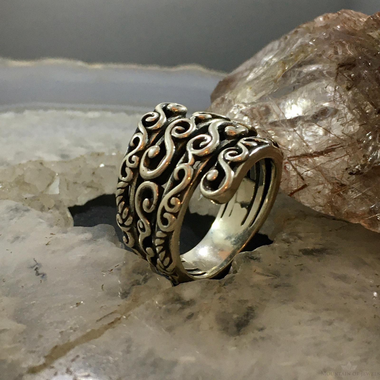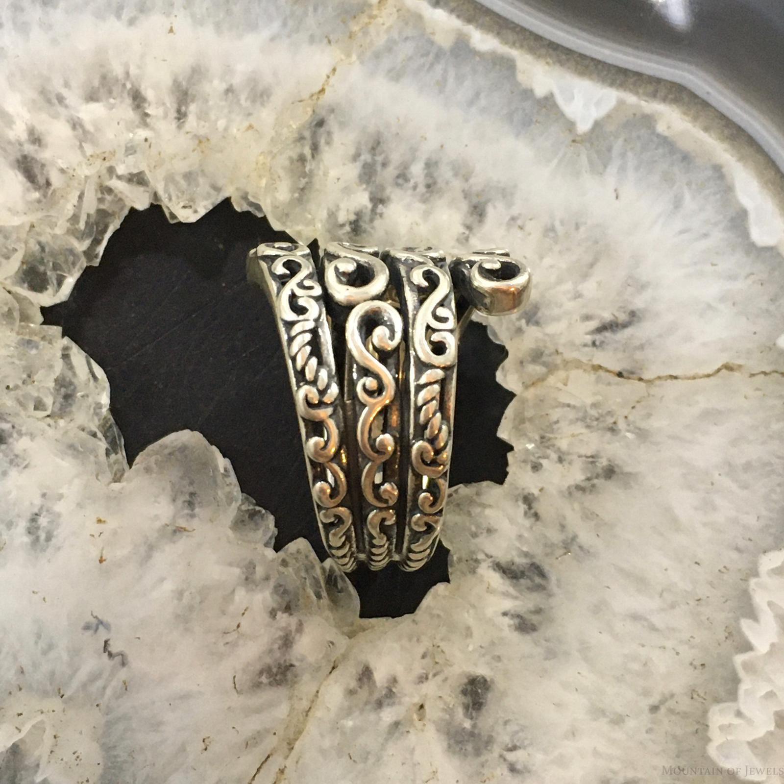 A Most Striking Coil Ring Features Beautiful Raised Scroll Work Over Open Split Shanks. This Design Has an Oxidized Finish With Beautiful Polished Accents.