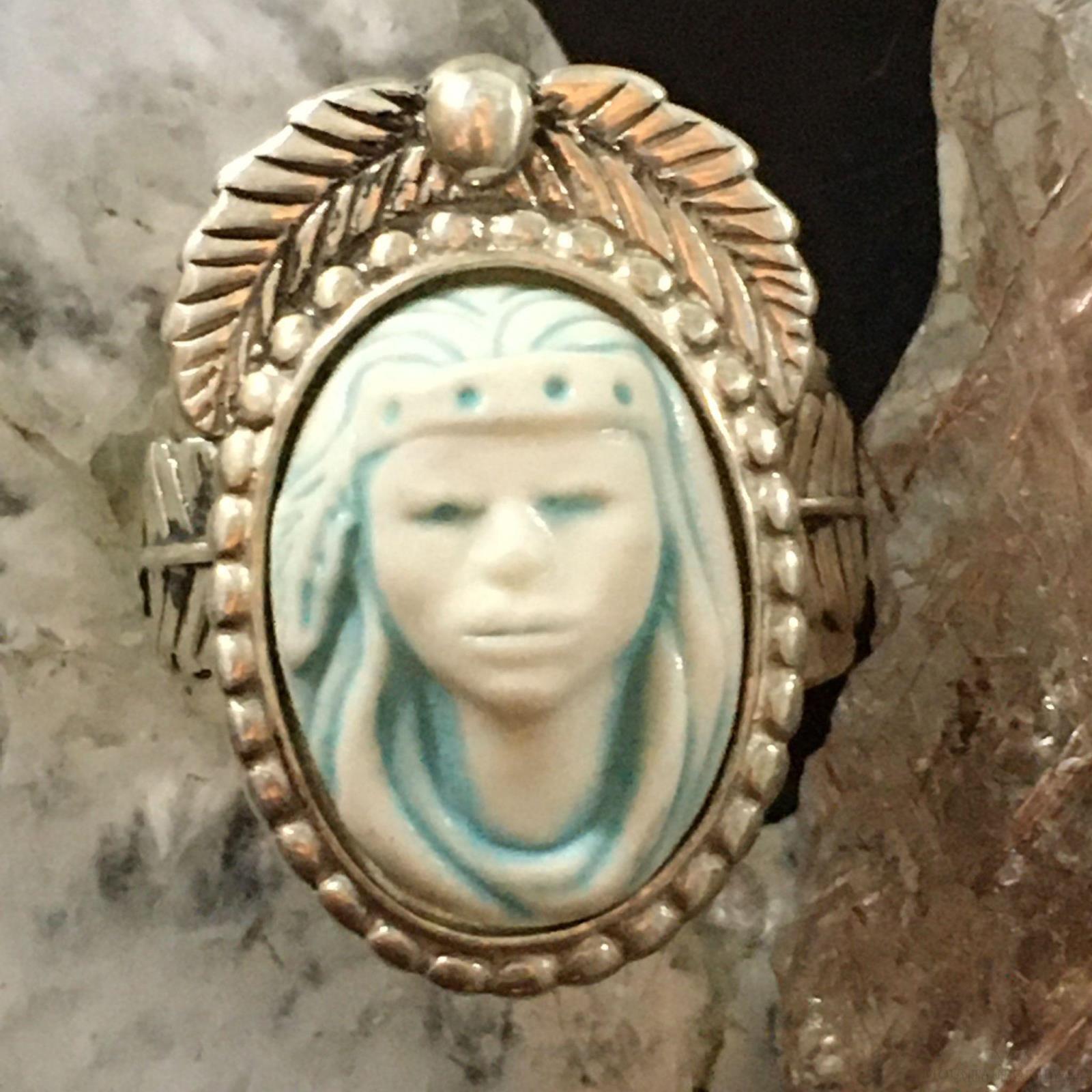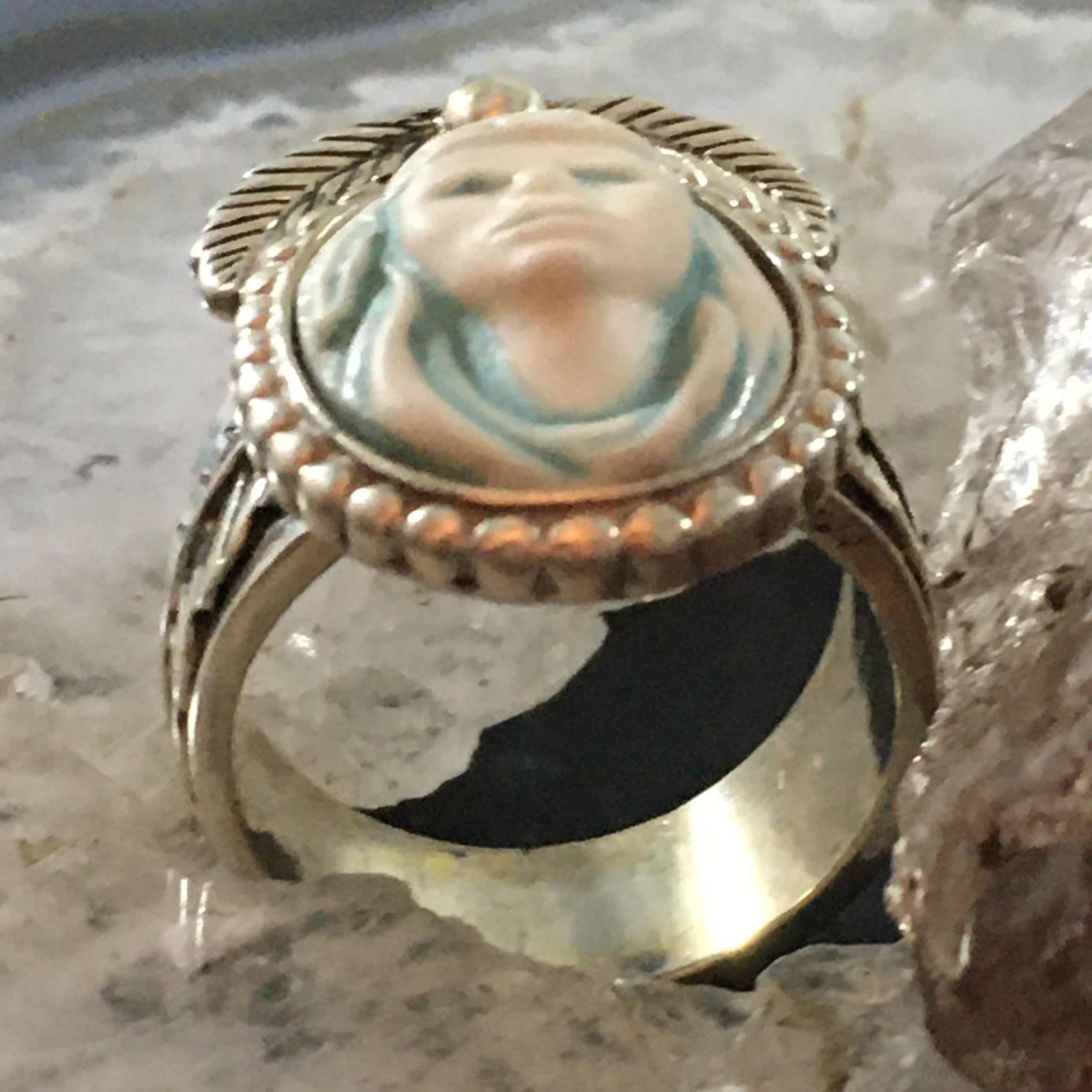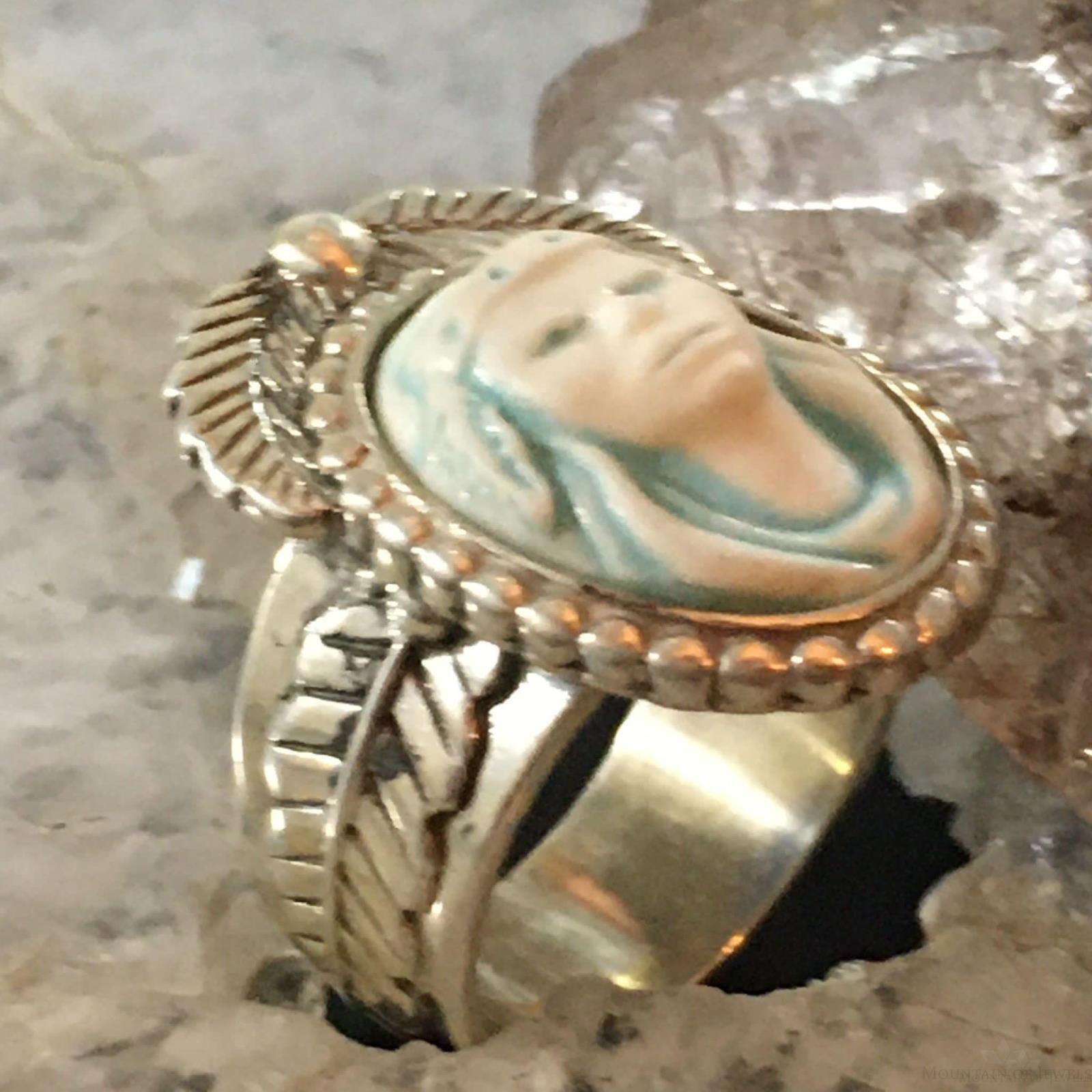 Intricately Beautiful Carolyn Pollack Vintage Southwestern Style Sterling Silver Porcelain Maiden Cameo Decorated Ring For Women.
