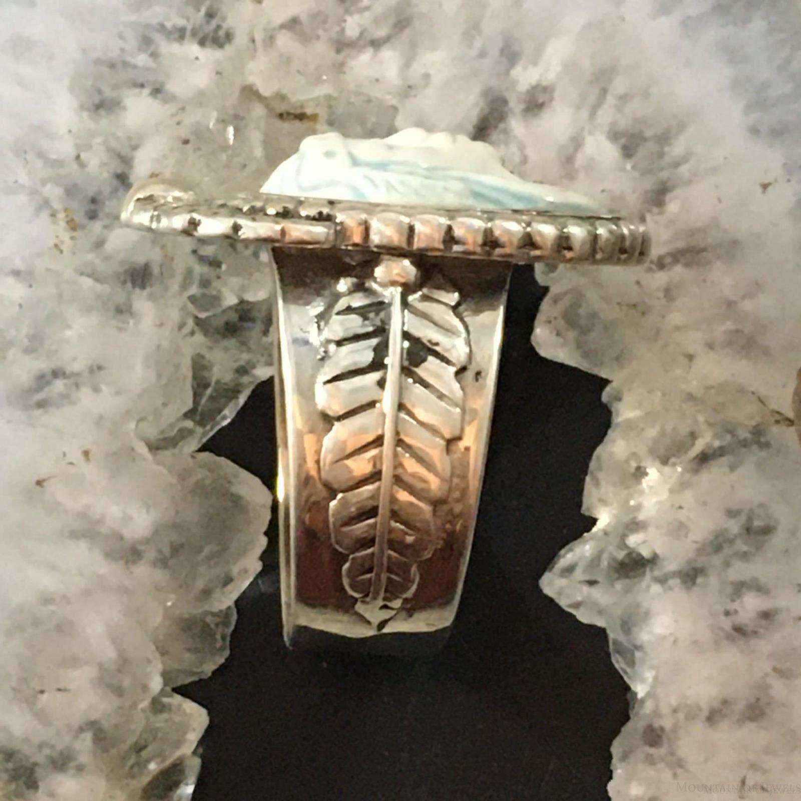 An Absolutely Stunning White Porcelain Cameo of A Native American Maiden With Blue Highlights Stands Out Amid a Smooth Bezel With Sterling Silver Beads and Detailed Engraved Leaves. The Shank Features Engraved Leaves, as well. This Design Has an Oxidized Finish With Beautiful Polished Accents.