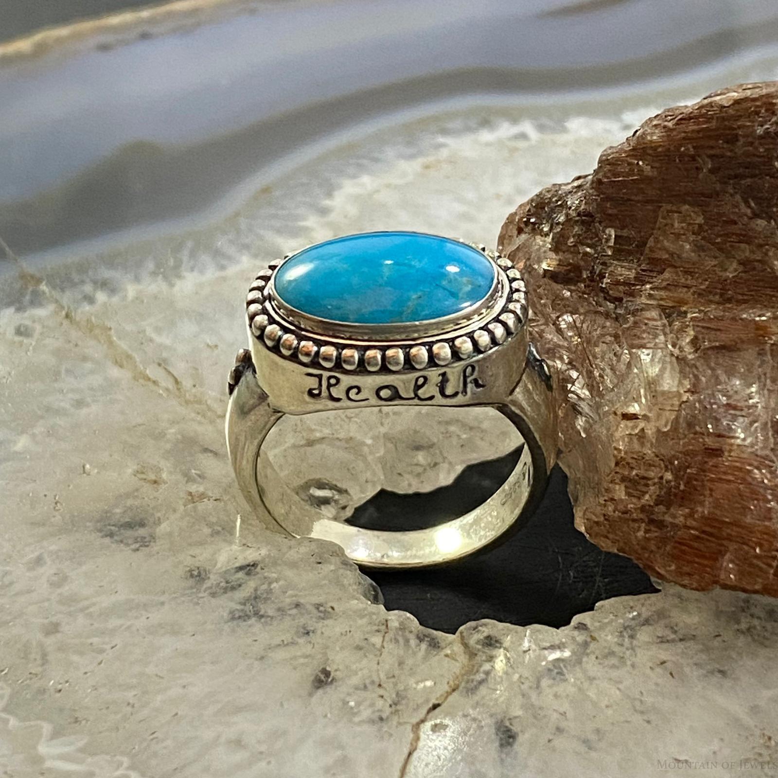 A Beautiful Stone is Set in a Smooth Bezel Framed by Sterling Silver Bead Work and the Word "Health" is Delicately Engraved Beneath the Length of the Cabochon. This Design Has an Oxidized Finish With Beautiful Polished Accents.