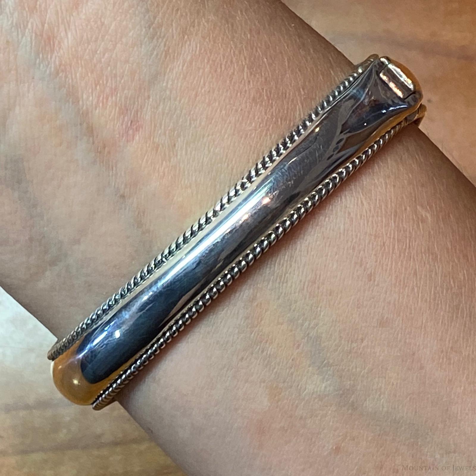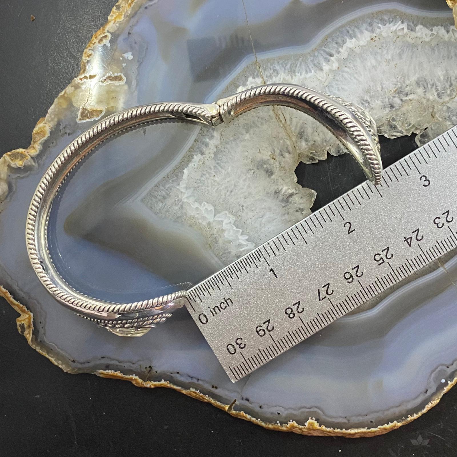 Each Stone is Set in a Smooth Bezel With Curled Prongs Surrounded by Ropes. Its Hinge Closure Makes it Easy to Put on and Take Off. This Design Has an Oxidized Finish With Beautiful Polished Accents.