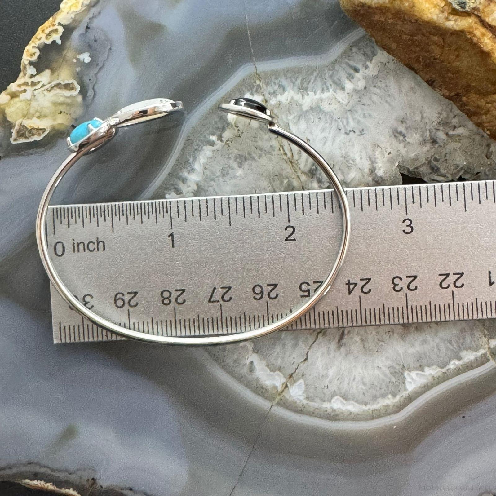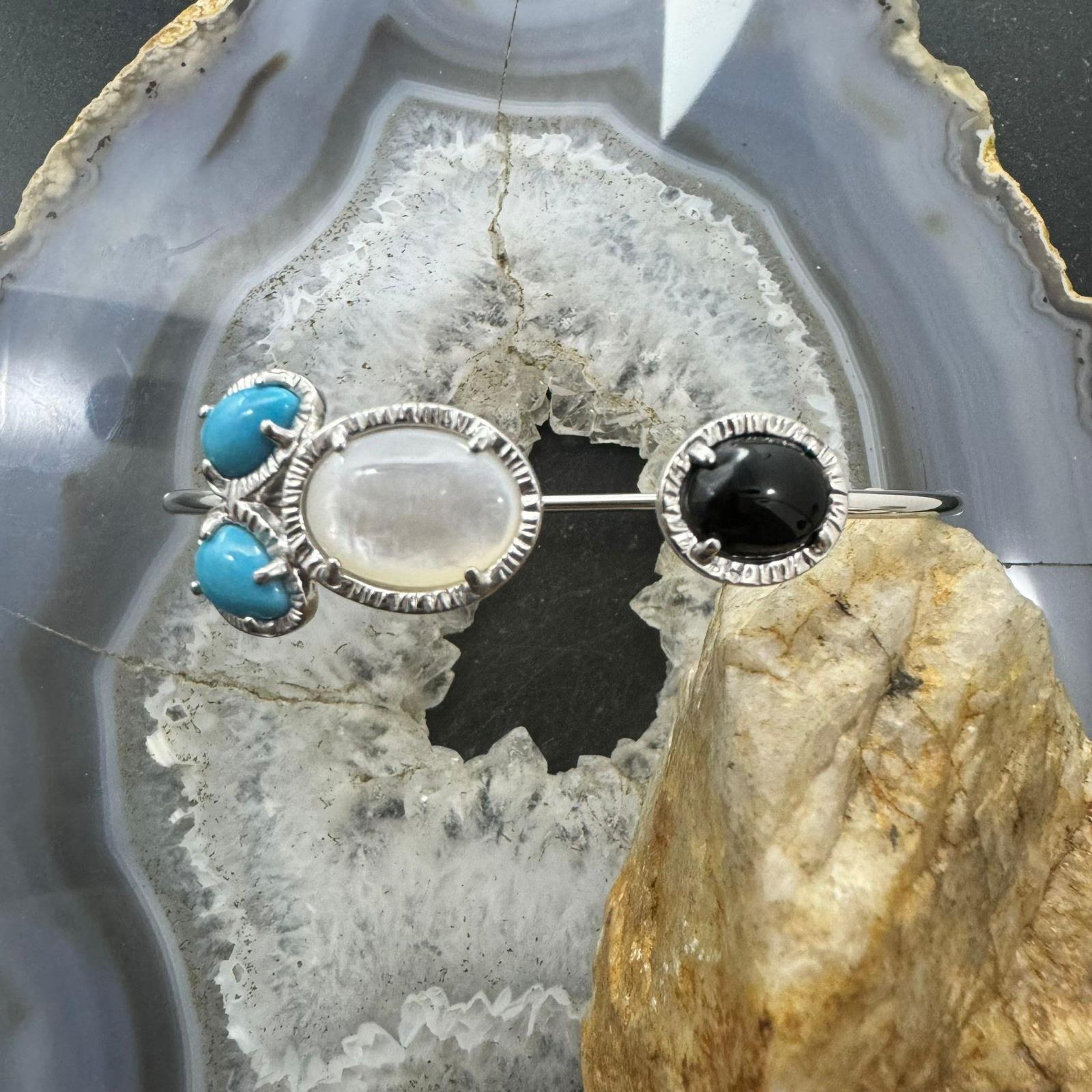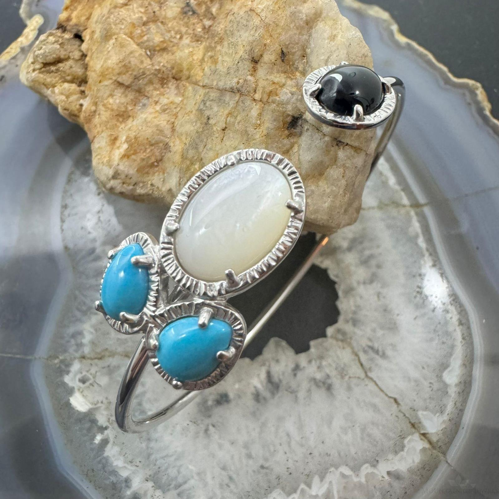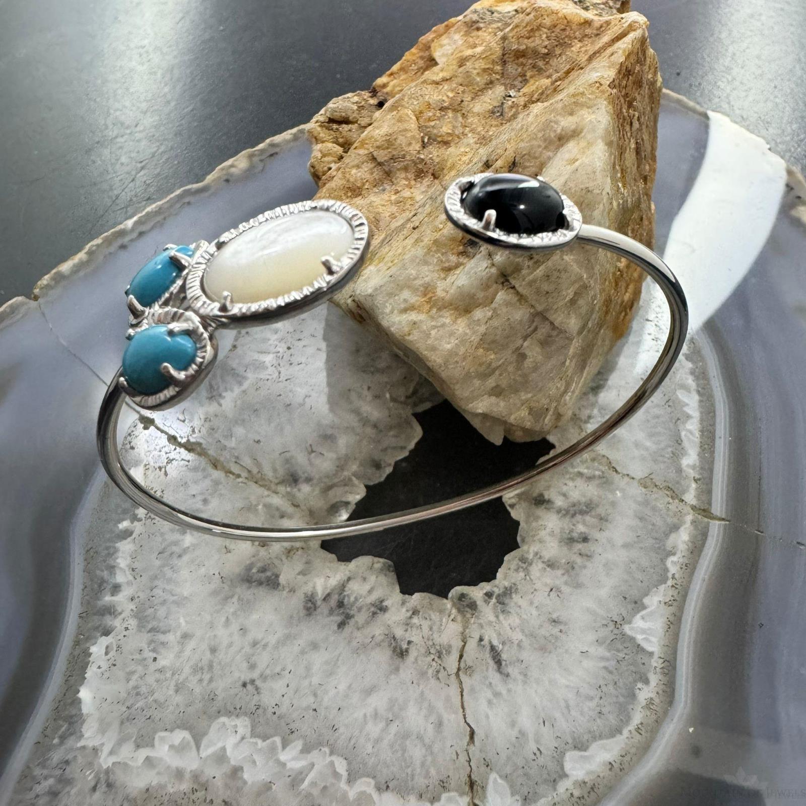 Carolyn Pollack Sterling Silver 2 Pear Turquoise, 1 Oval Mother of Pearl and 1 Oval Onyx Flexible Decorated Thin Floating Bracelet For Women.