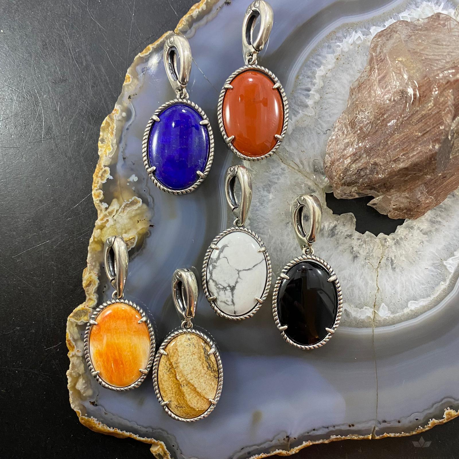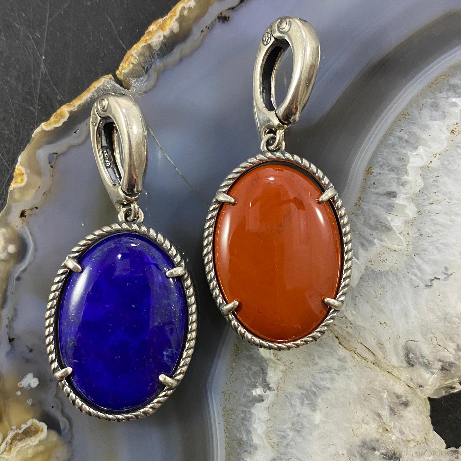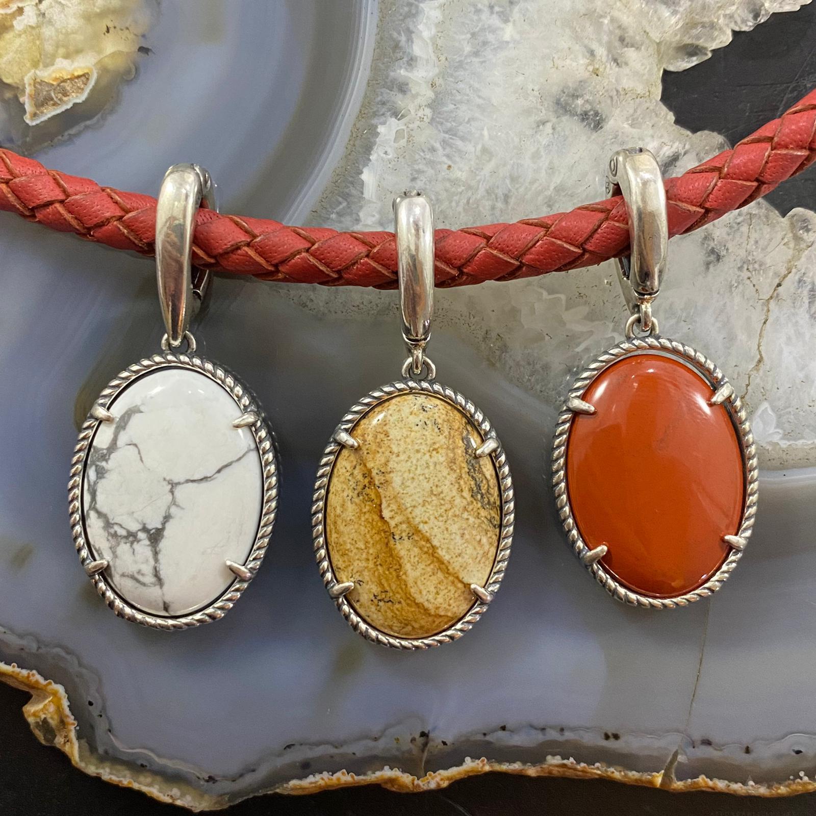 These Incredible Pieces Offer Endless Ways to Wear Them. Pictured Are Both Sides of a Single Pendant. The Cabochons Are Set With Prongs in a Rope Border. Set #1 is Lapis Lazuli and Red Jasper. Set #2 is Black Agate and Howlite. Set #3 is Orange Spiny Oyster and Picture Jasper. The Snap Hinge Allows You To Wear This On a Variety of Chains, Leather Cords or, as Shown, a Braided Leather Necklace. This Design Has an Oxidized Finish With Beautiful Polished Accents.