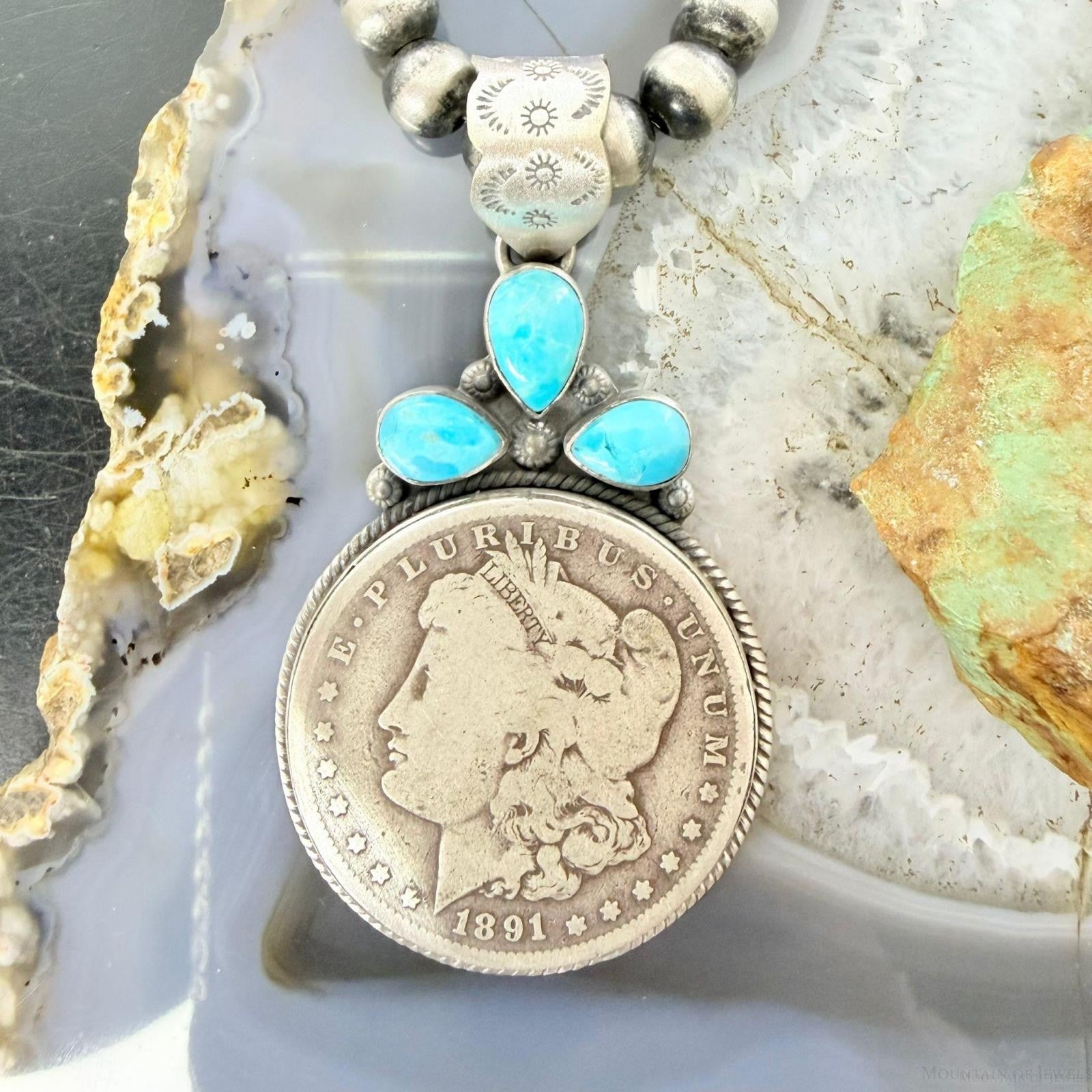 Genuine 1891 90% Silver Morgan Dollar Coin Teardrop Turquoise Decorated Pendant